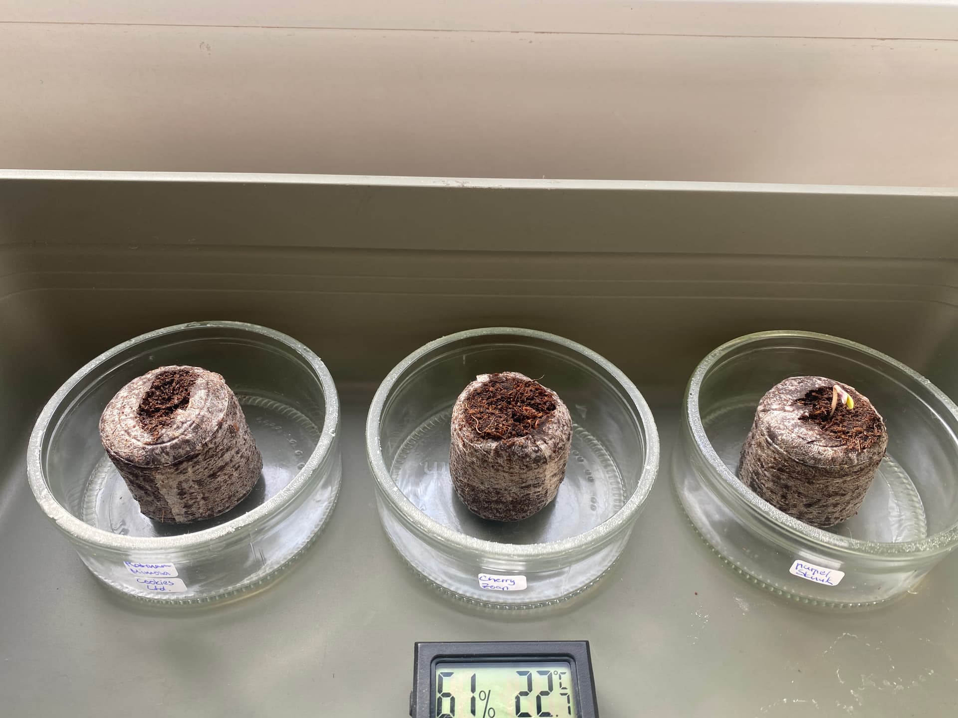 Dann hieß es: ab in die Jiffy´s, wo die Samen die nächsten zwei bis drei Tage verweilen sollten. Tatsächlich ließ sich die Purple Skunk keine 24 Stunden Zeit, um mit ihrem Keimstängel das Licht der Welt zu erblicken. Die Mimosa Cookies und Cherry Zoap hingegen feierten ihre kleine „Undergroundparty“ noch einen Tag länger, bevor auch sie beschlossen, sich zu zeigen.