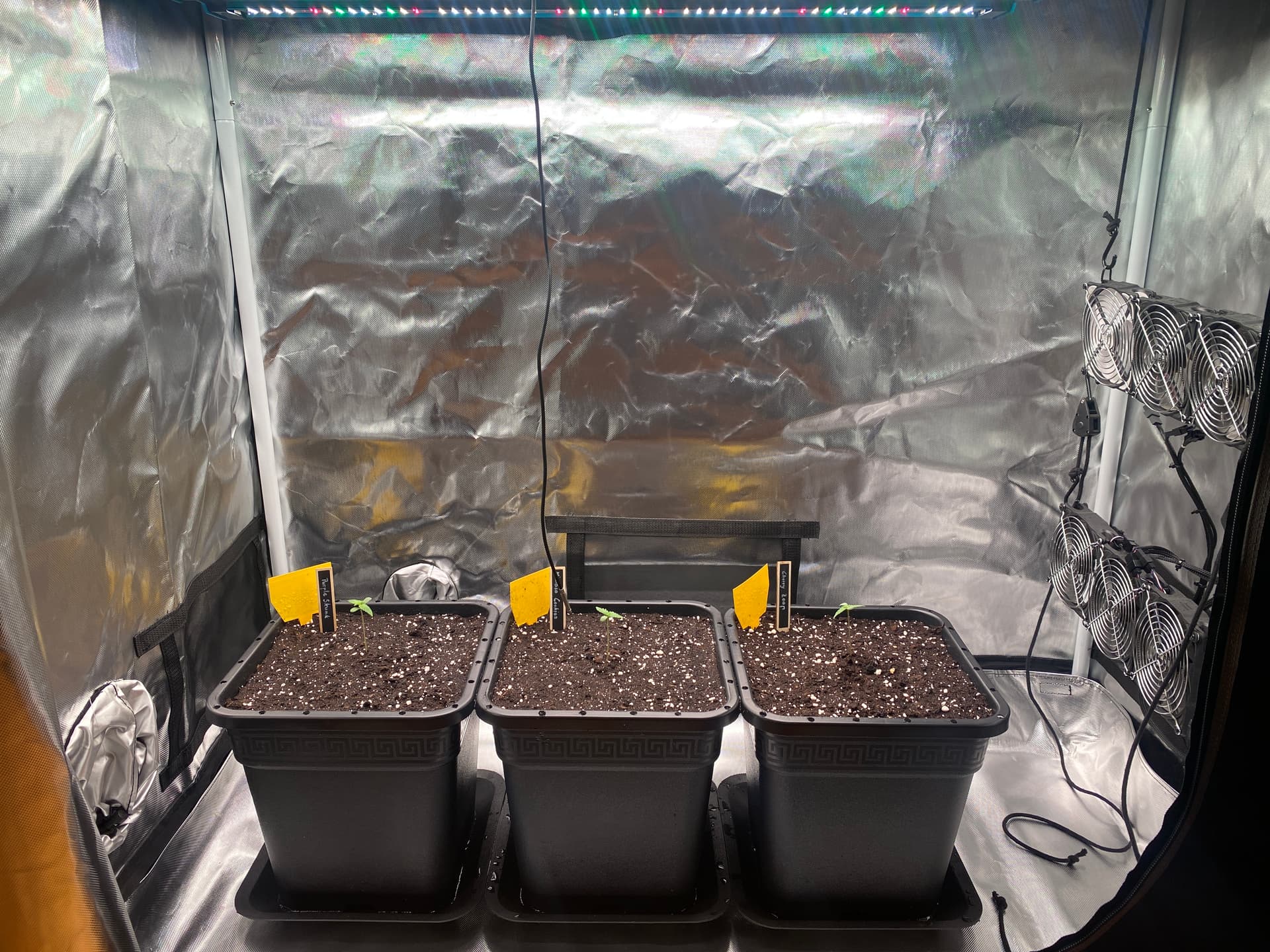 Gestern, am 9. Oktober, zogen die drei Ladies dann in ihre Endtöpfe um. Diese hatte ich bereits am Vortag liebevoll vorbereitet, also komplett gefüllt und angegossen. Nun dürfen die Pflanzen bei ungefähr 15 DLI die nächsten ein bis zwei Wochen entspannt wachsen, bevor es Zeit für ein bisschen LST (Low Stress Training) wird.