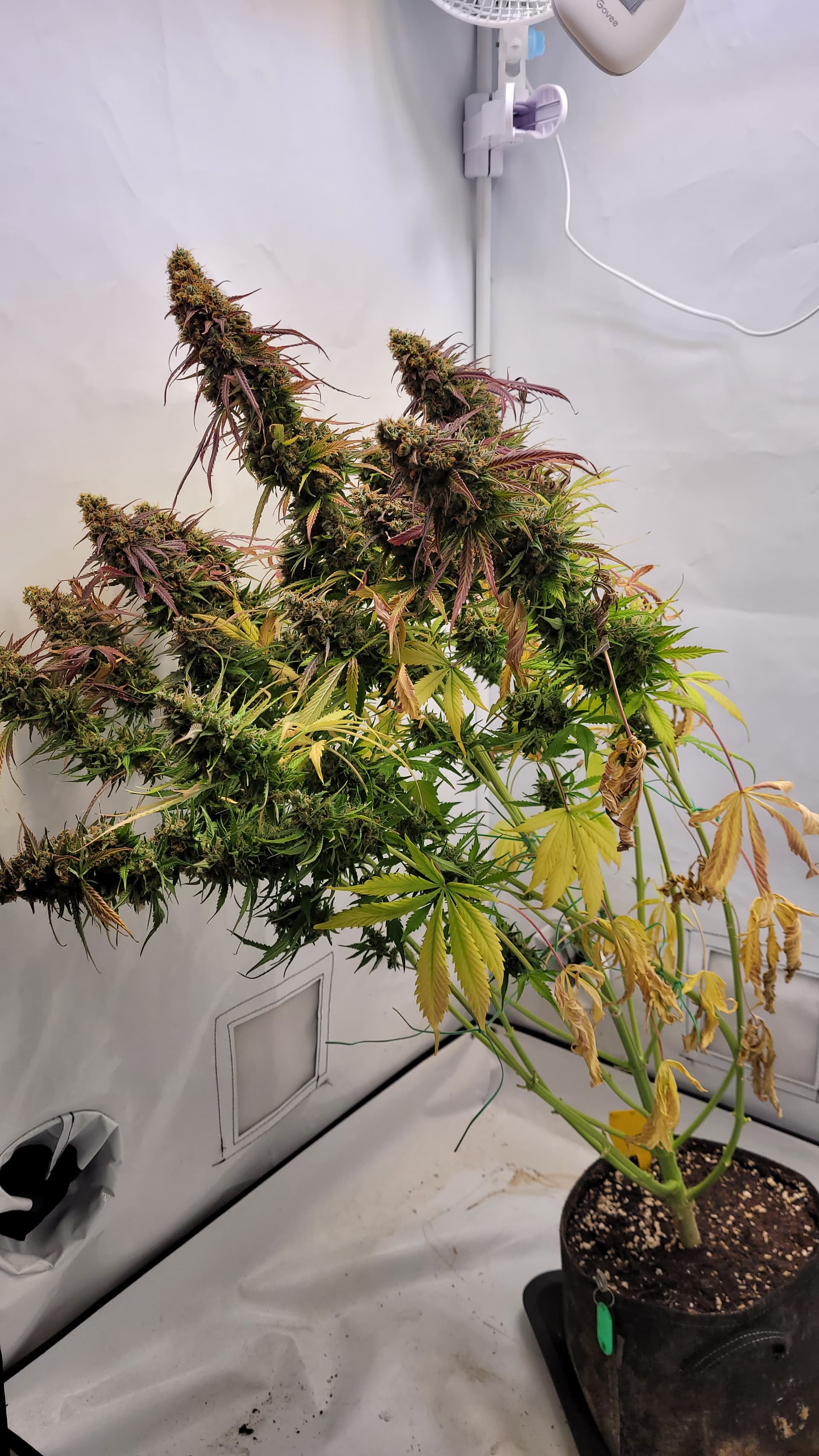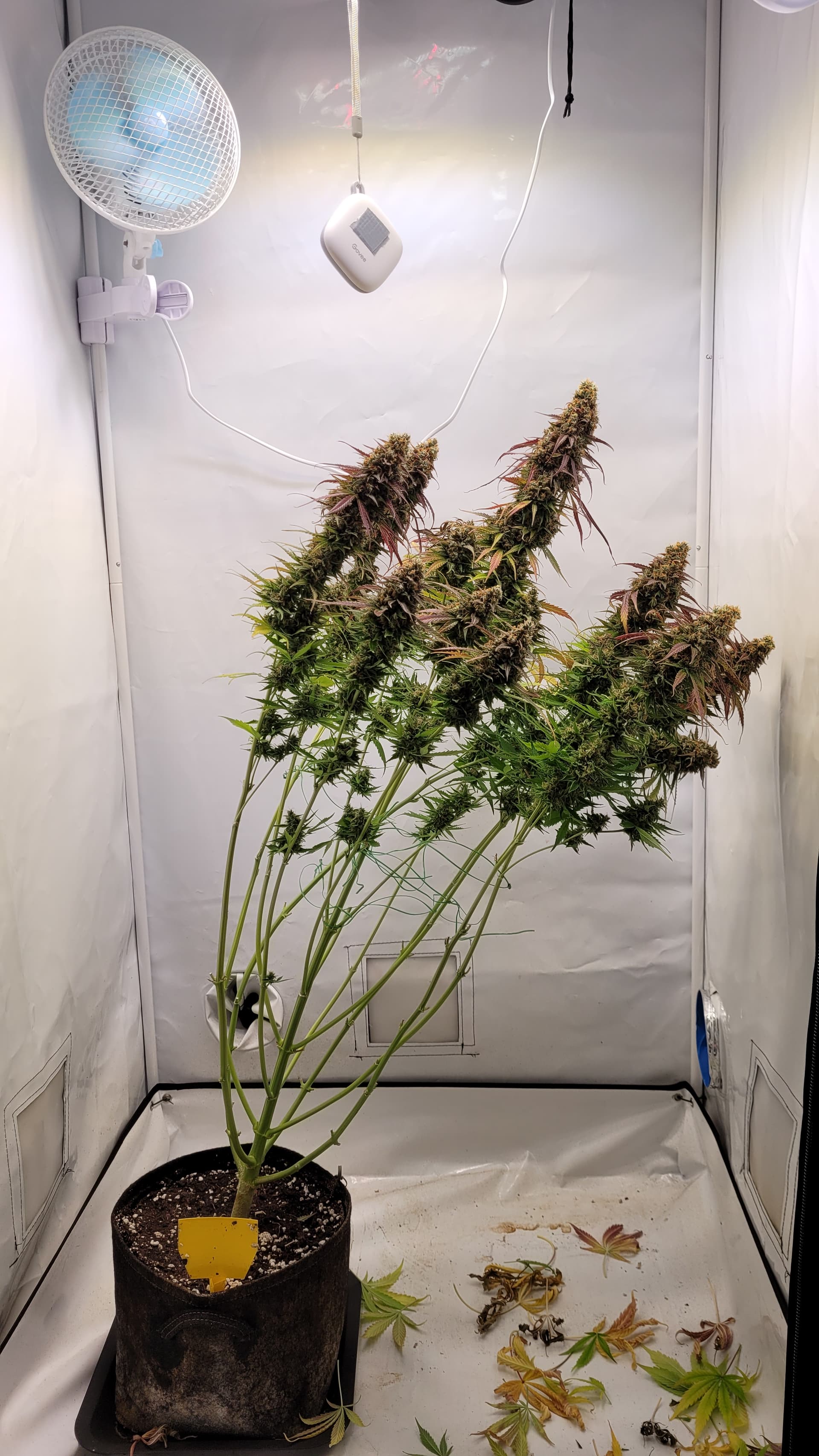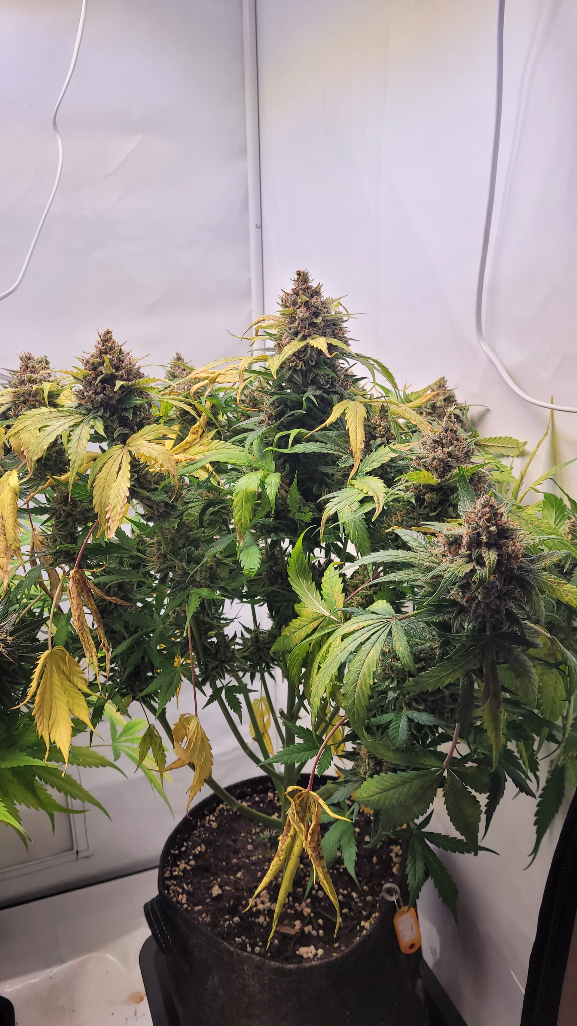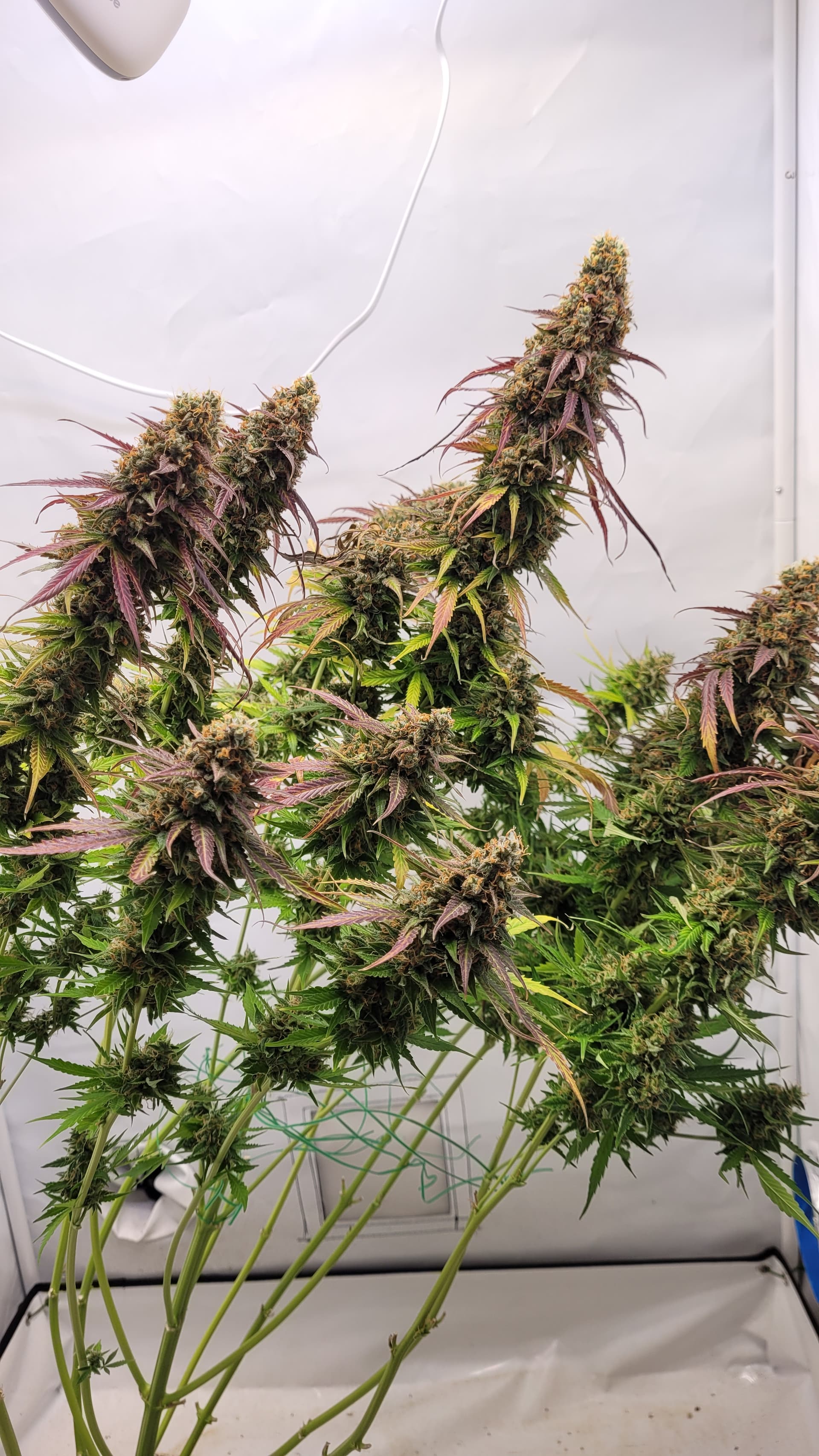 steht jetzt allein. Ich glaube, dass ich tatsächlich Potential liegen lassen habe mit dem absetzen vom Dünger. Da hätte ich sicher noch 1-2 Wochen gehen können. Gut für die Erfahrung, schlecht fürs Ergebnis? Aber mal sehen, was am ende bei raus kommt. Ich musste auch einige Triebe mit Draht stützen, da diese sonst abknicken würden.