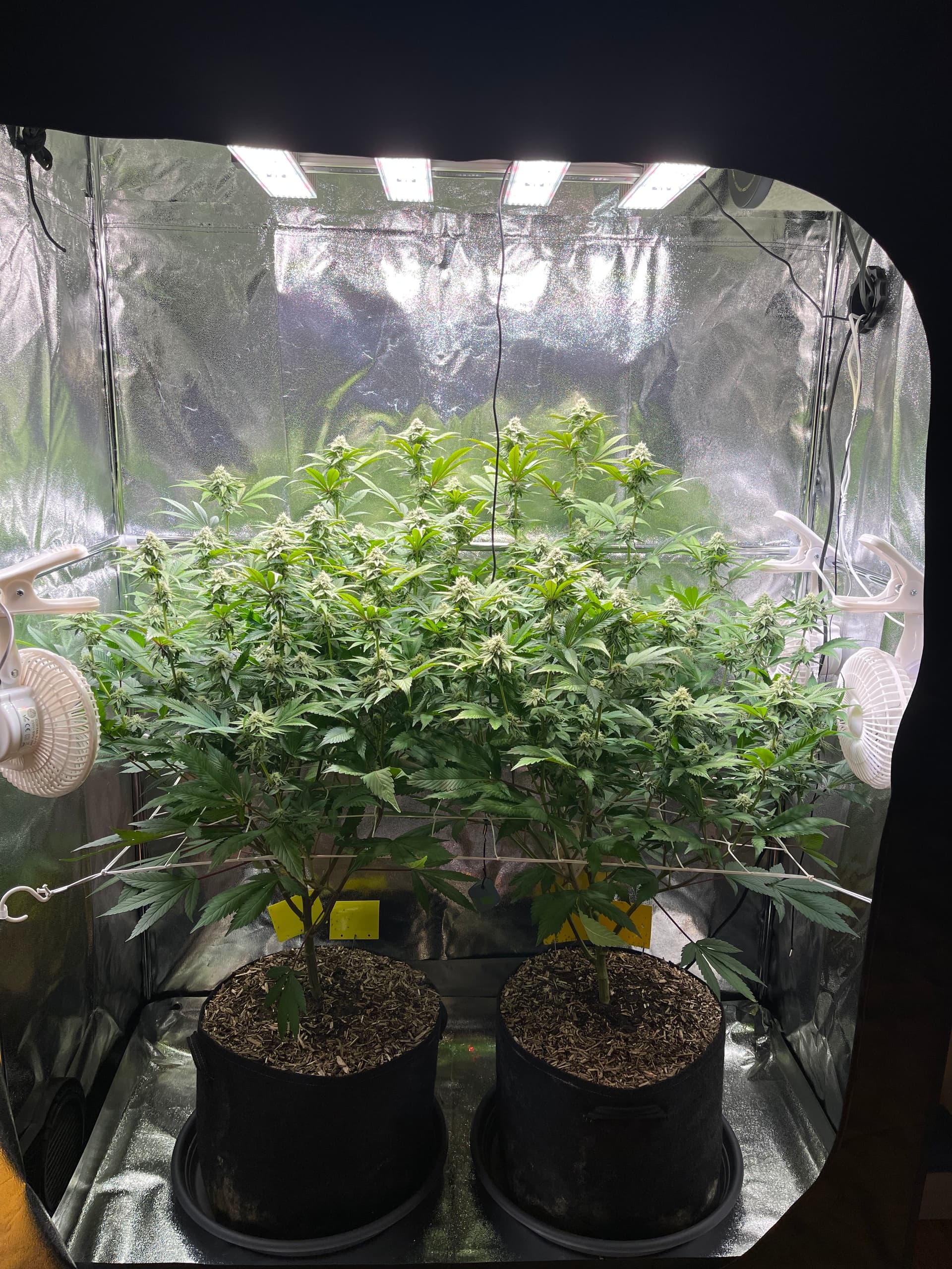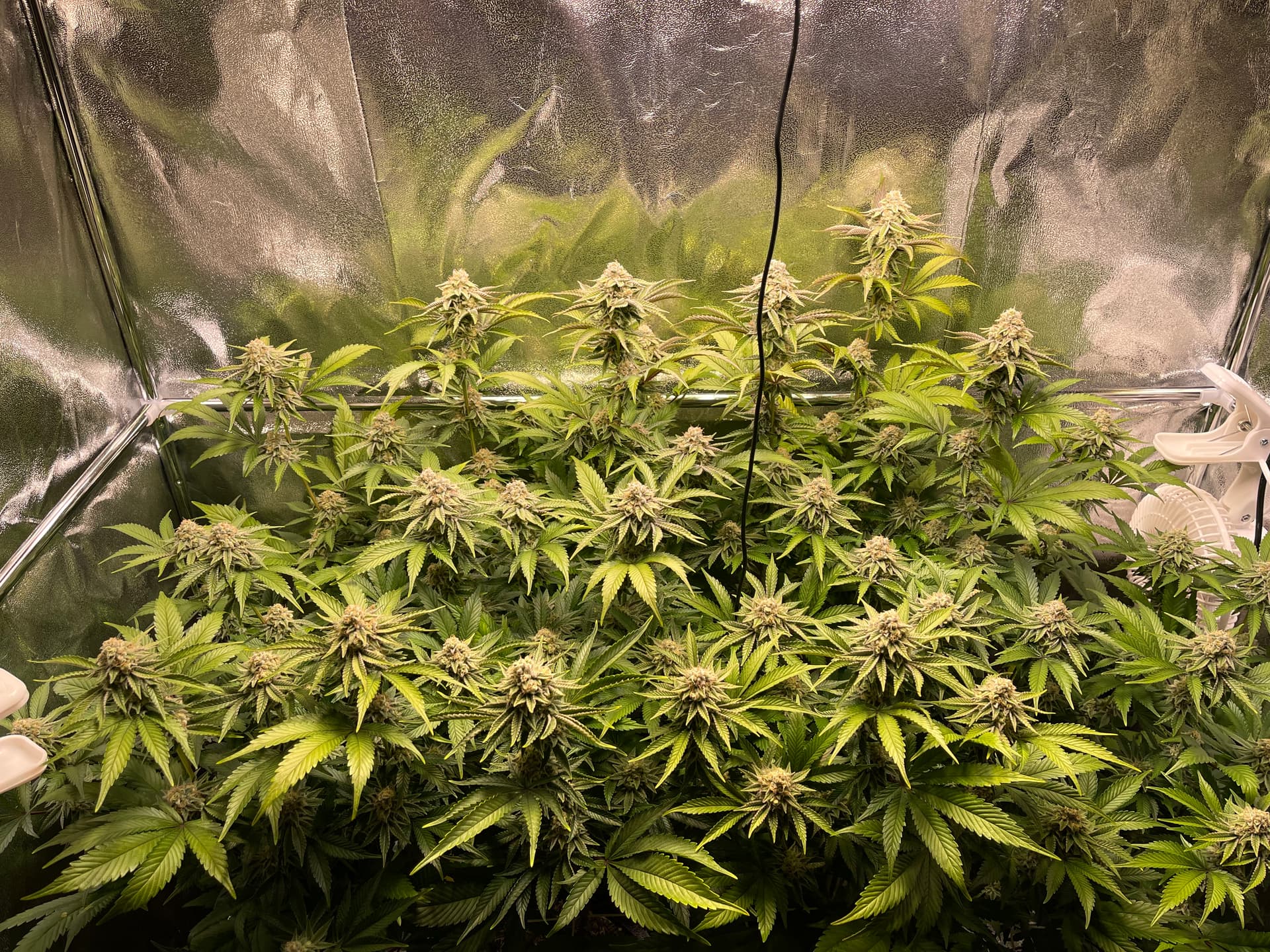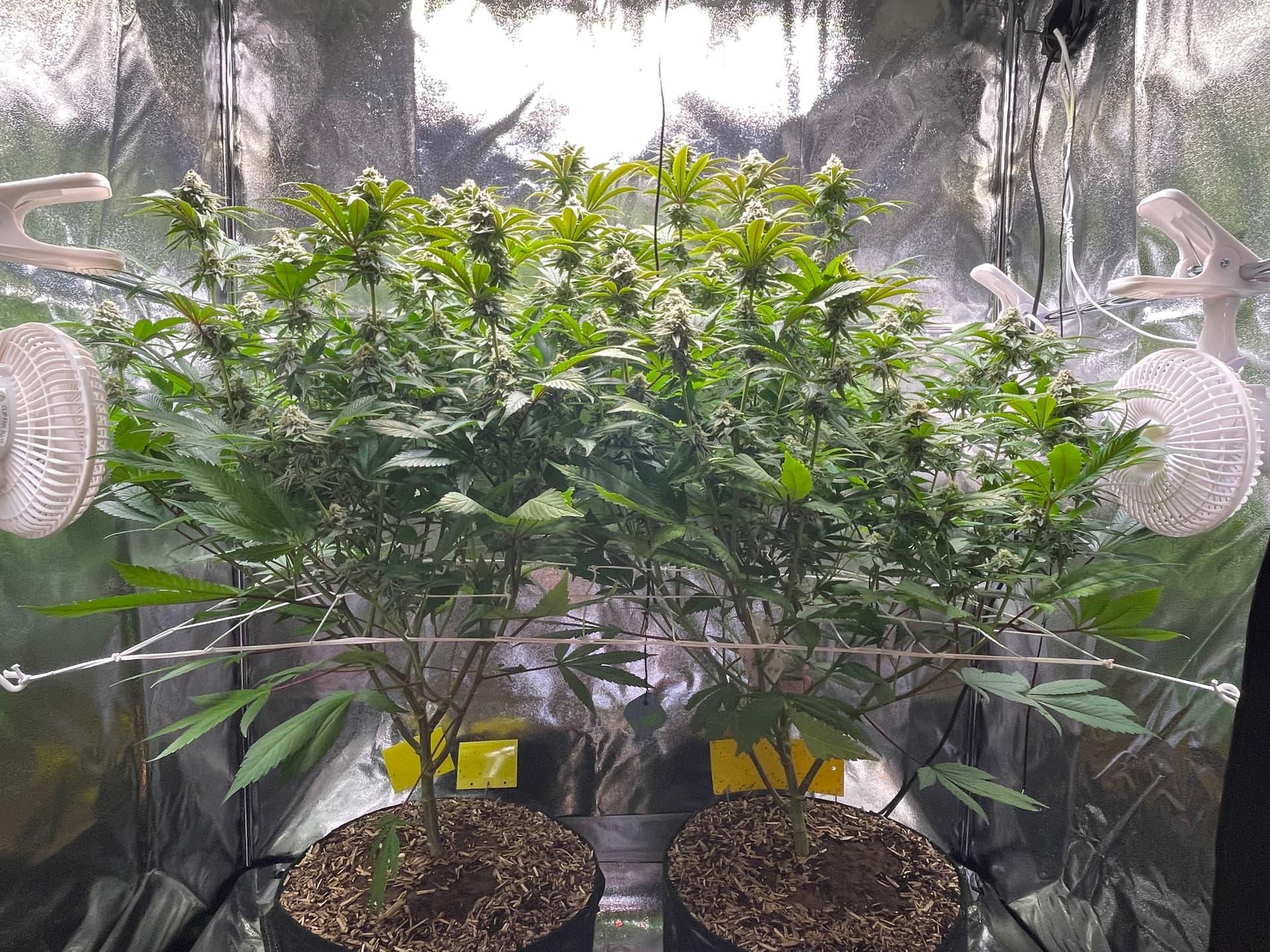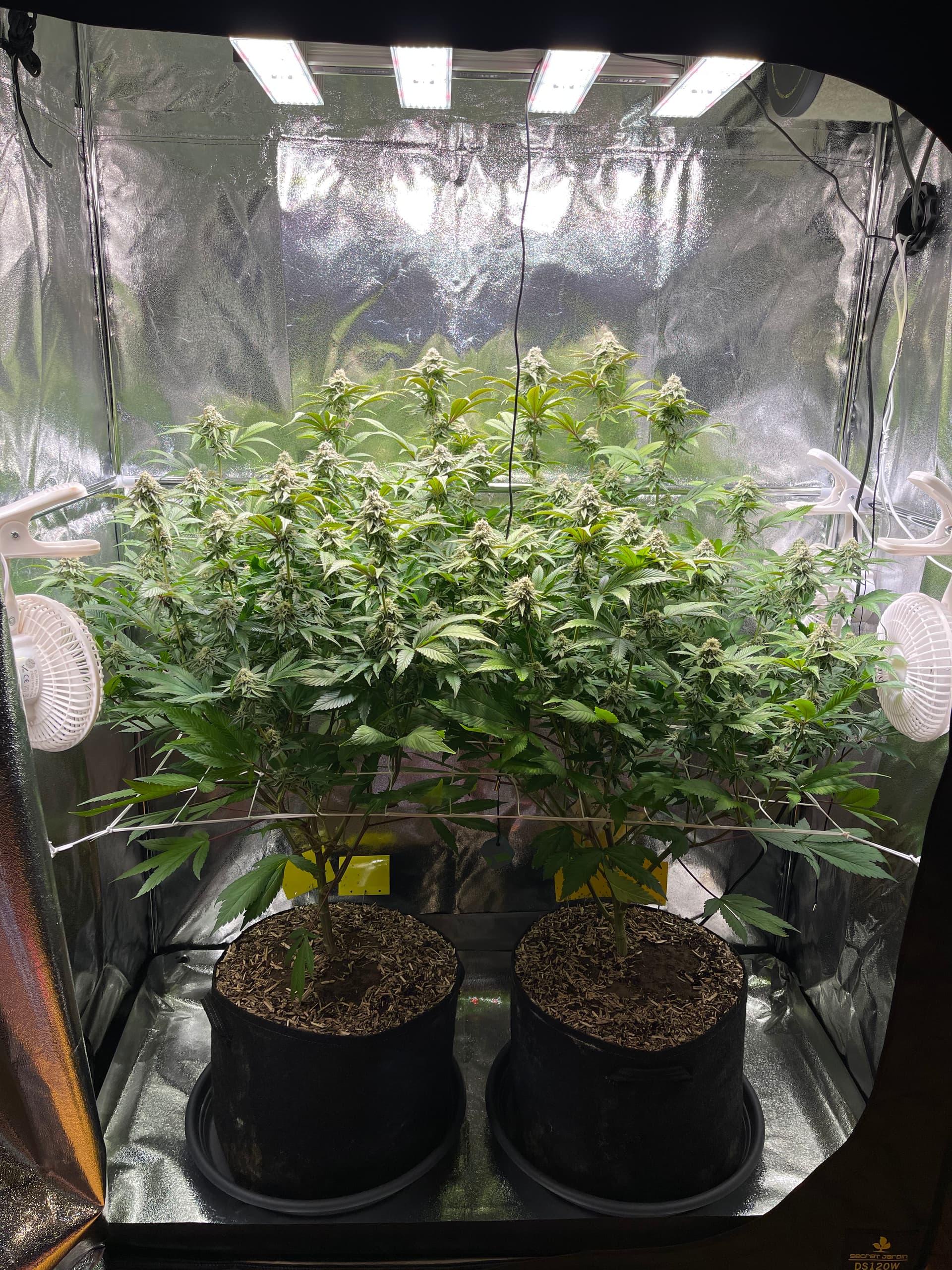 Einen 3ten Clipventilator hab ich noch auf der linken Seite befestigt und hoffe es reicht aus damit es keinen Schimmel an den Buds gibt. Hier wurde jeden zweiten Tag 1,5-2 liter gegossen, ca. 1ml/l CalMag 1ml/l Melasse und EM. Vielleicht werde ich nochmal extra mit Bittersalz gießen bevor die LED auf 100% gestellt wird. Habe jetzt mehrfach beobachtet das Mag beim erhöhen der LED immer etwas zu knapp kam.