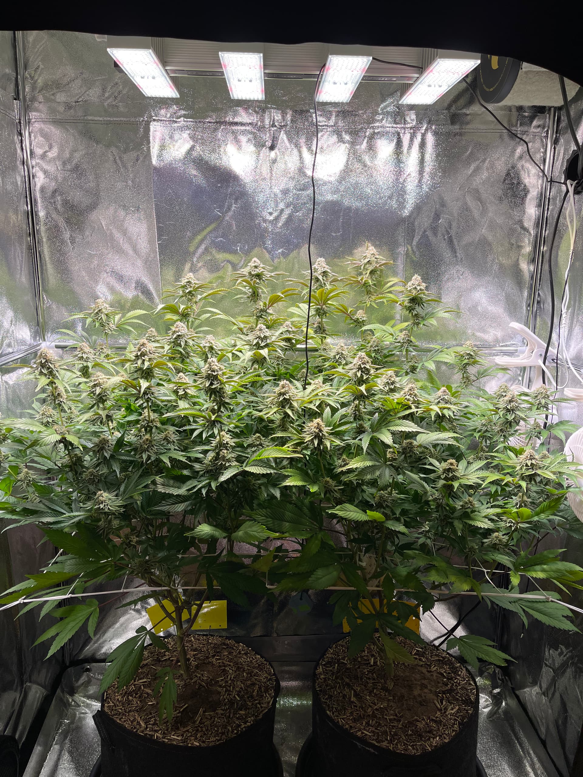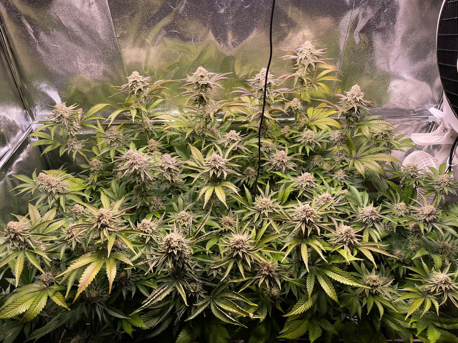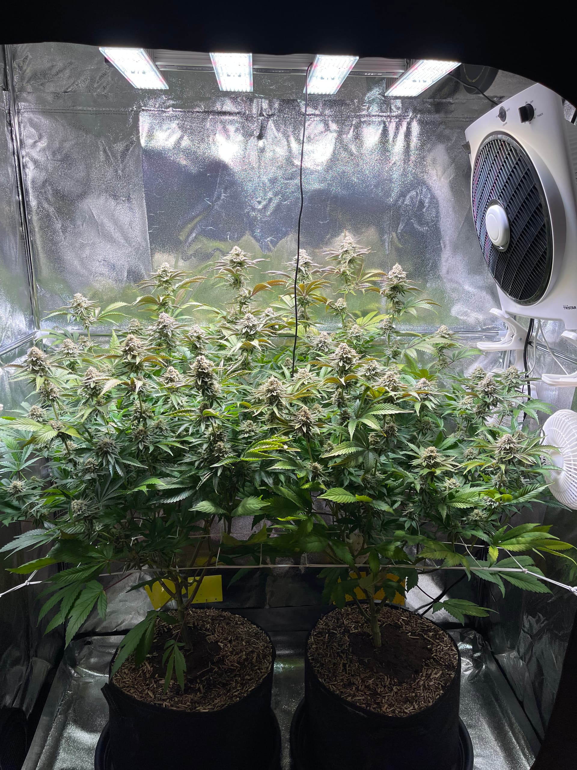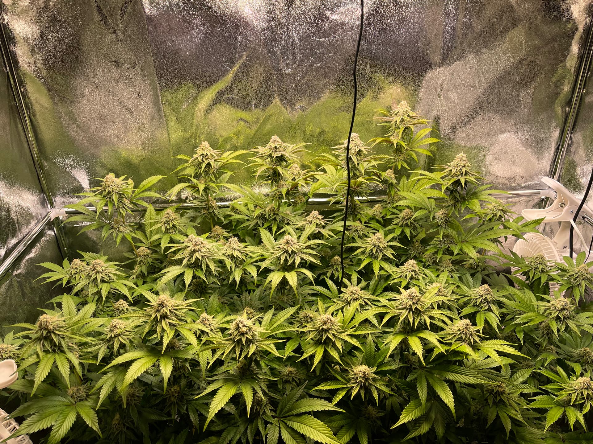 Einen 3ten Clipventilator hab ich noch auf der linken Seite befestigt und hoffe es reicht aus damit es keinen Schimmel an den Buds gibt. Hier wurde jeden zweiten Tag 1,5-2 liter gegossen, ca. 1ml/l CalMag 1ml/l Melasse und EM. Vielleicht werde ich nochmal extra mit Bittersalz gießen bevor die LED auf 100% gestellt wird. Habe jetzt mehrfach beobachtet das Mag beim erhöhen der LED immer etwas zu knapp kam.