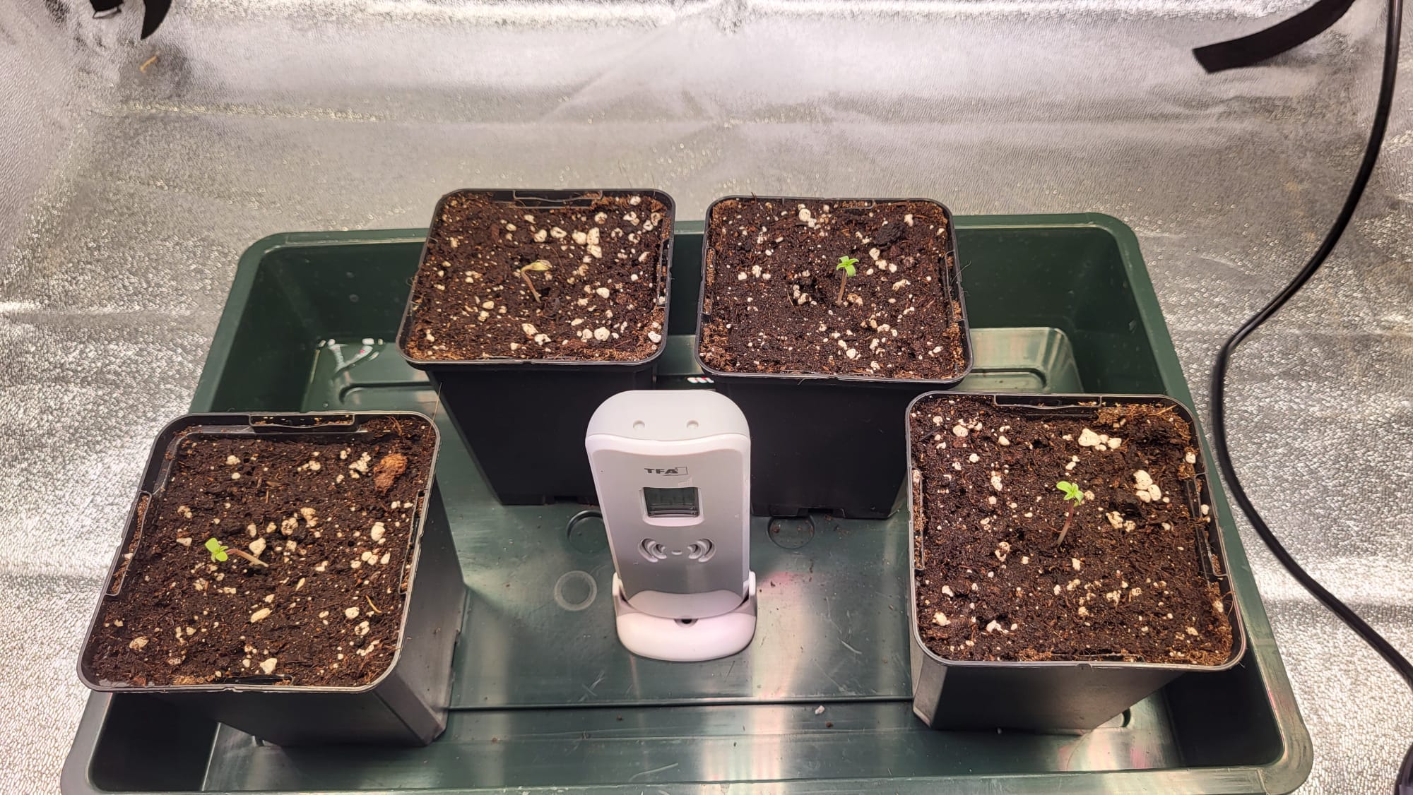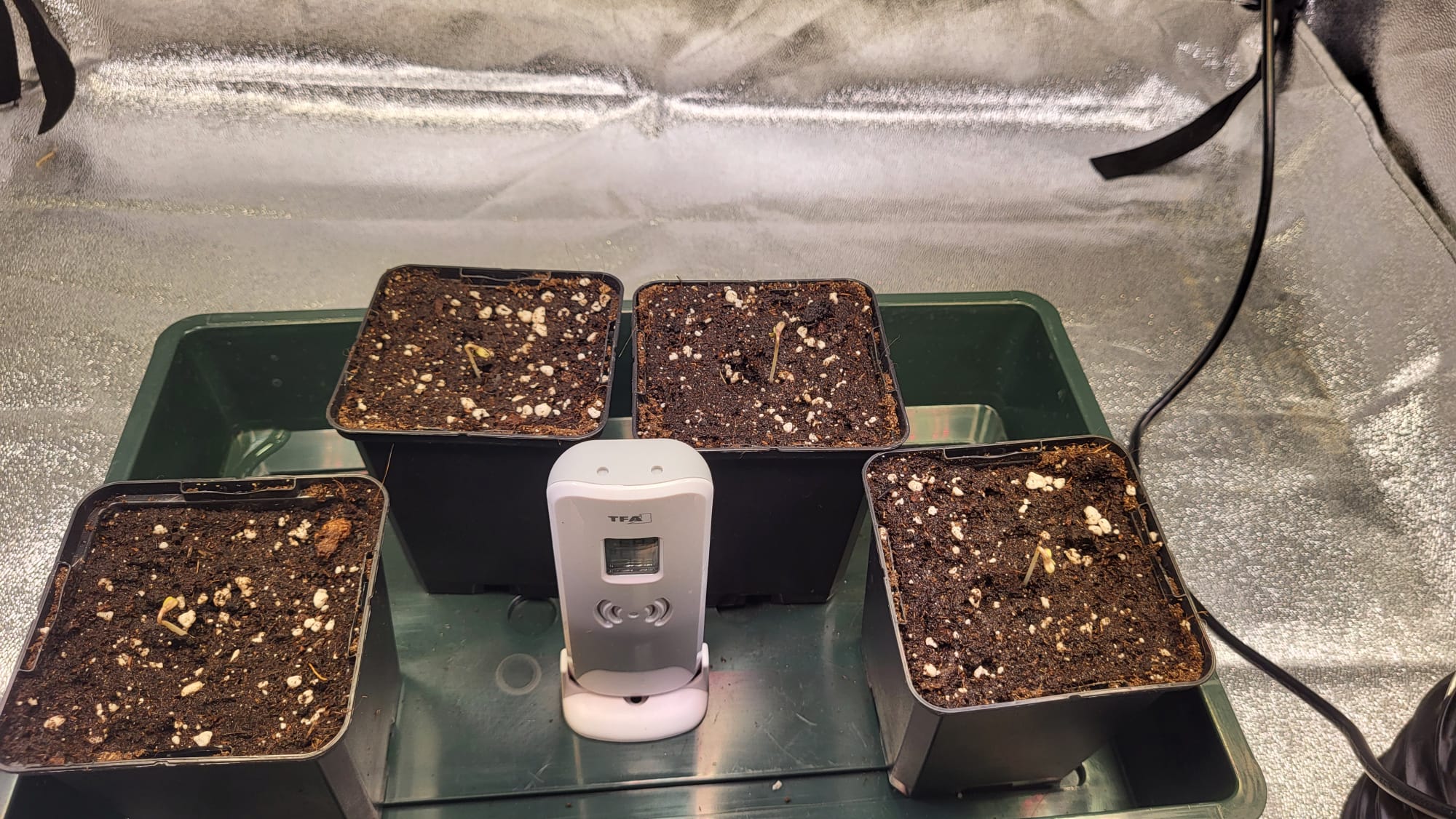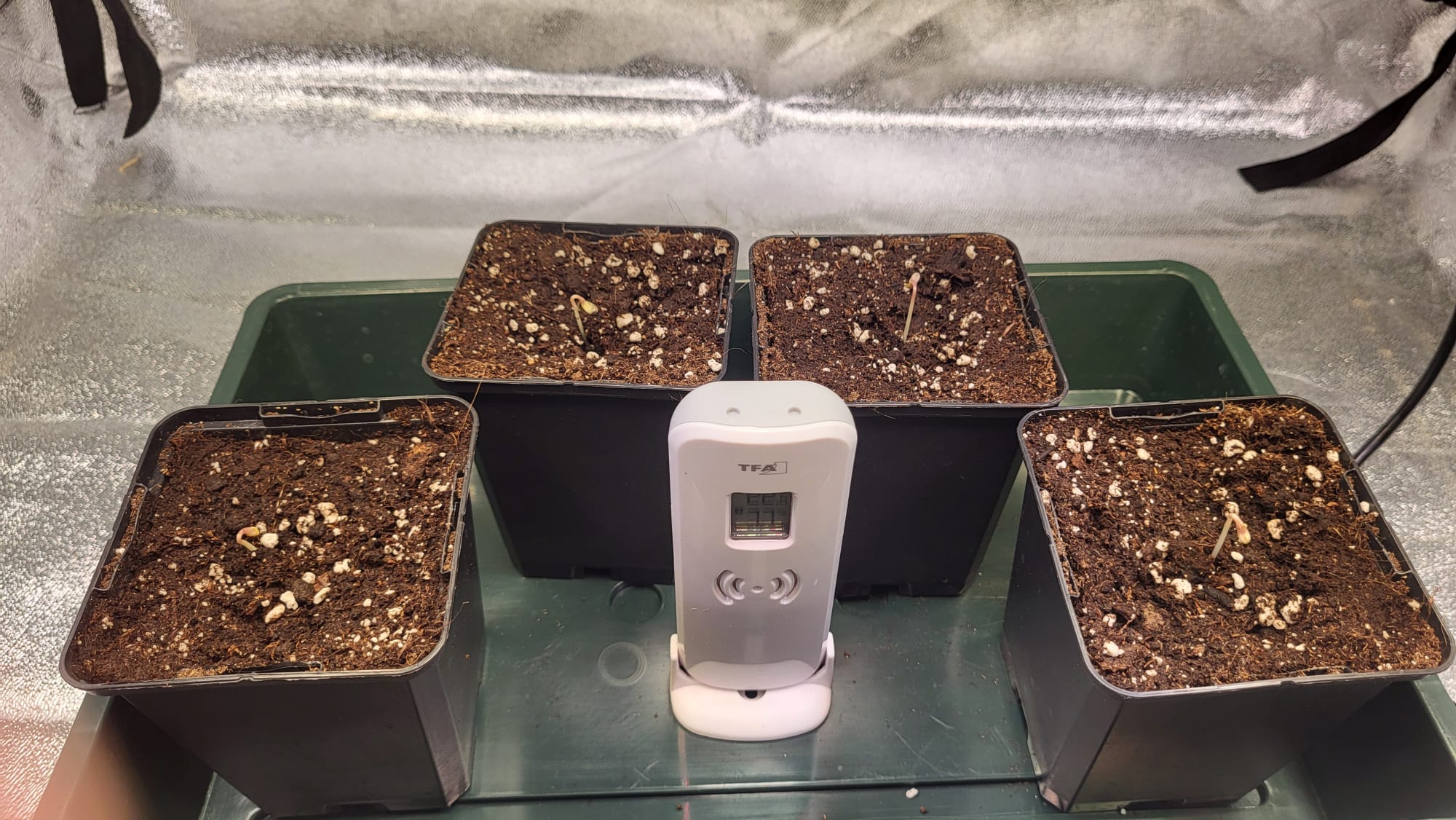 Am 05.08. sind die Samen nach dem akklimatisieren direkt aus der Packung in die 0,5 Liter Töpfe mit Light Mix und etwas Mykorrhiza gekommen. Die Töpfe standen im Mini Gewächshaus. Das Mini Gewächshaus stand im Grow Zelt. Ich mach das Zelt abends immer zu, um die Nacht zu simulieren. Gestern vorm Zelt zu machen, konnte ich nichts sehen, heute dann so:
