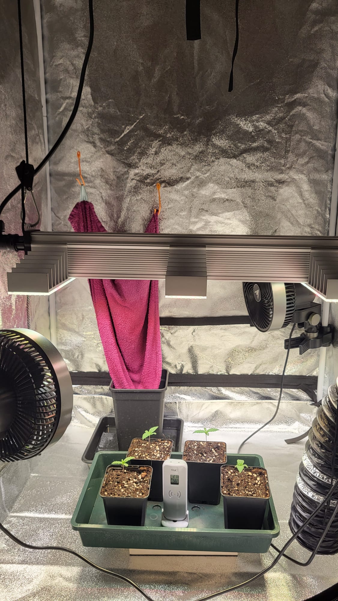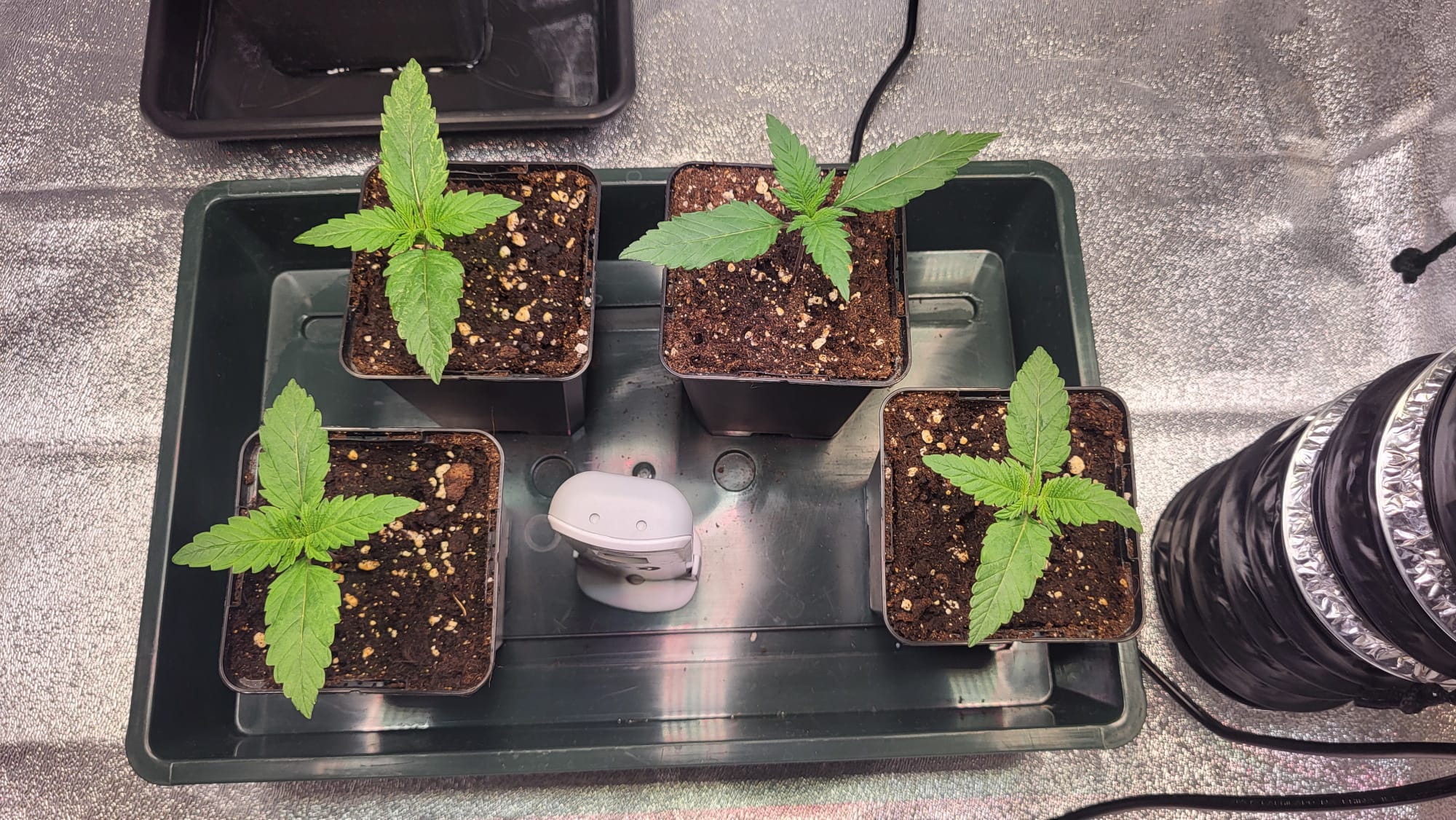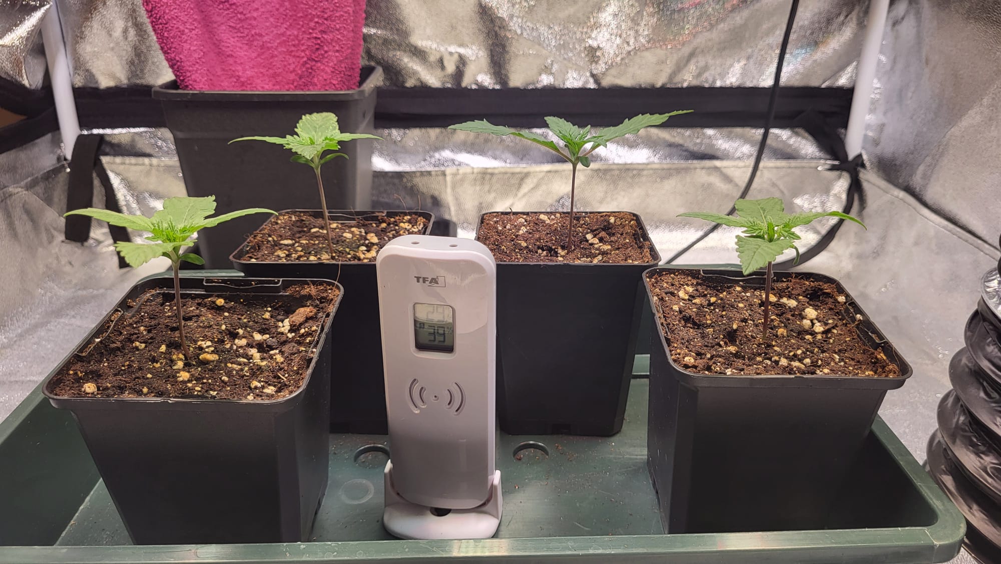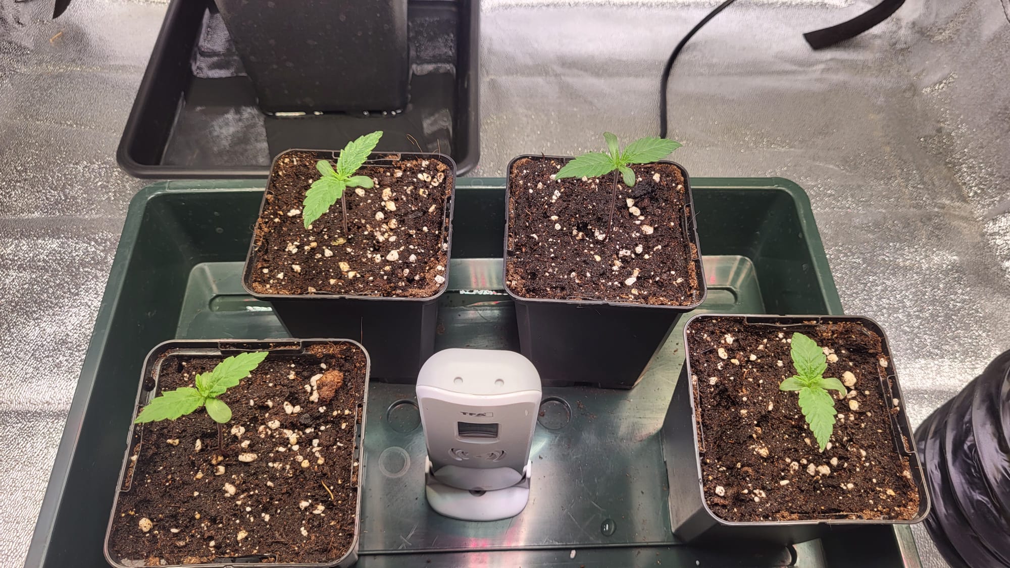 Am 05.08. sind die Samen nach dem akklimatisieren direkt aus der Packung in die 0,5 Liter Töpfe mit Light Mix und etwas Mykorrhiza gekommen. Die Töpfe standen im Mini Gewächshaus. Das Mini Gewächshaus stand im Grow Zelt. Ich mach das Zelt abends immer zu, um die Nacht zu simulieren. Gestern vorm Zelt zu machen, konnte ich nichts sehen, heute dann so: