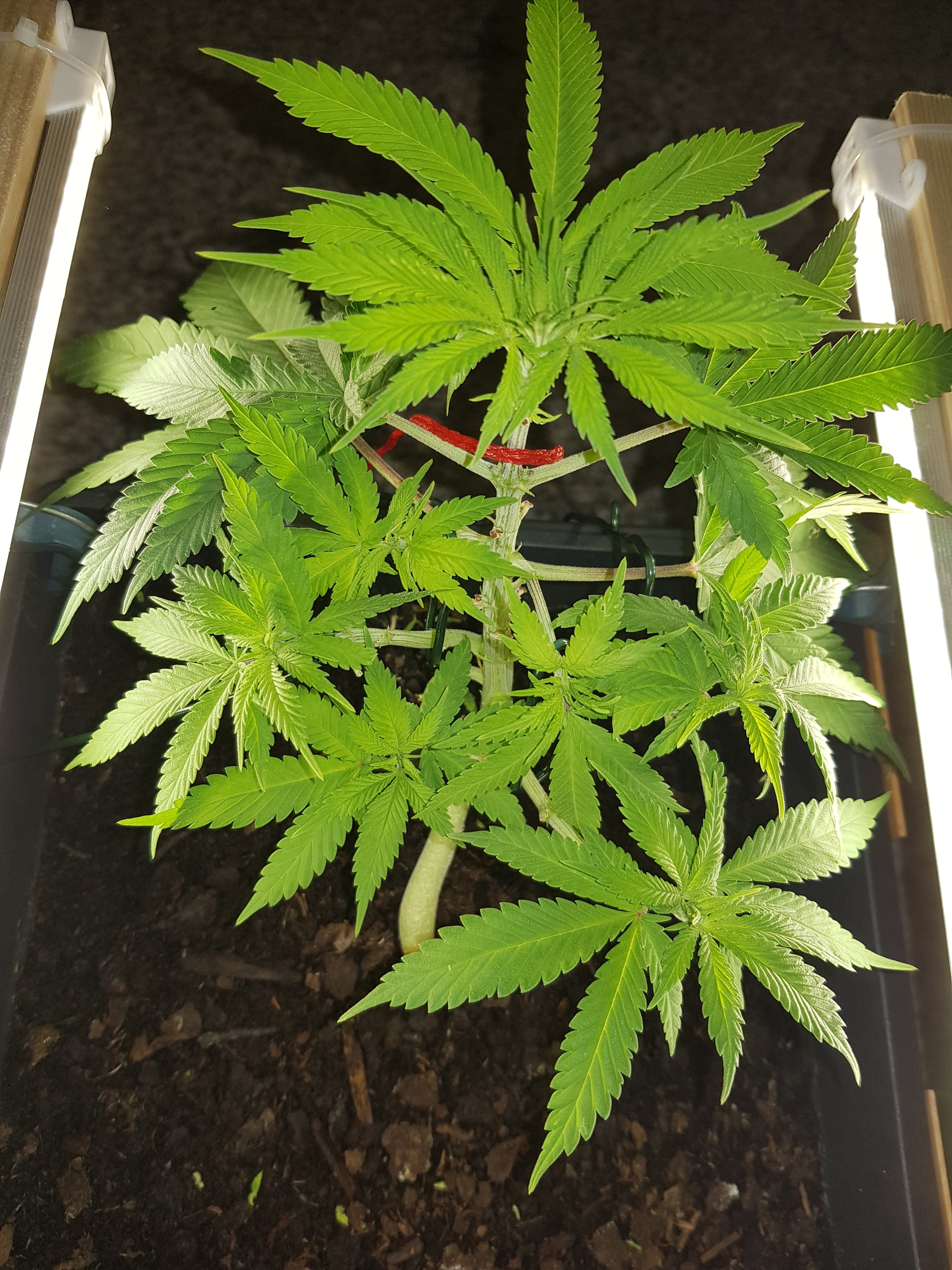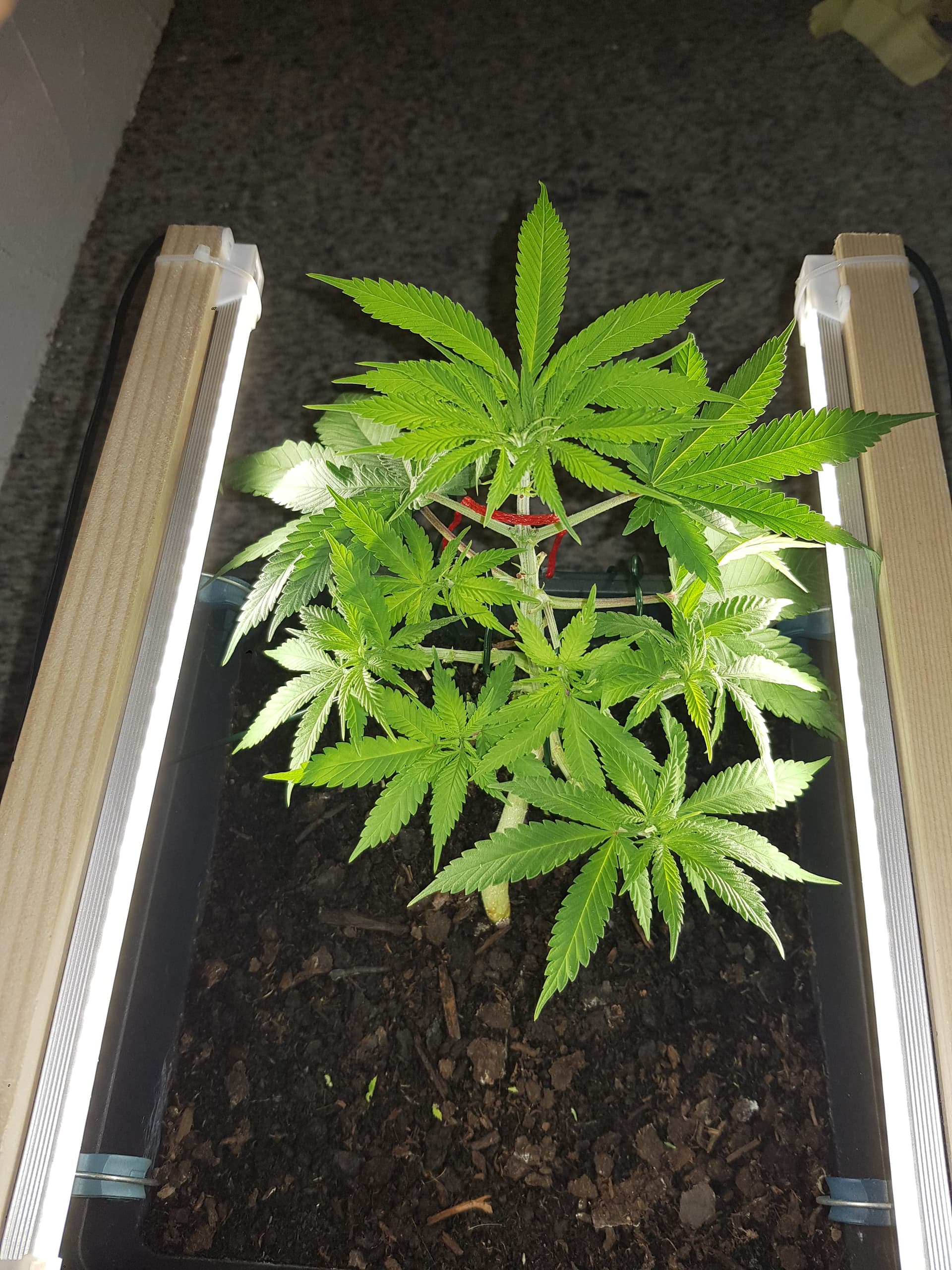 Wie alt ist die Pflanze und wann hast du angefangen Sie runter zu binden? Der Stamm sieht aus, als wenn die Pflanze schon ein paar Tage älter ist. Ansonsten, finde ich das sie echt gut im Saft steht. Hoffe es geht so unkompliziert weiter!