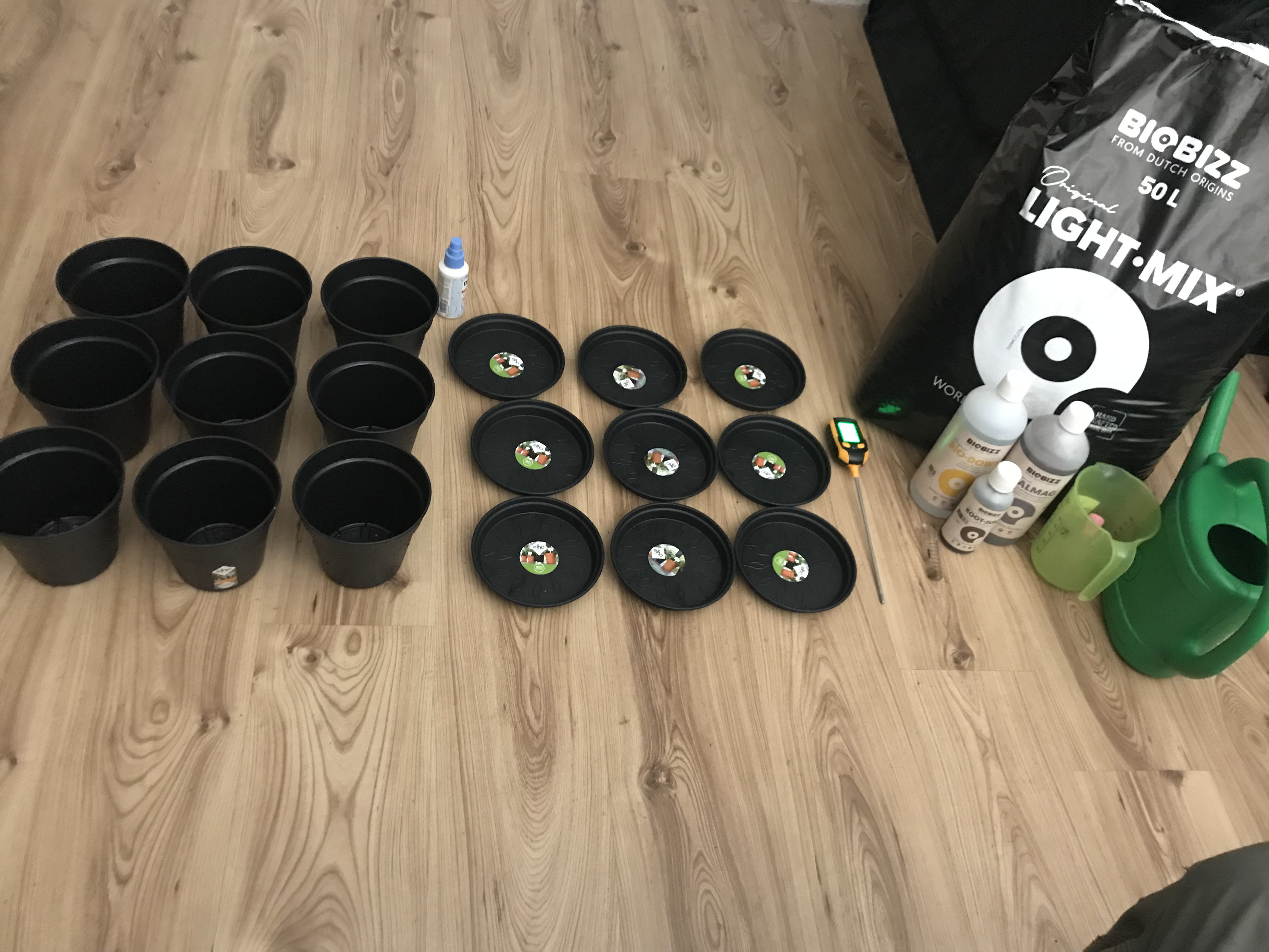 Erst Jiffy’s, dann pro Pflanze 1,5L BioBizz Light-Mix, pH 7,0 reguliert auf 6,7 (wollte einfach nur unter der Obergrenze bleiben), EC nicht gemessen