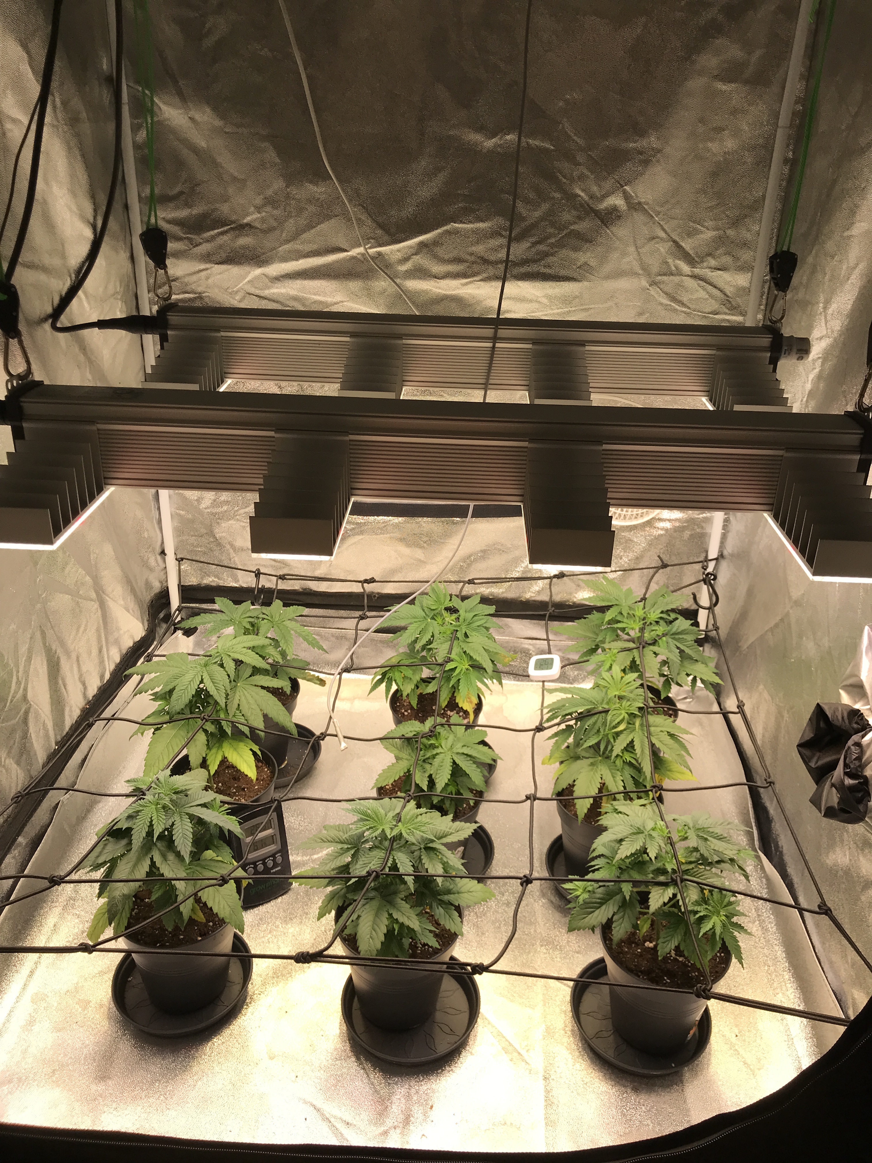 Erst Caluma Force 240w auf etwa 30 bis letztlich 50%, dann nach Umzug in die große Box 2x Sanlight Evo 4-100 mit insgesamt 500w + Sonnenauf-/untergang aktuell auf 40%