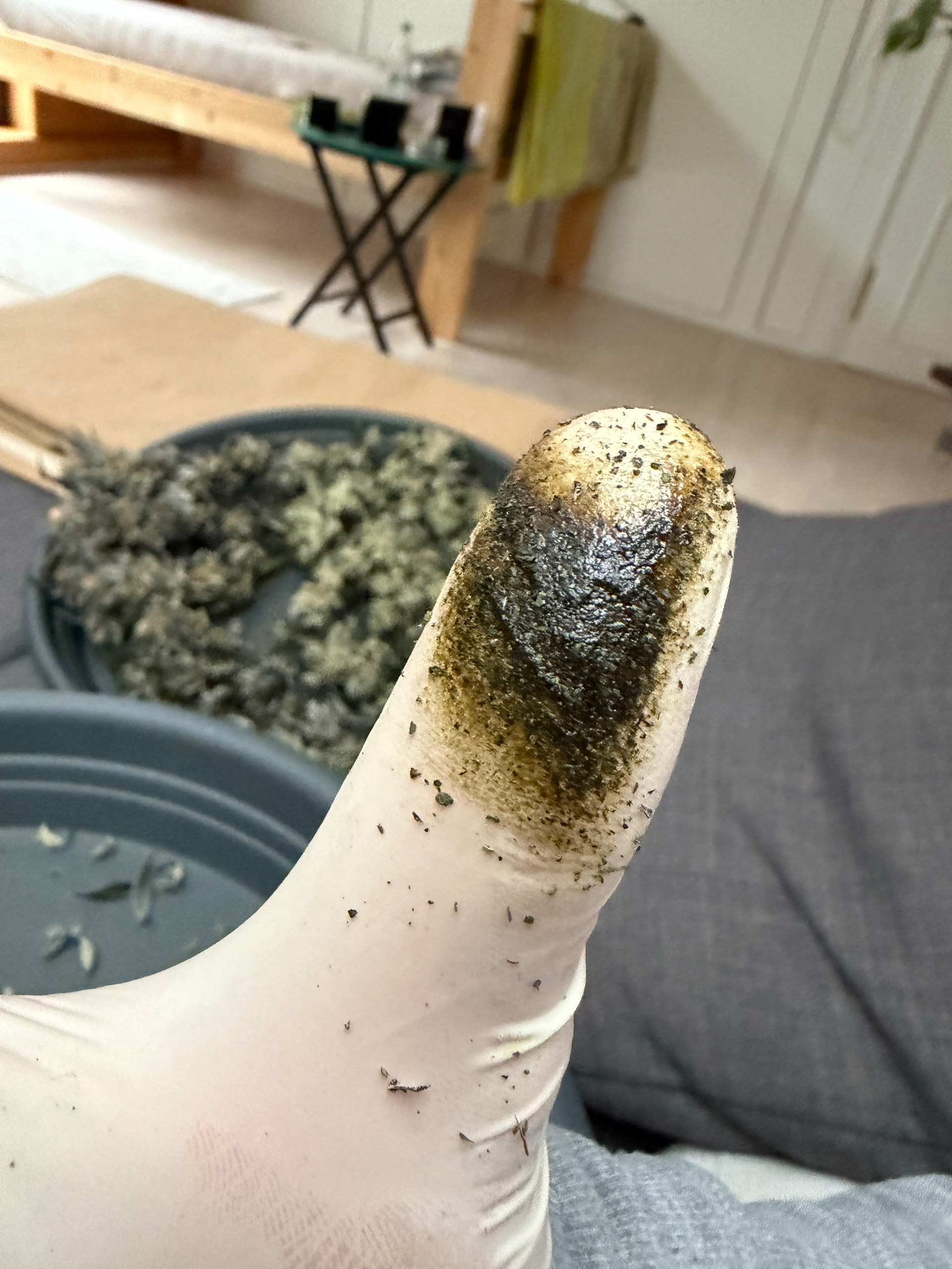kam auch wieder reichlich Fingerhash zusammen, nur wars an Tag zwei der Ernte nicht mehr feucht genug um zu kleben, eher so kleine Stückchen - sieht zwar net so schön aus, aber zum konsumieren bzw verteilen bietet sichs eh besser an.