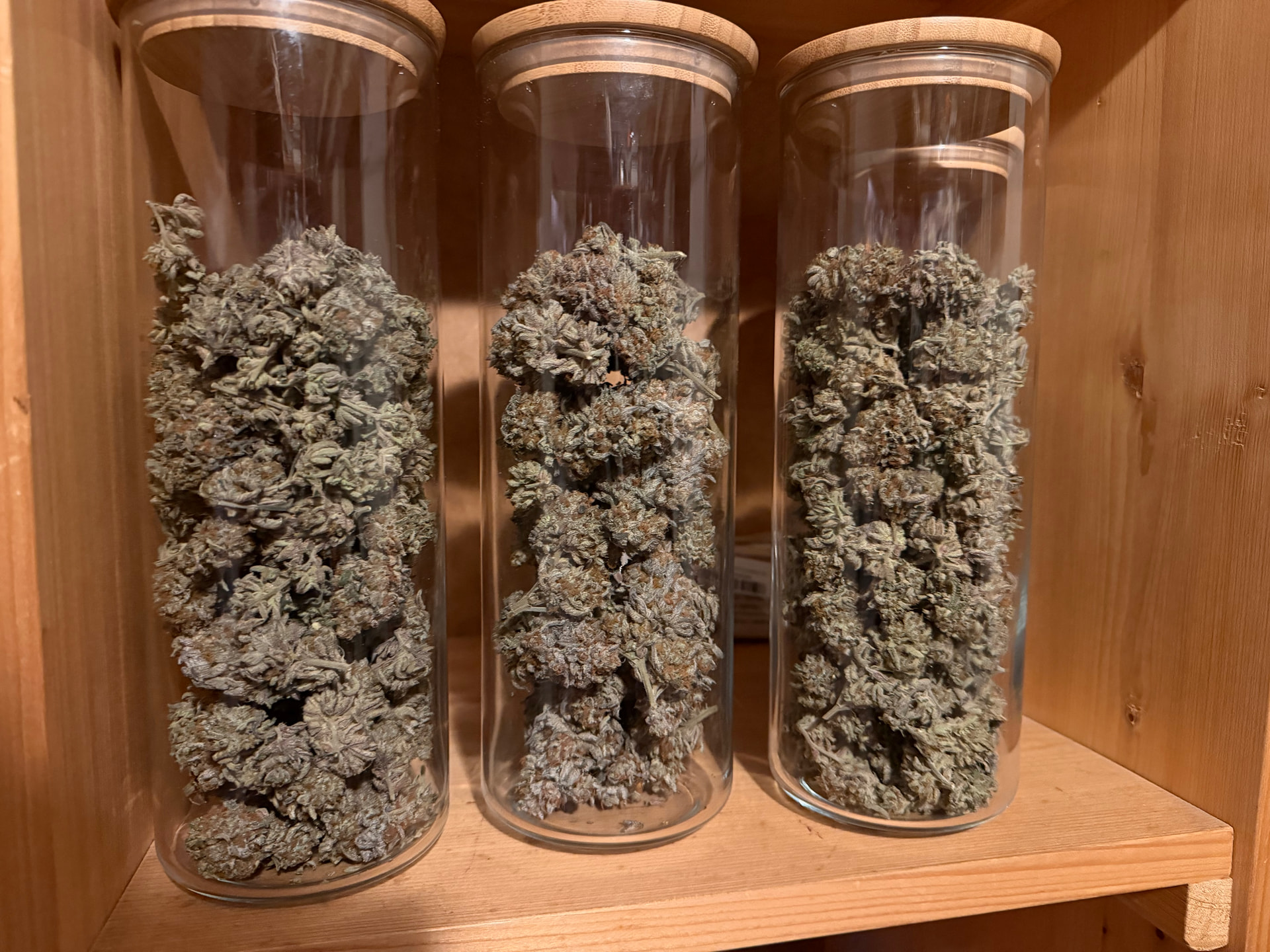 So stehen jetzt die 4 Gläser im kalten (14-16grad) und dunkeln Vorratskeller. Gesamt Ergebnis waren 254gr. Etwas weniger als ich erwartet hatte, aber bei dem minimalen Aufwand bin ich trotzdem froh darüber, reichlich Headbuds sind dabei, aber auch unten rum war ich MAL WIEDER nicht konsequent genug und es gabs etwas Popcornbuds. Auch fehlende Komposttess´s während der Blüte habt bestimmt einige Gramm auf der Strecke bleiben lassen