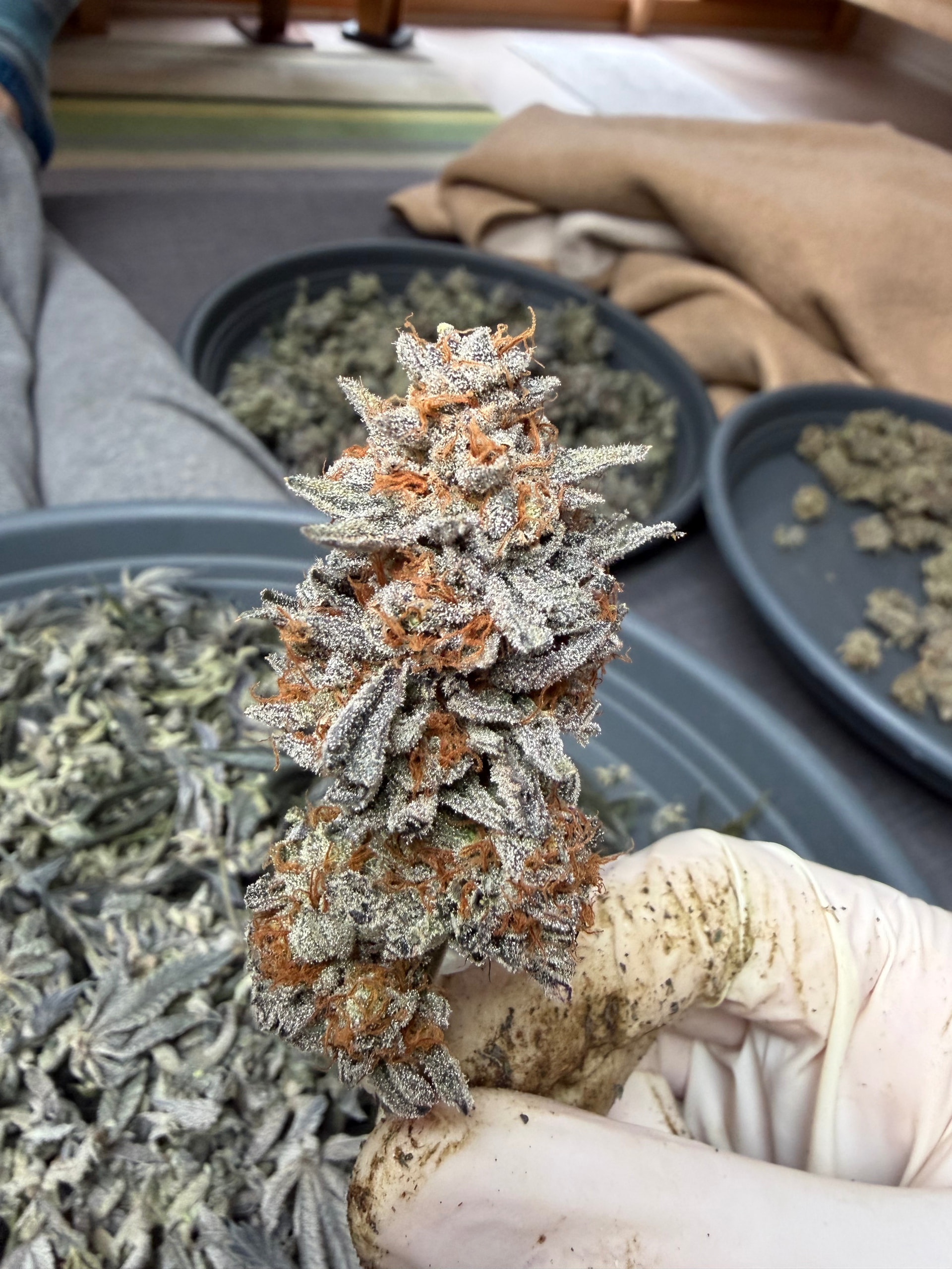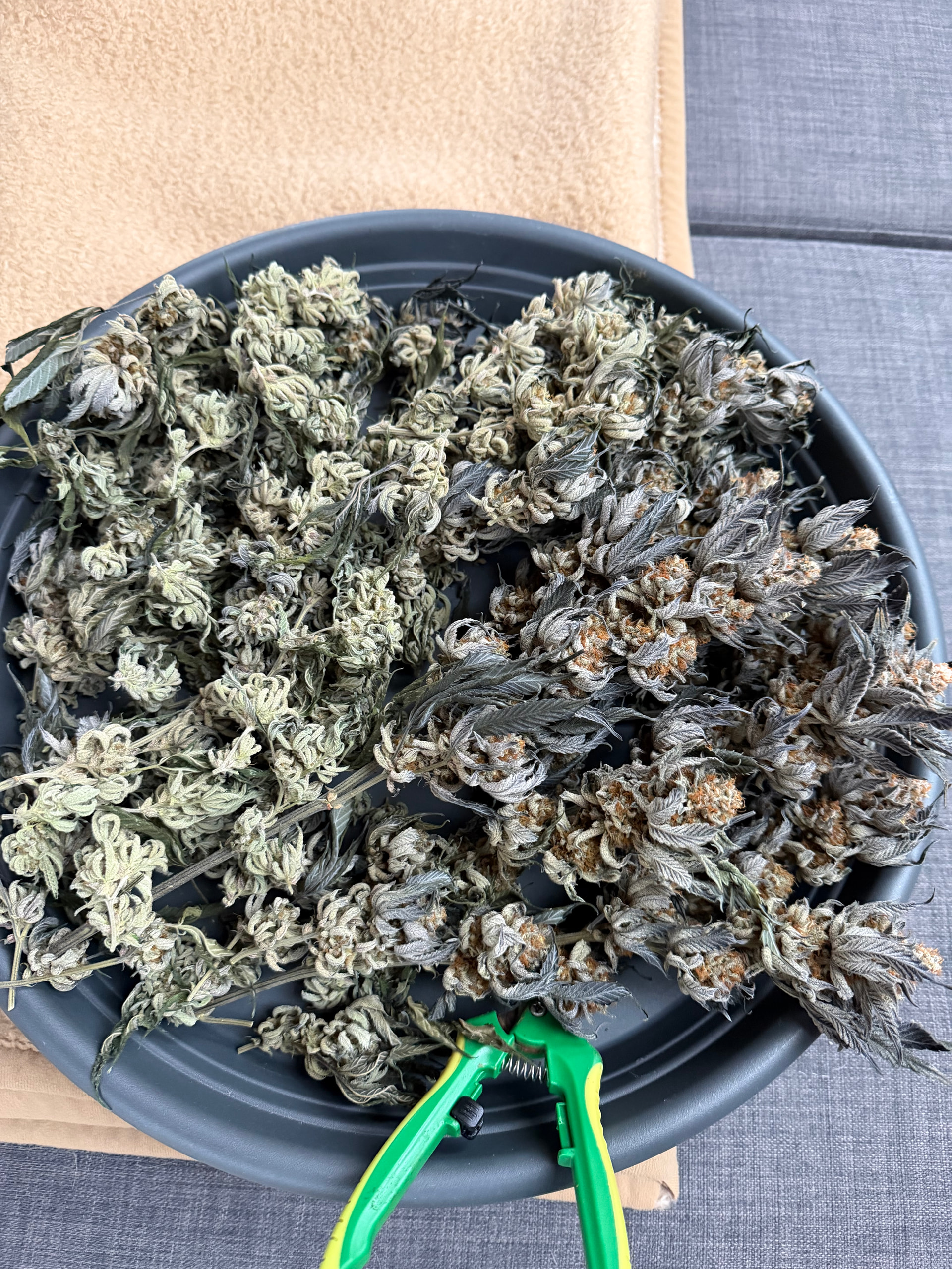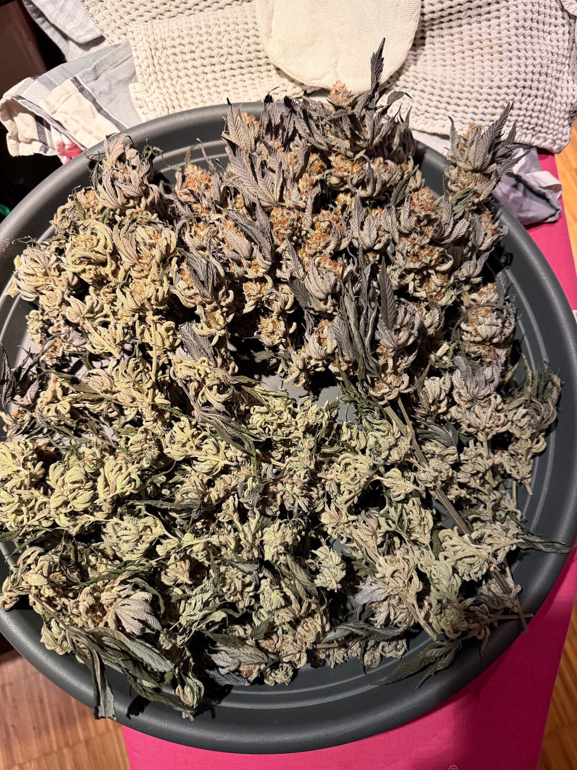 Jetzt werden sie erstmal bis nächstes Wochenende hängen und dann wird hoffentlich alles in einem Aufwasch fertiggetrimmt. Bei der Lagerung ob Glas oder Terploc Beutel weis ich noch nicht Mit Boveda sollte das Glas die bessere Lagerung bieten.