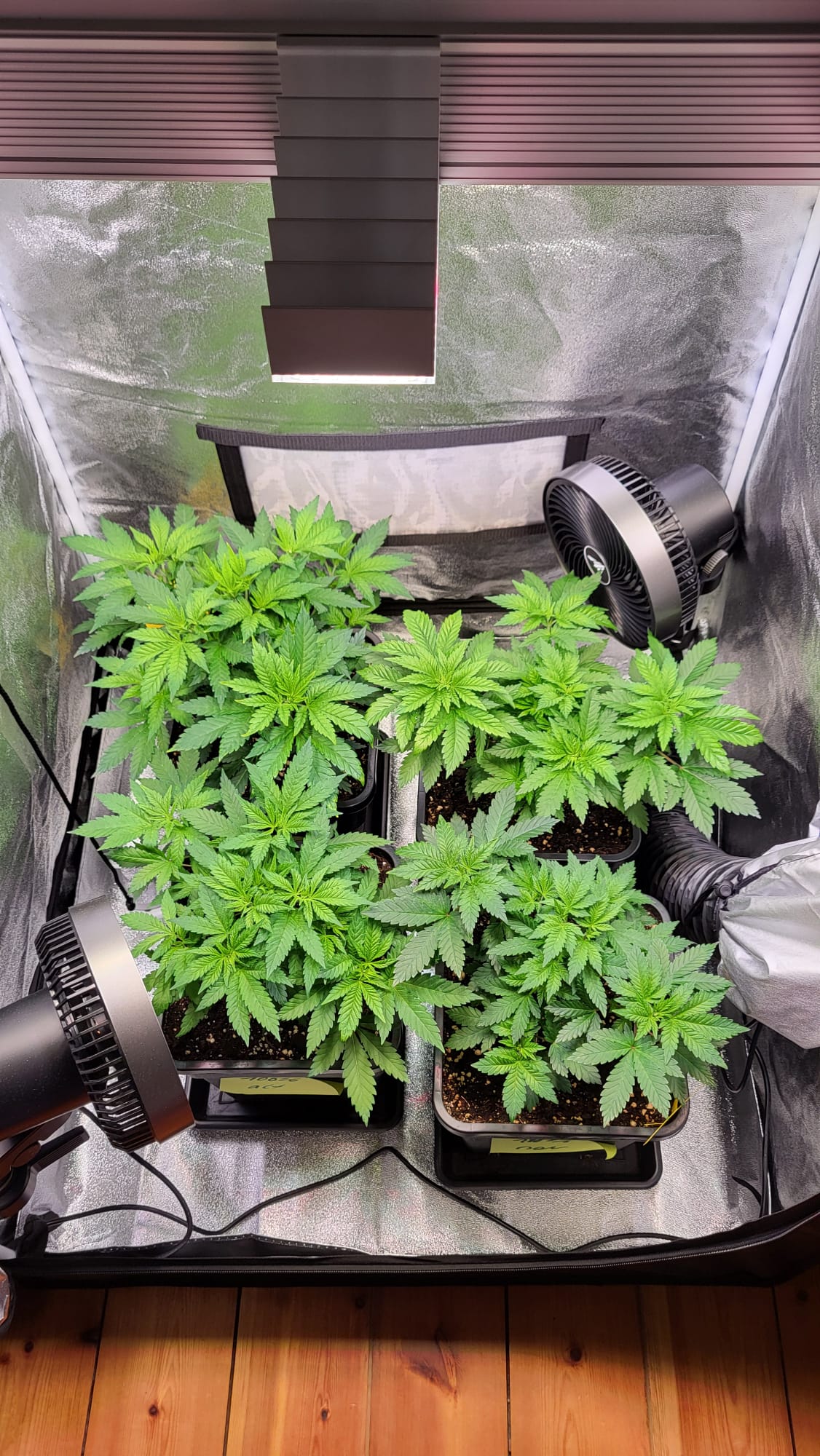 Der Zuluft-Schlauch liegt am Boden an der Wand hinter den beiden oberen Pflanzen bzw. Töpfen auf den Bildern. Deshalb waren die hinteren beiden Pflanzen auch ziemlich trocken und die beiden vorderen noch feucht. Also die Erde.
