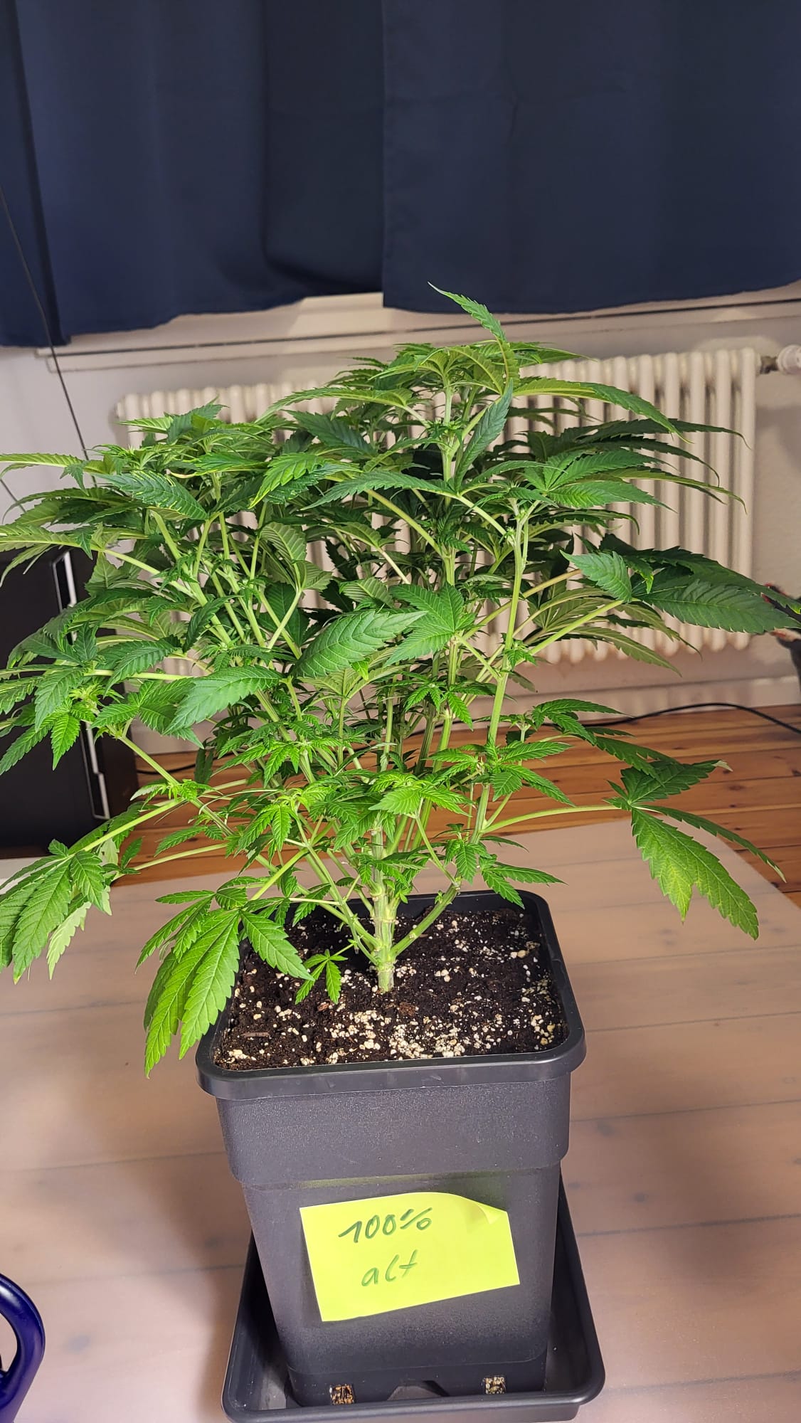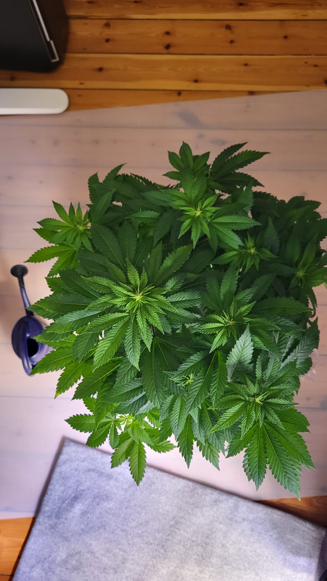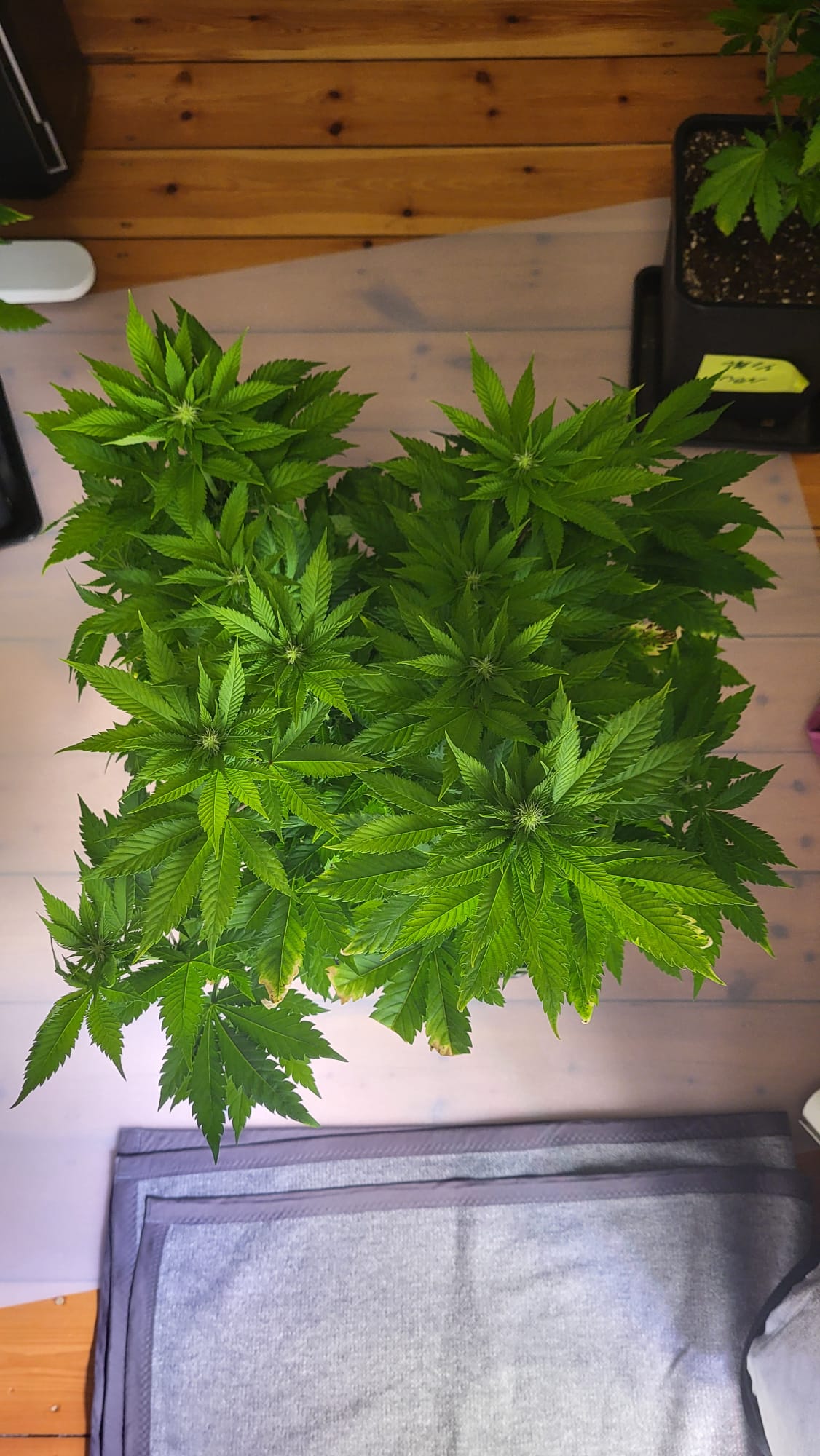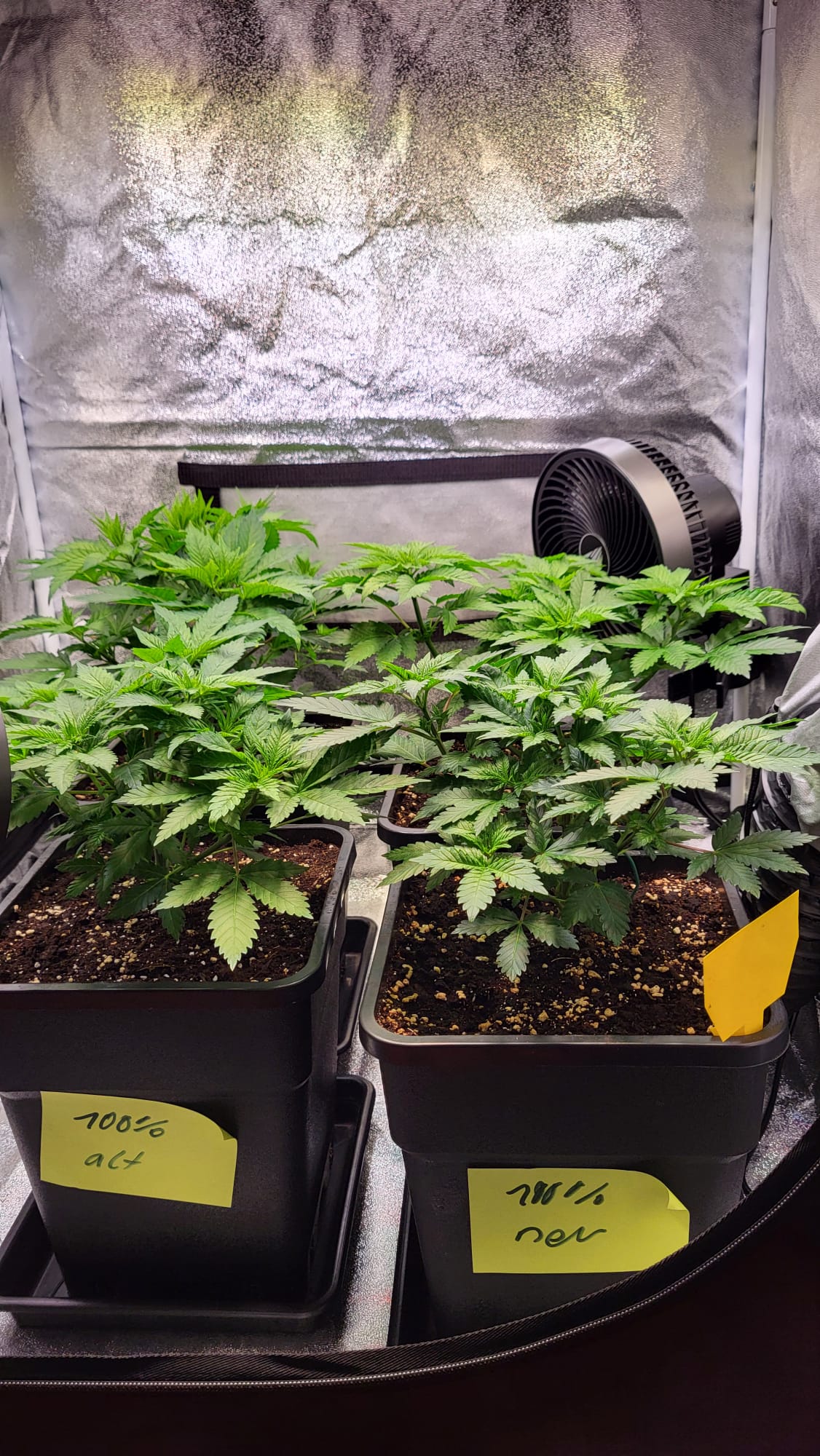 Direkt nach dem letzten Gießen ist die Pflanze links oben deutlich heller geworden. Ich hätte jetzt zu wenig Stickstoff vermutet. Hab 2 Liter pro Pflanze mit 125% BB Grow gegossen und würde den letzten Liter mit 150% BB Grow gießen.