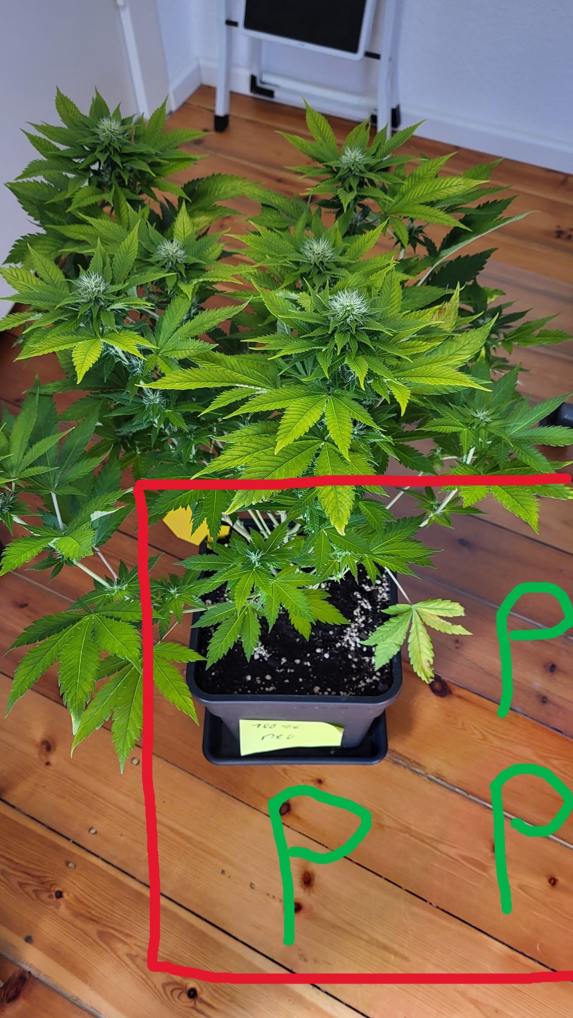 Hab mal versucht, die Anordnung im Zelt zu skizzieren. Die roten Linien wären die Zeltwand und die grünen P’s sind die anderen Pflanzen: