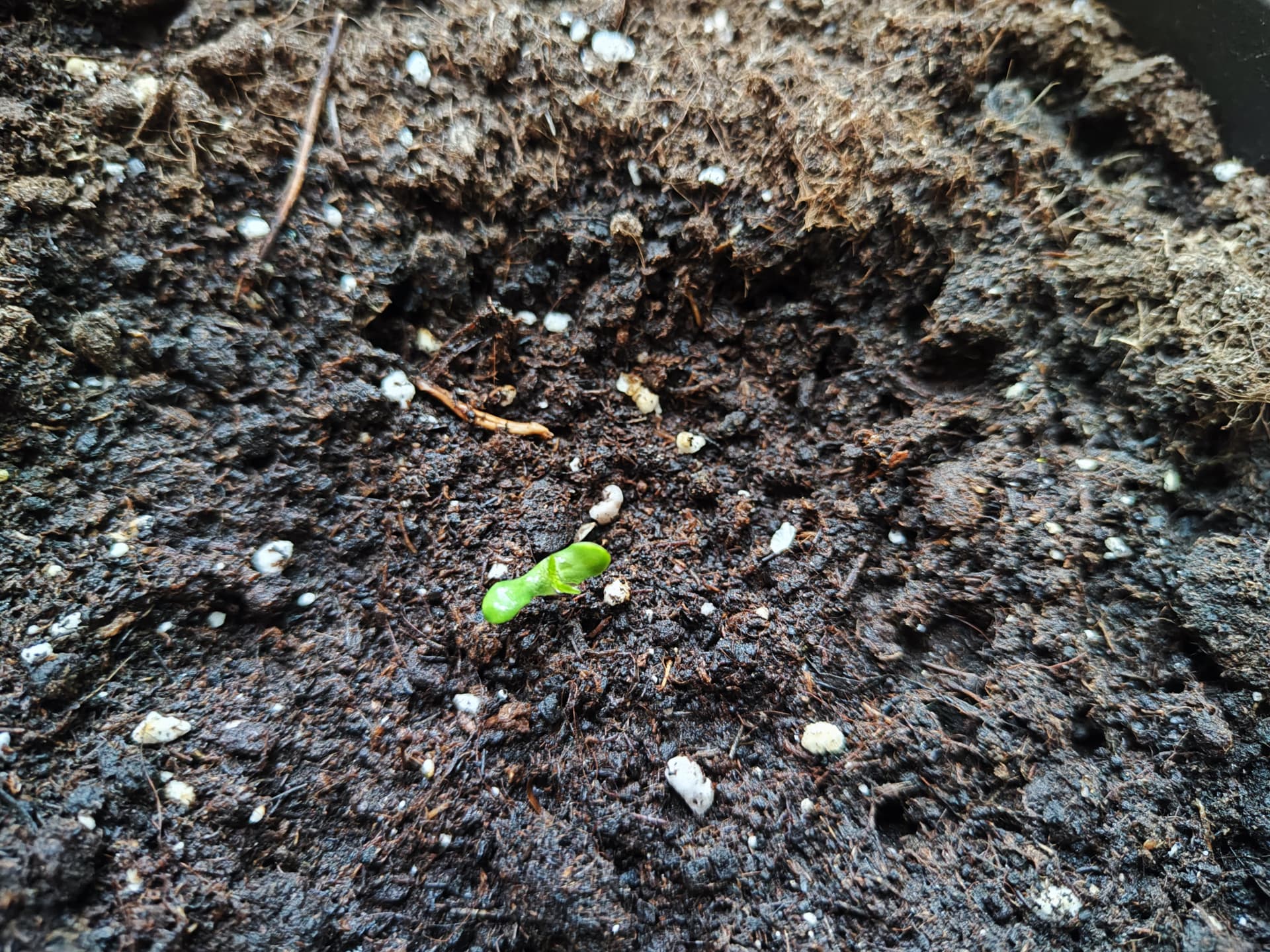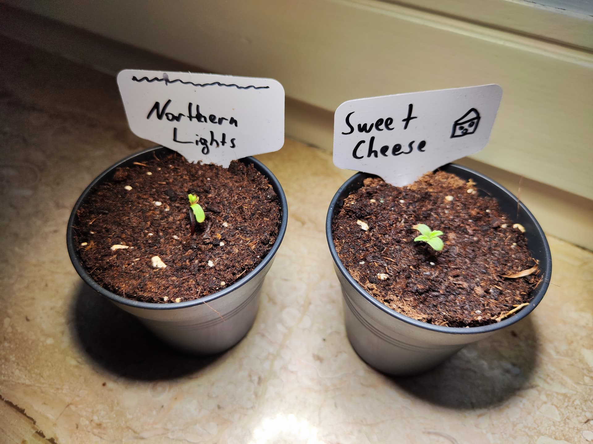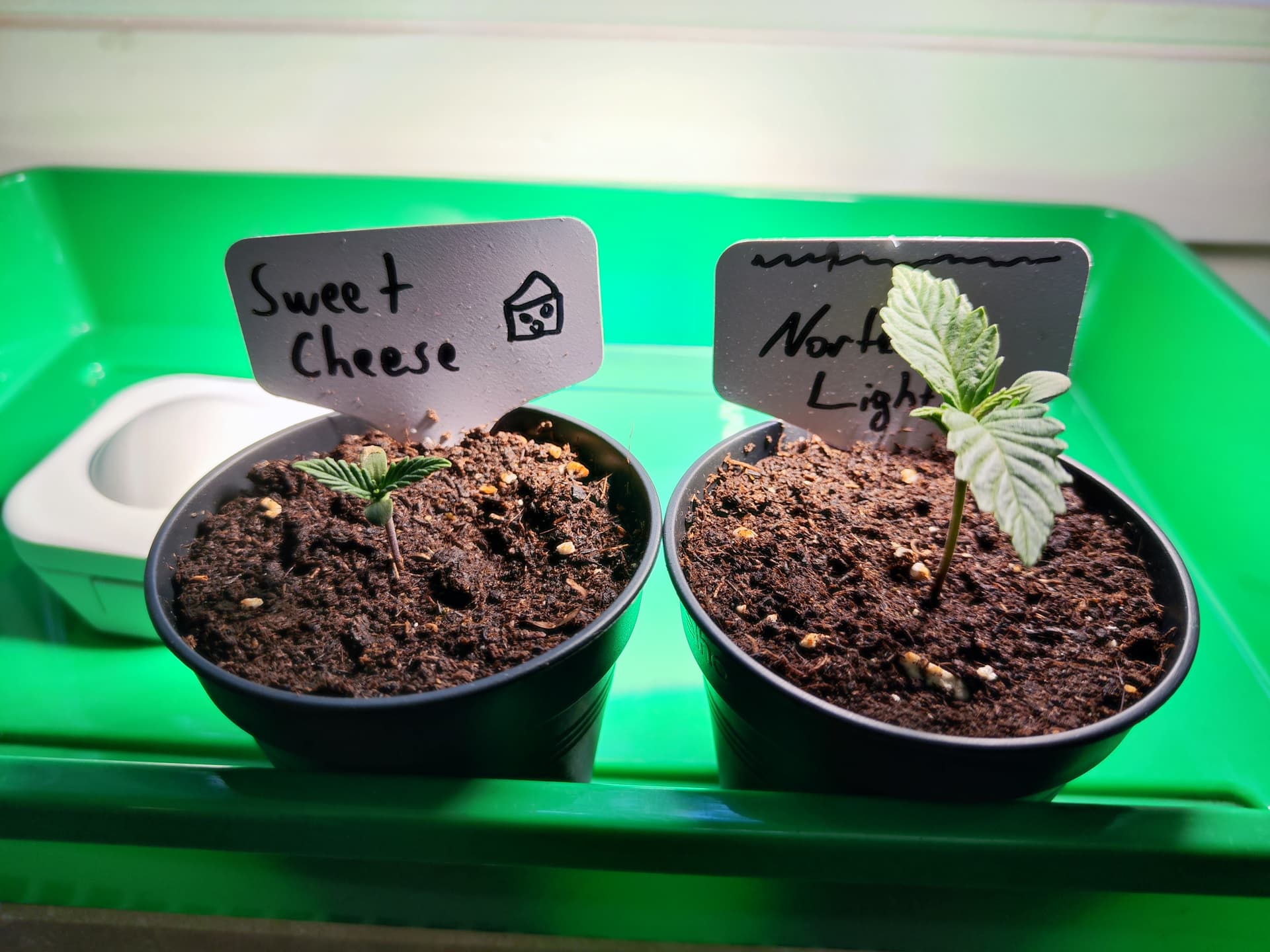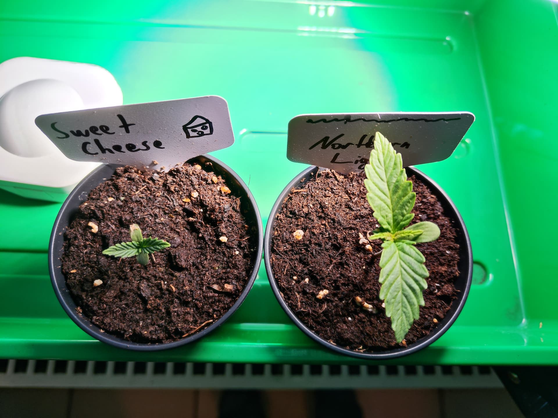 Der erste Grow ist noch nicht durch und schon folgt der zweite. Diesemal in kleineren Pötten. Eine davon 7,5l, direkt mit gekeimten Samen rein. Die anderen beiden kommen in Anzuchttöpfchen mit Kräutererde und werden später in 9l Stofftöpfe gesetzt.