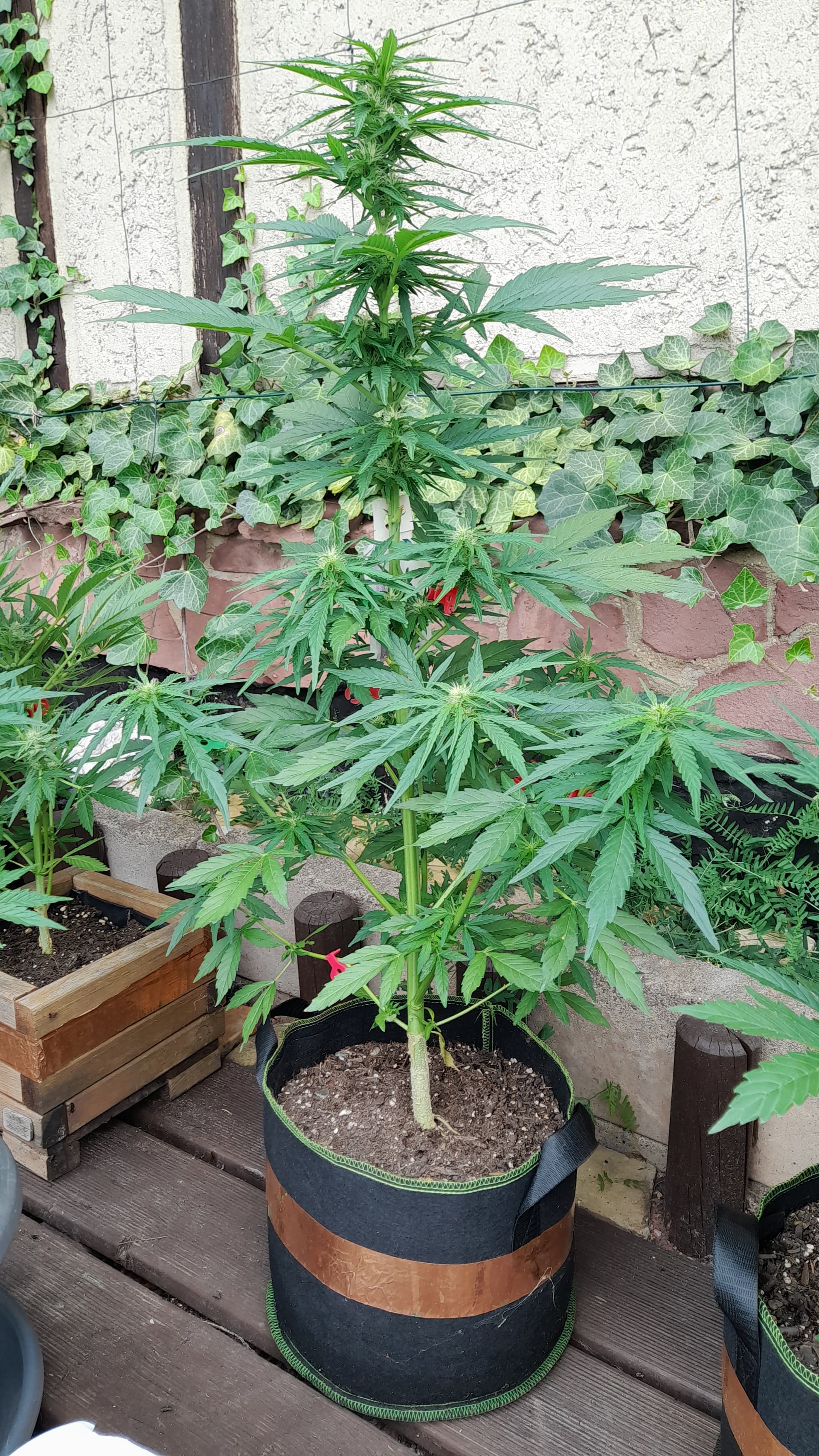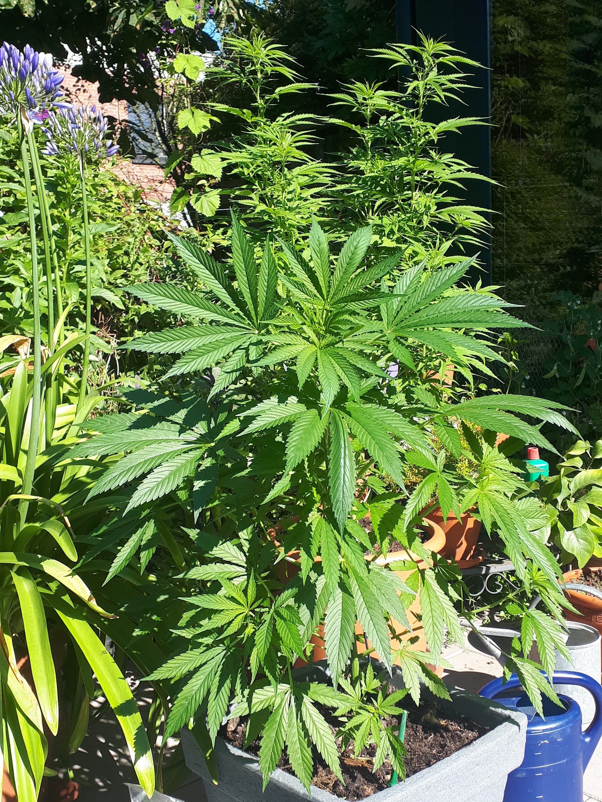 Mein Bonsai-skunk hat mächtig aufgeholt, wenn es so weitergeht überholt die alle anderen. Absolut sonnengeil, stellt die grossen maximal ins Licht, fast senkrecht. Dahinter die eher filigrane Purple Kush.