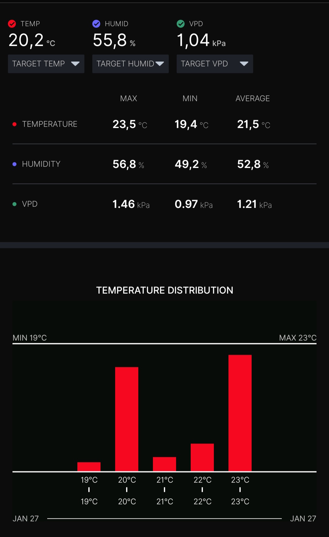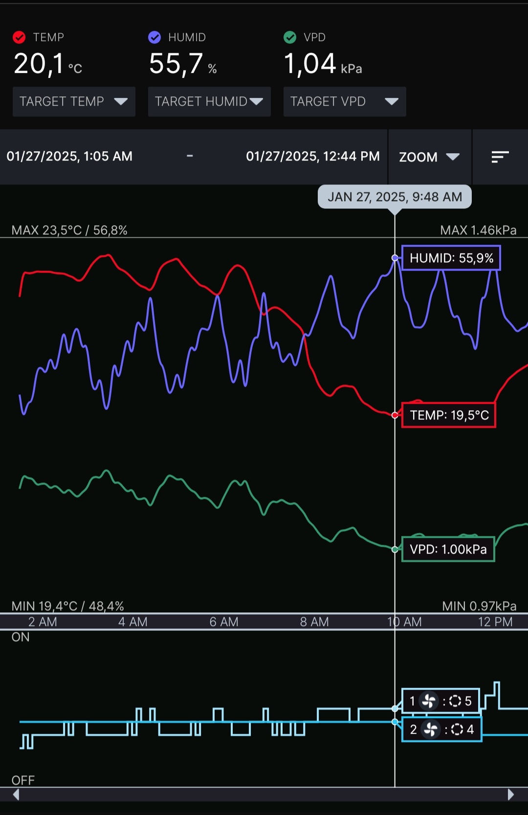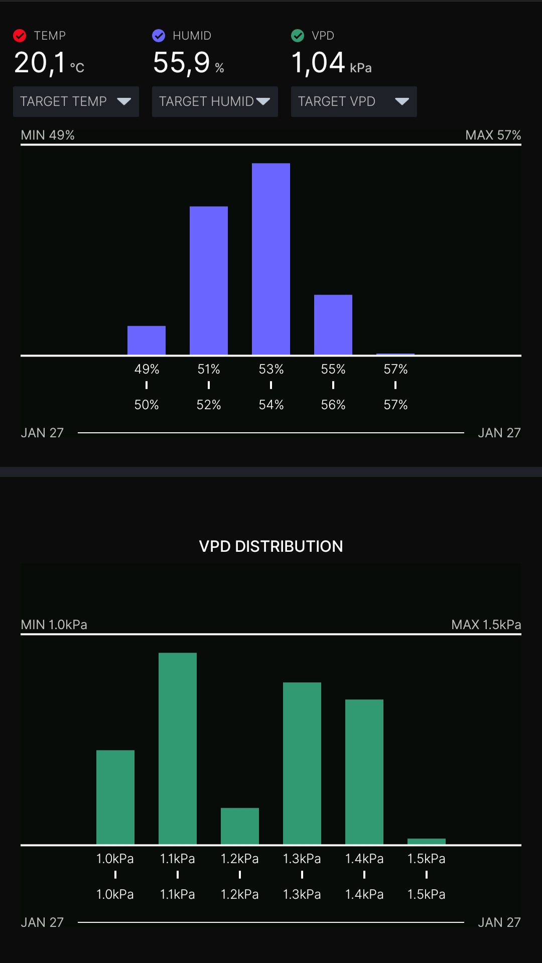 Ich habe mein Hygrometer im Zelt hängen, das zeigt mir an, ob alles ok ist. VPD kann man sich ja dann angucken ob alles passt.