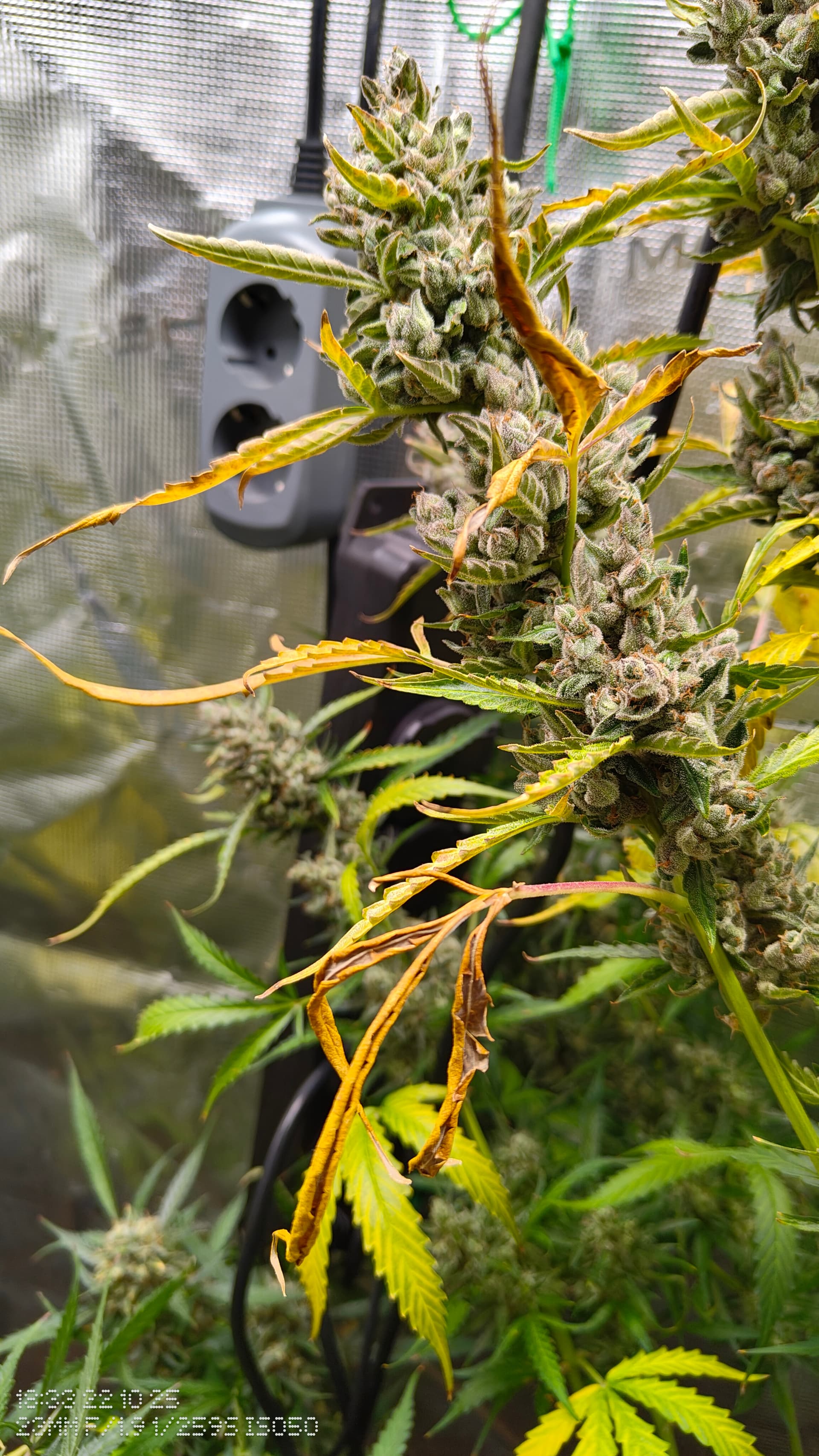 In den letzten 10 Tagen habe ich etwas recherchiert und bin zu dem Entschluss gekommen dass es in meinem Zelt oft zu heiß war, das Licht zu hell war und dass ich einen neues PH-Messgerät brauche. 2 von 3 Pflanzen haben starke Anzeichen von Foxtailing.
