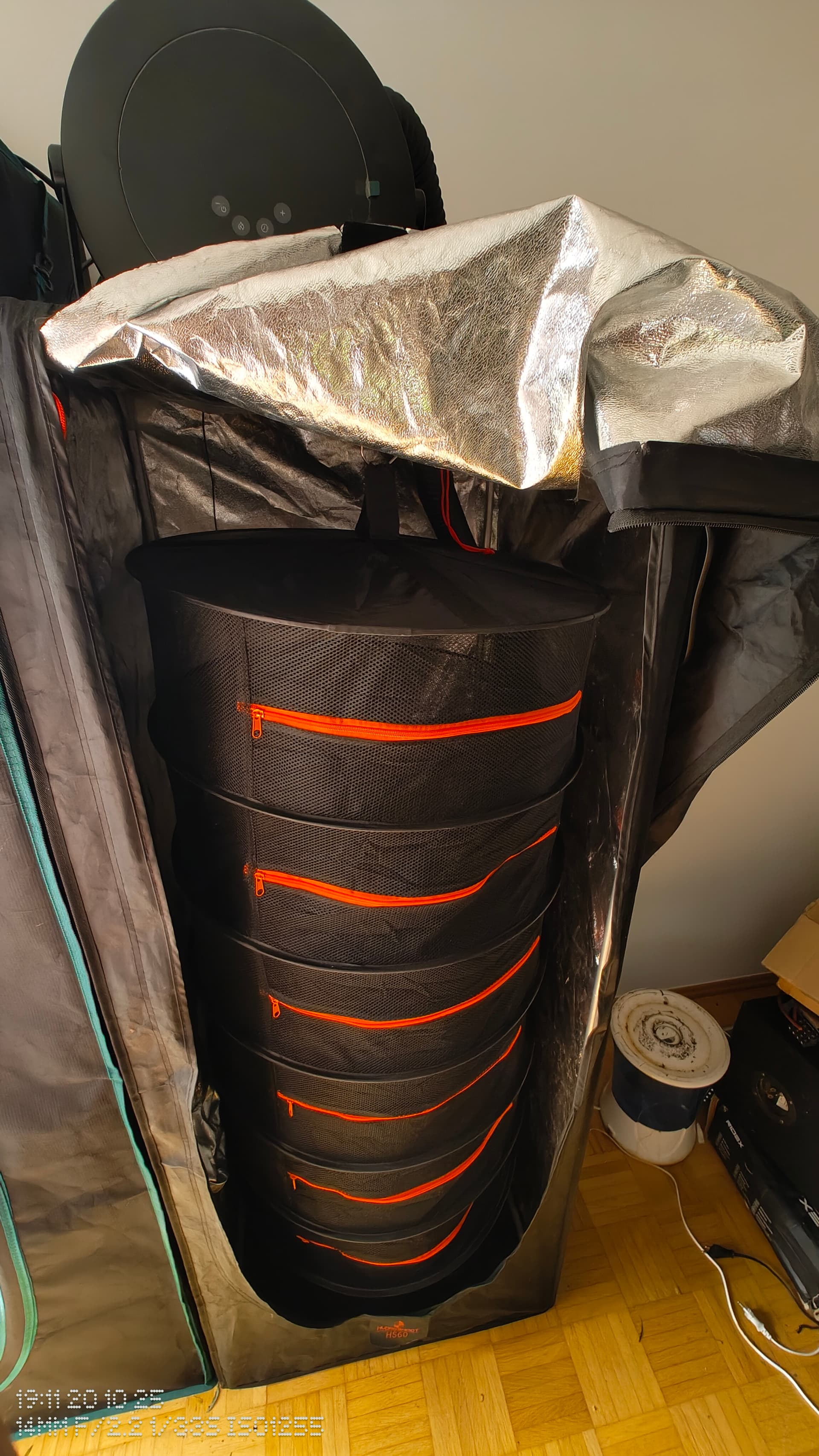 Aber zum Glück ist es ja nicht mehr lang bis zur Ernte…dachte ich jedenfalls. Die Trichome lassen sich echt Zeit. Inzwischen habe ich mein zweites Zelt aufgebaut und Dryingrack reingehängt. Den Spider Farmer Heater verwende ich mit der Gebläse Funktion für die Luftzirkulation und erzeuge dadurch gleichzeitig Überdruck sodass die Luft ausgetauscht wird.