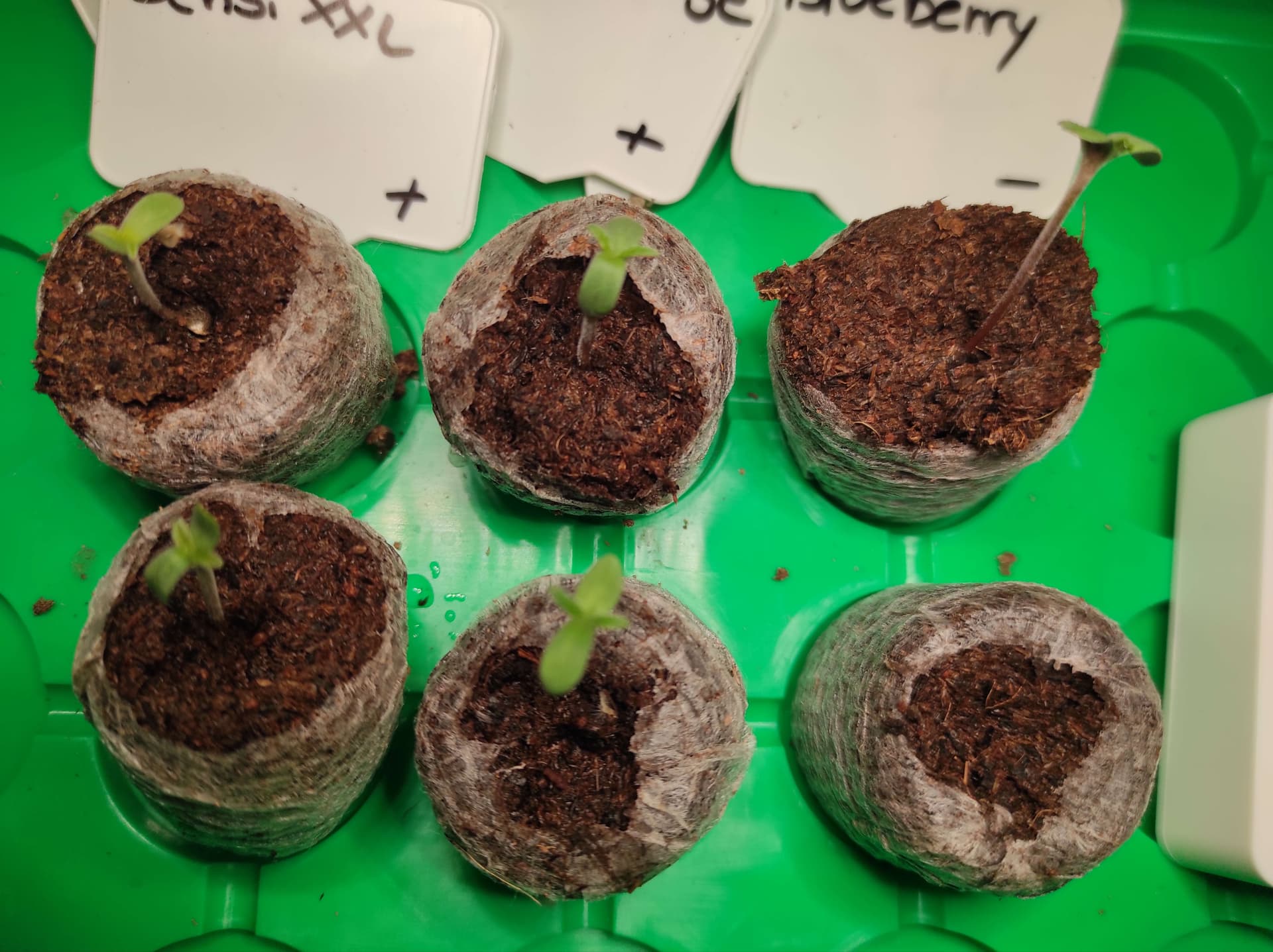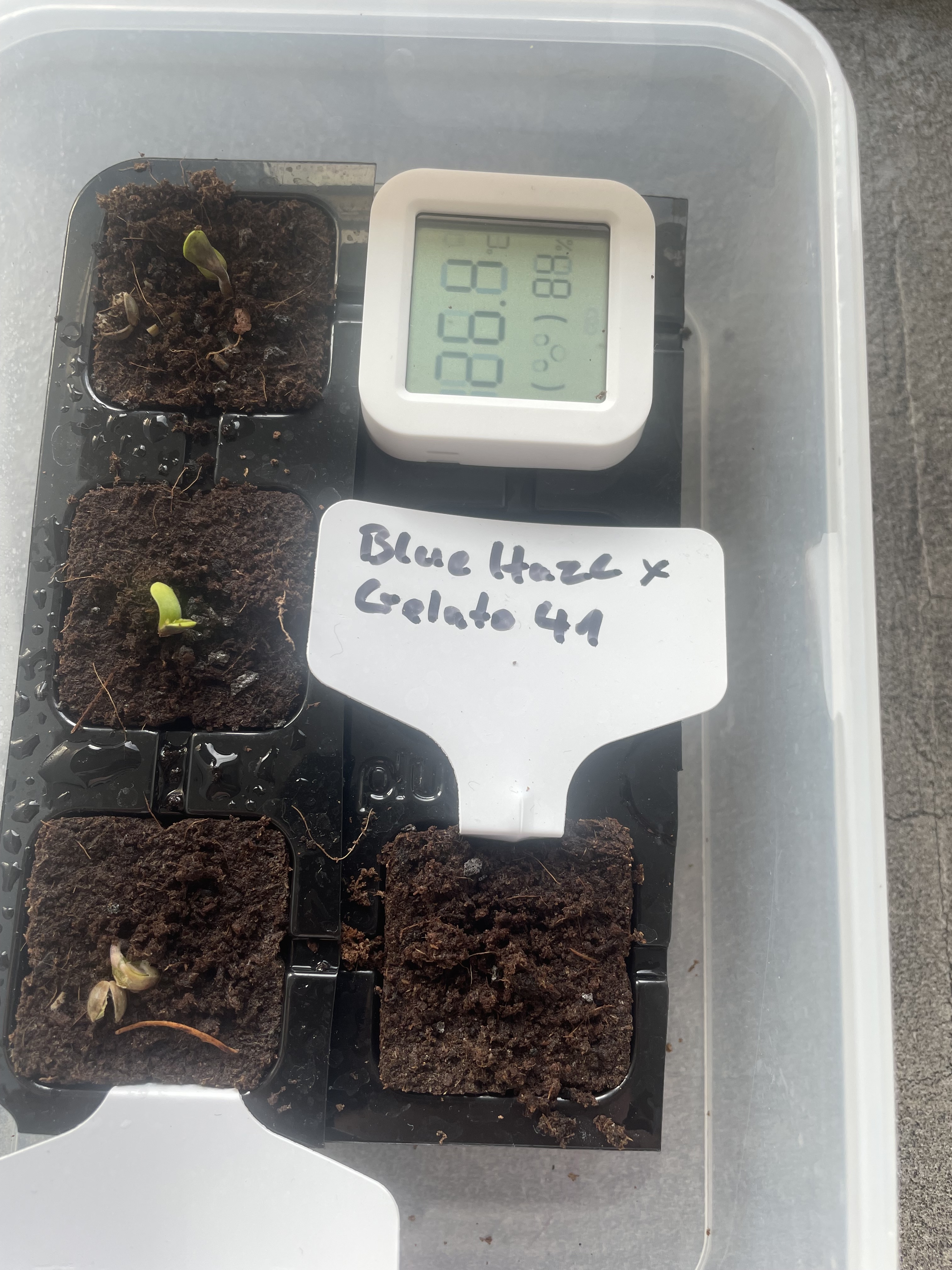 Bis auf eine Blueberry Zkittlez sind alle Ladys zum Leben erwacht Habe diesmal paar Sprüher mehr Wasser gemacht (etwa 5) da die Jiffys unter der Lampe doch recht fix austrocknen. Temperatur etwa 26 Grad und 80% RLF. Rootjuice auf 1,5ml/L erhöht.
