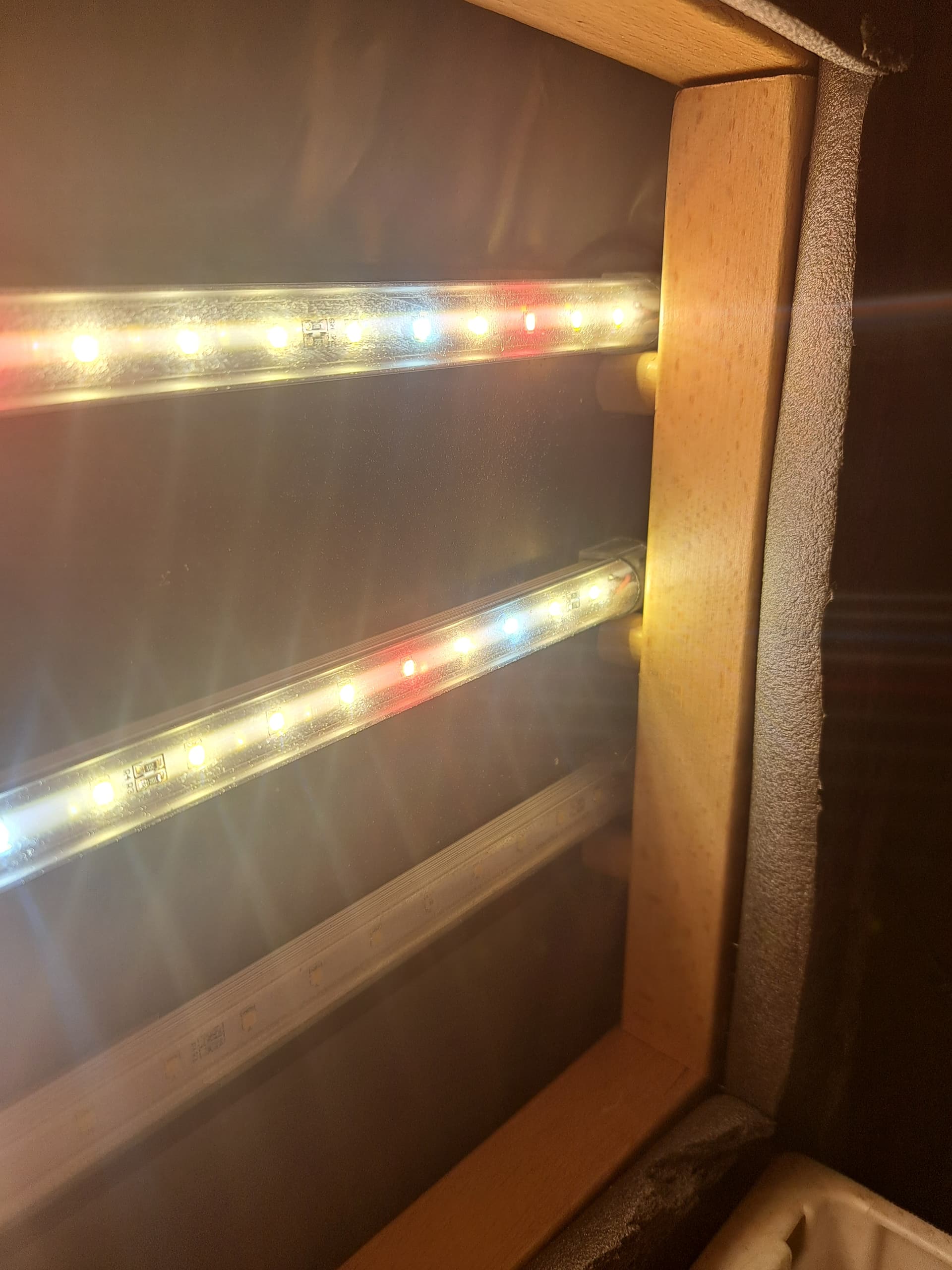 Aus den Leisten habe ich einen zur Kiste passenden Rahmen gebaut. An ein Brett habe ich drei LED Leisten geklebt und mit 6 Abstandshaltern oben drauf gesetzt. Aktuell sind nur 2 der Leisten angeschlossen.