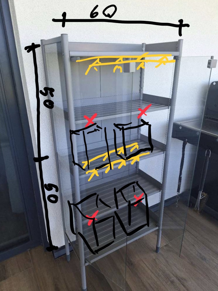 Meine Idee für dieses Jahr: den vorhandenen Ikea Balkon-/Glasschrank Hindö mit Kunstlicht ausstatten und - so Jah will - bereits Mitte April anfangen. Ich würde dazu zwei Böden aus dem Schrank entfernen (rotes X) und jeweils zwei Lichtleisten an den darüber liegenden Boden befestigen: