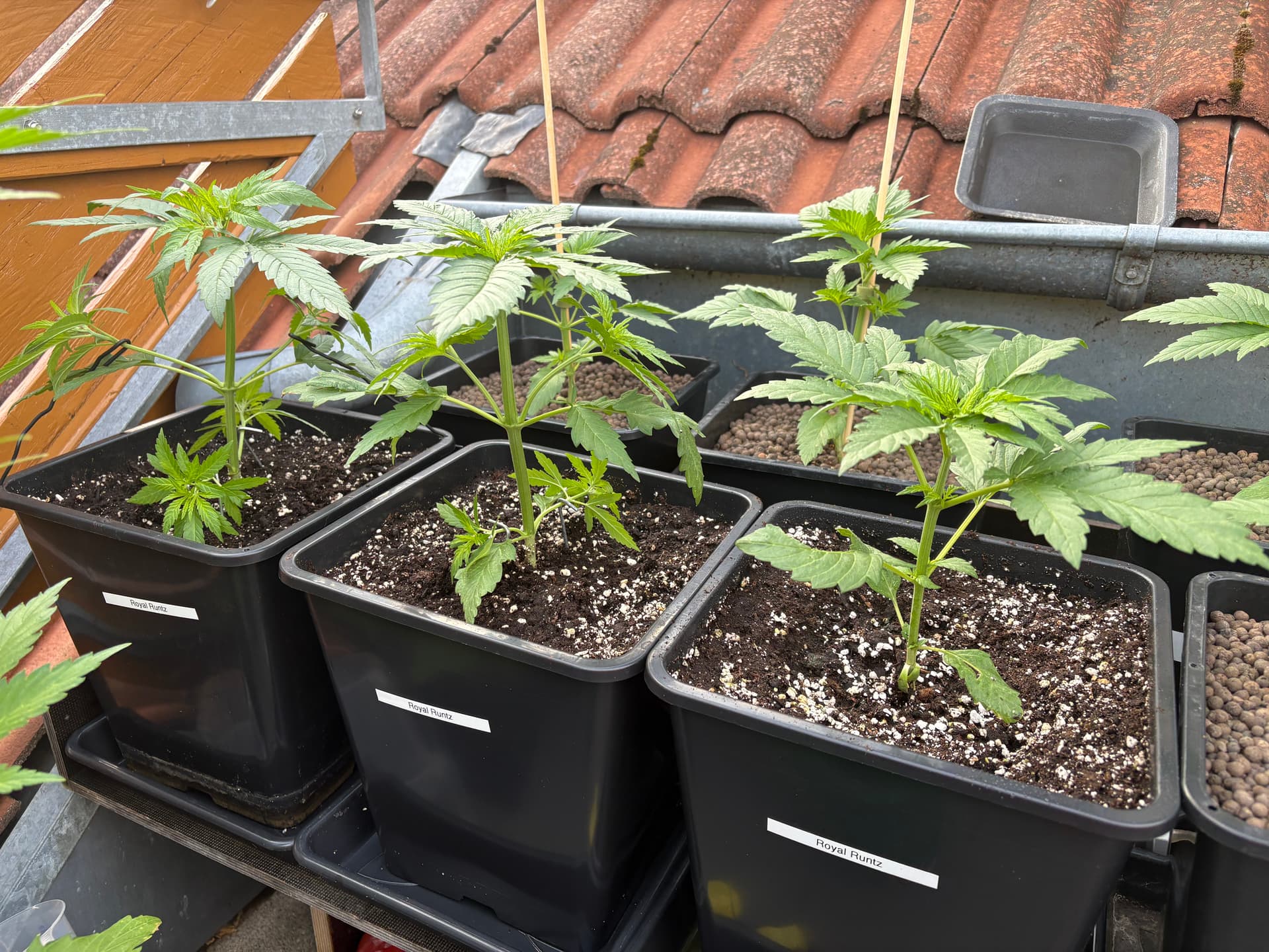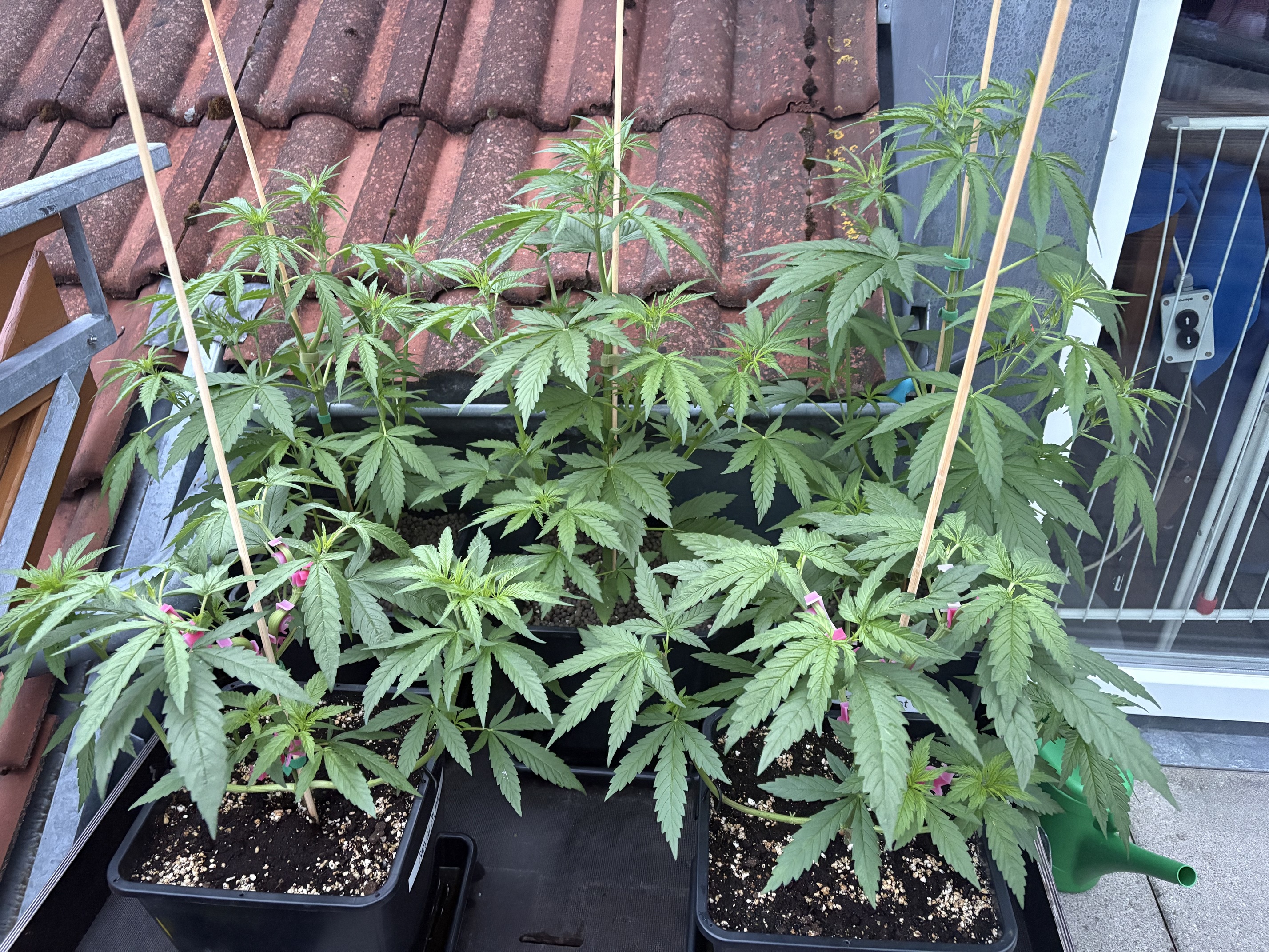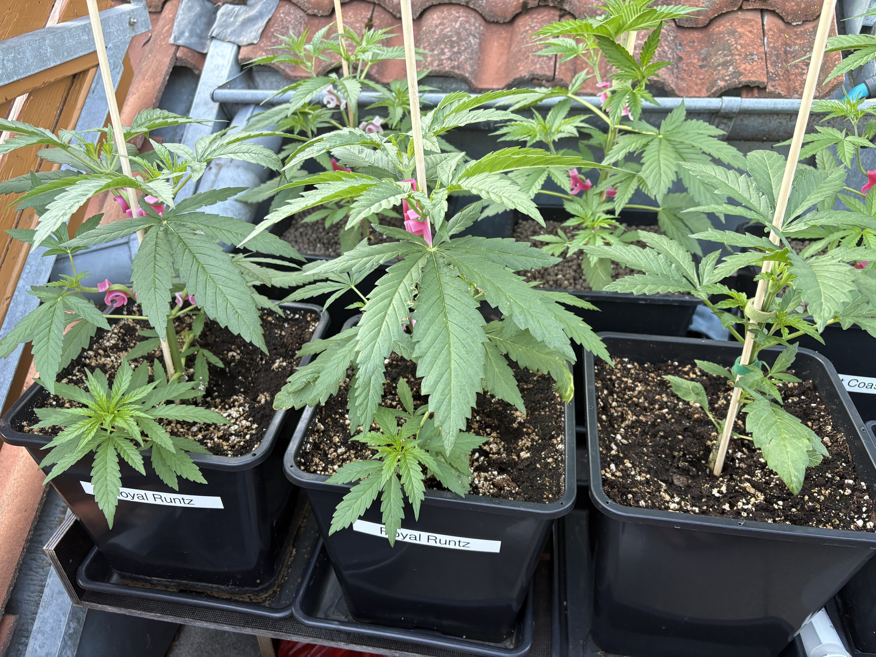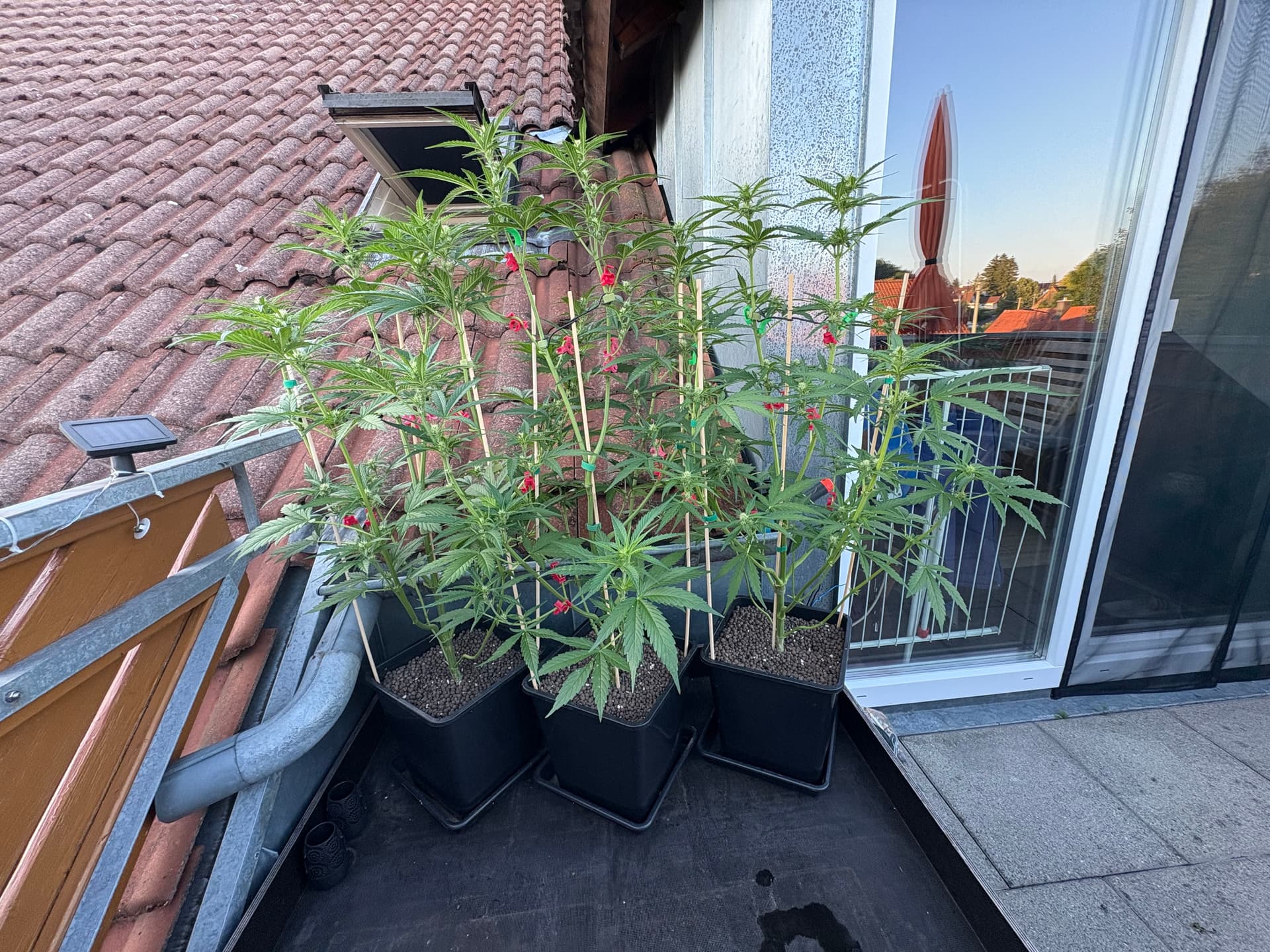 Recht unspektakulär bisher. Sie sind 15 Tage alt und wurden gestern und heute von 3l auf 11l umgetopft. Zwei davon wurden bisher einmal getoppt, eine schwächelt noch ein bisschen.