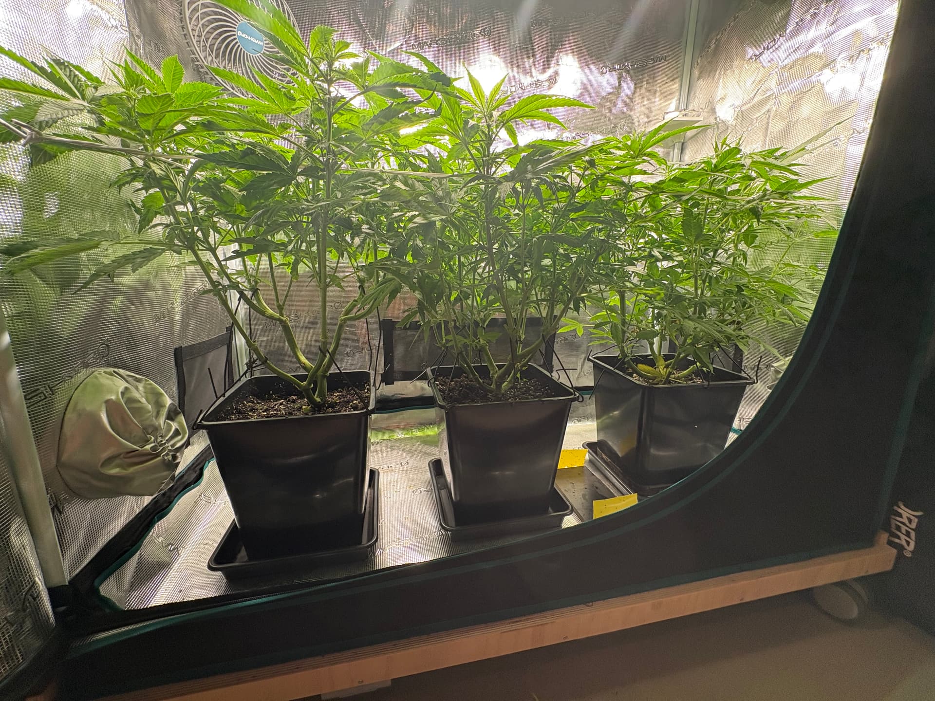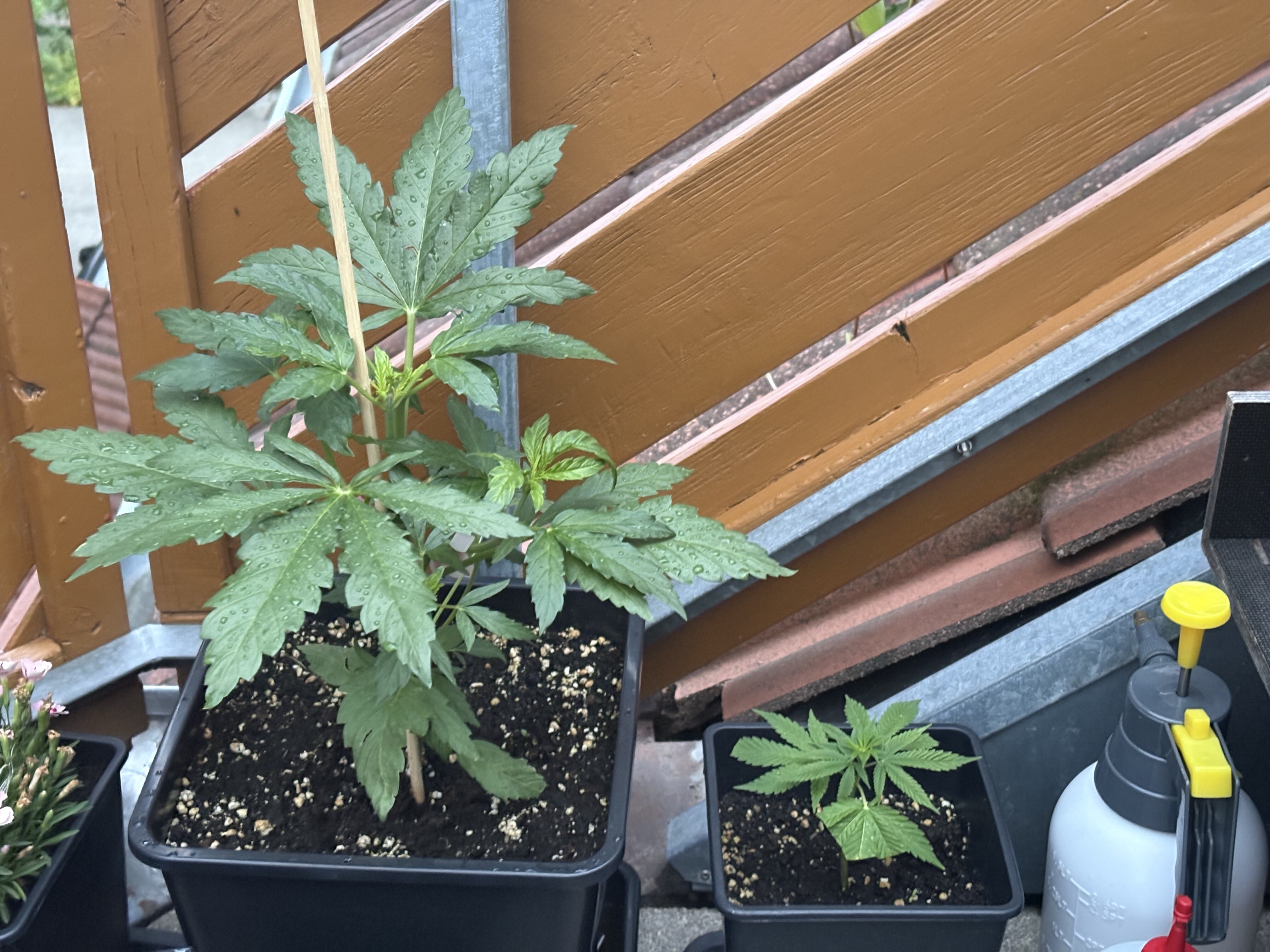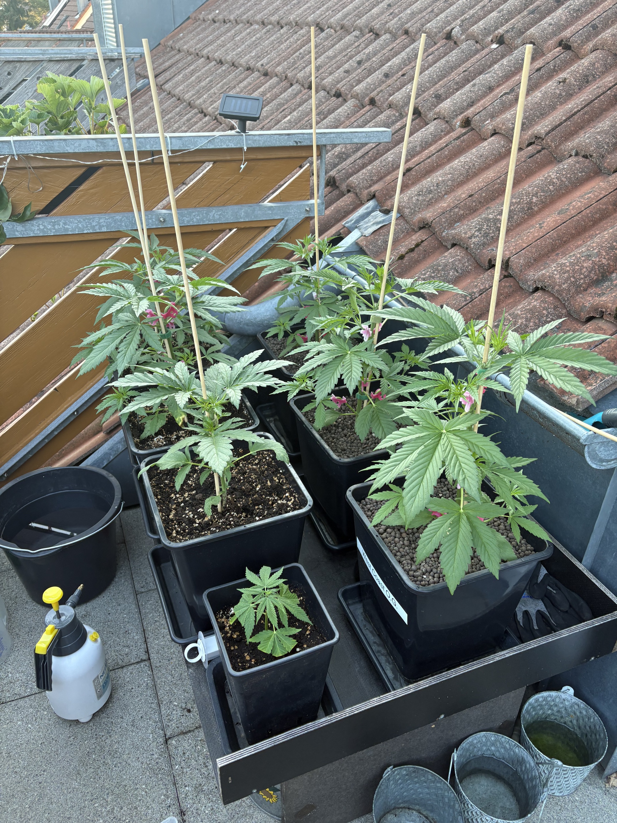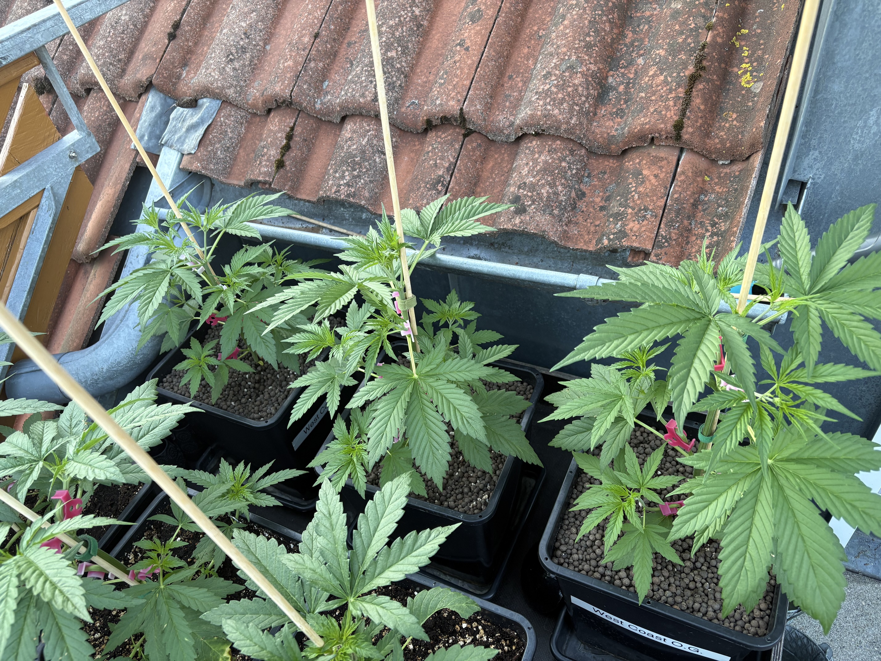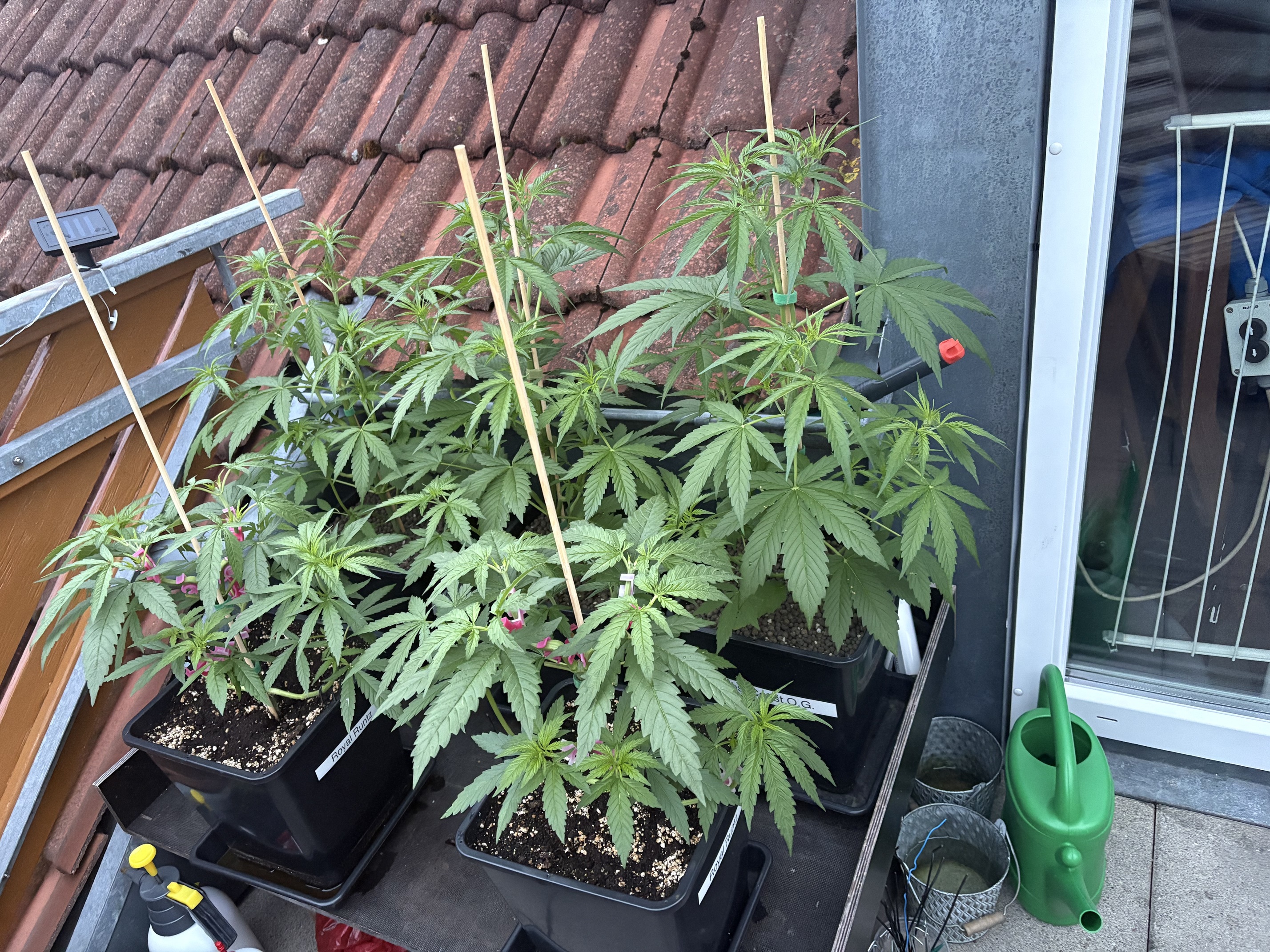 Recht unspektakulär bisher. Sie sind 15 Tage alt und wurden gestern und heute von 3l auf 11l umgetopft. Zwei davon wurden bisher einmal getoppt, eine schwächelt noch ein bisschen.
