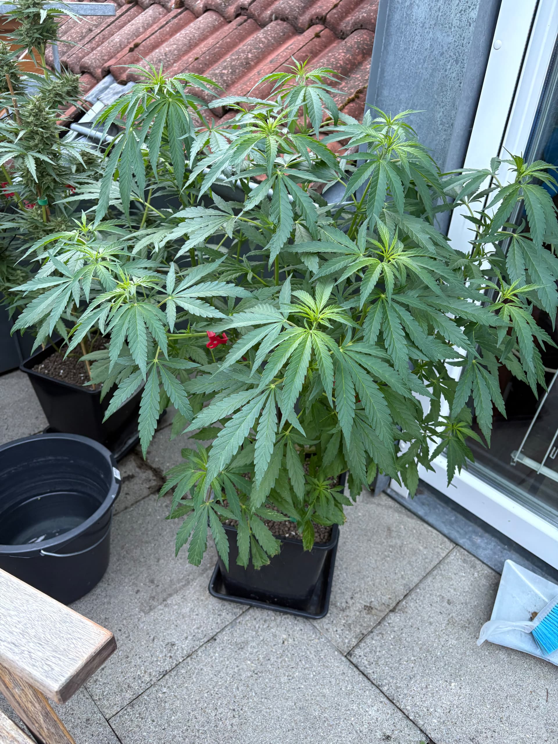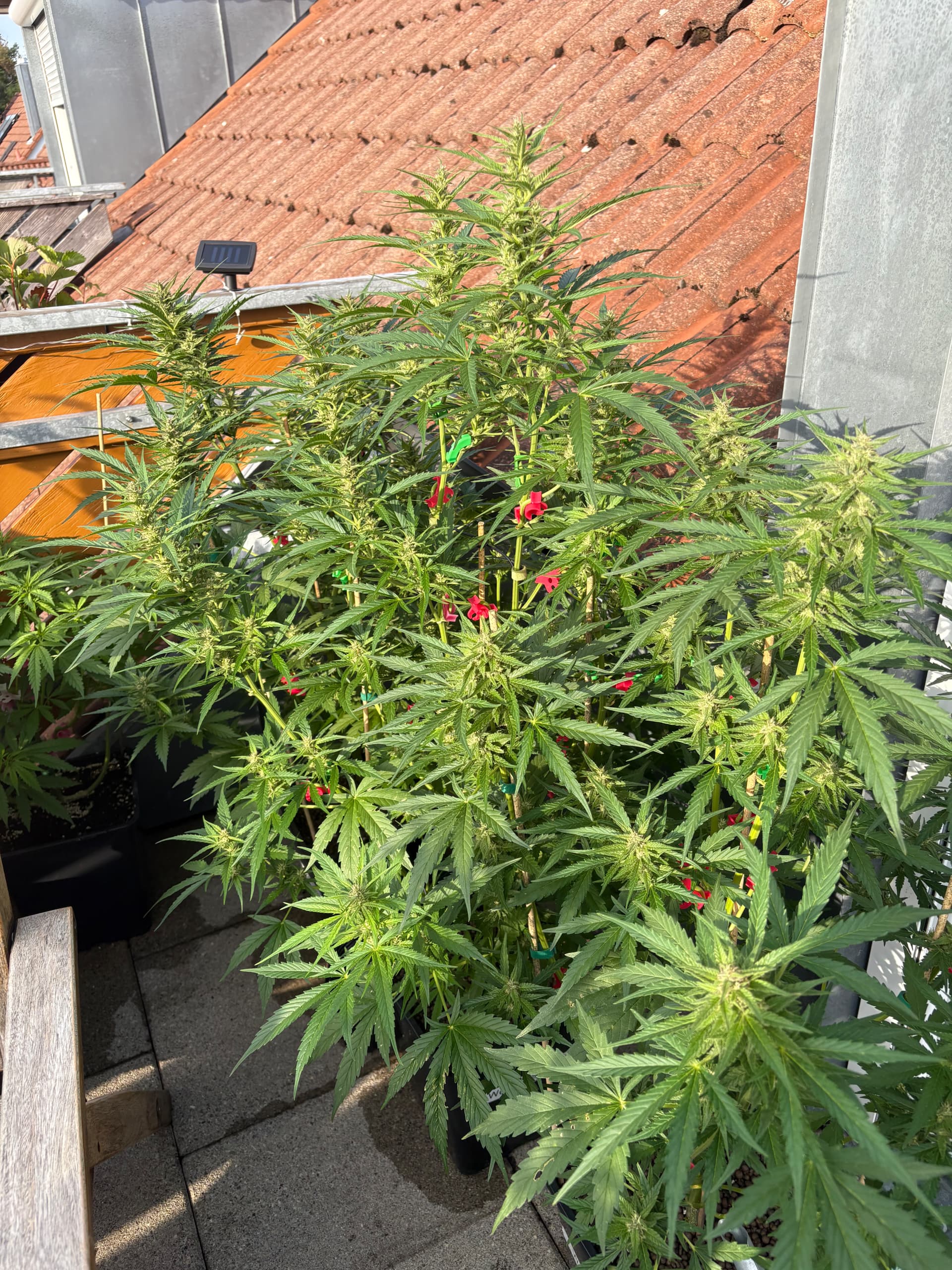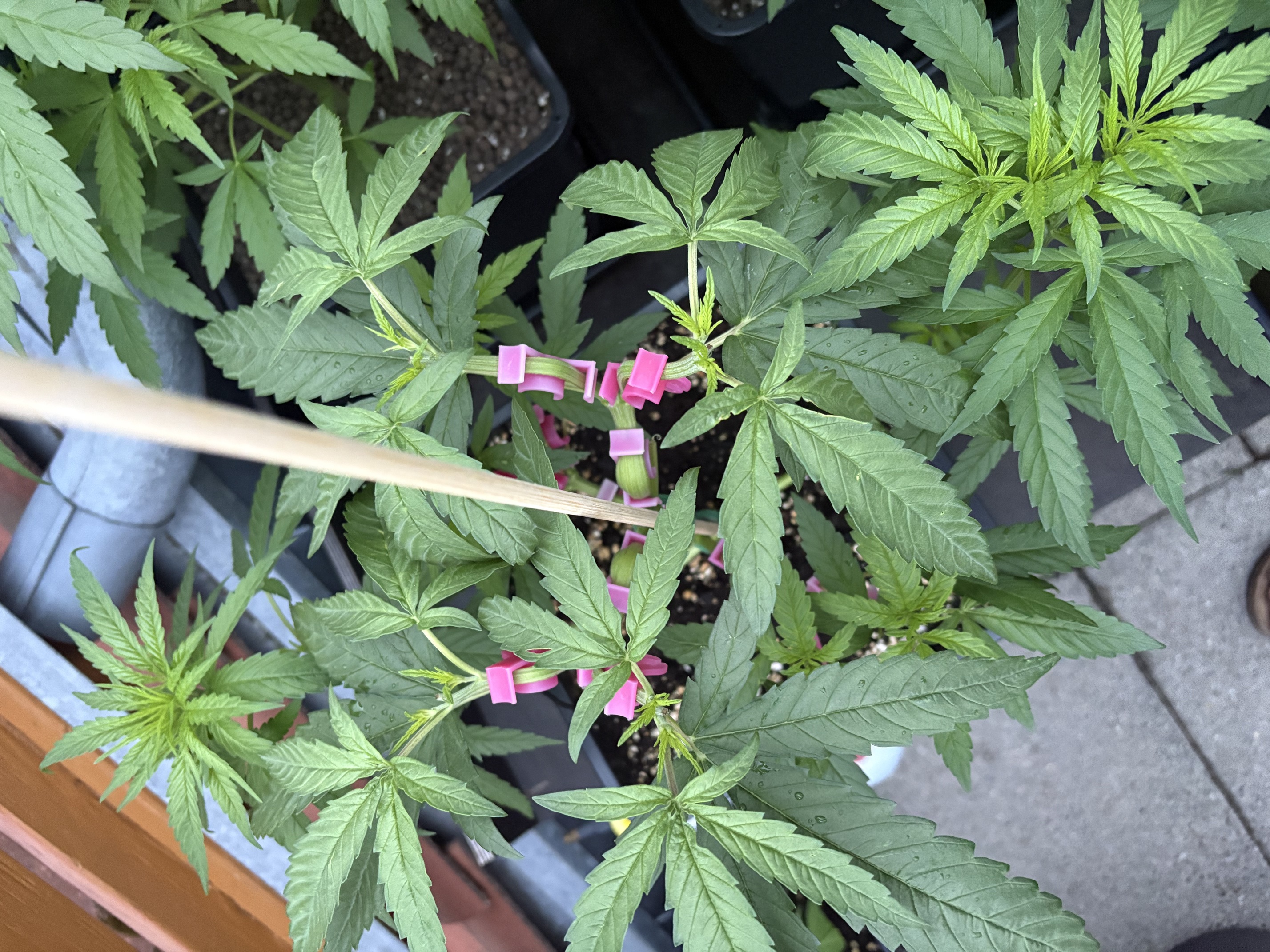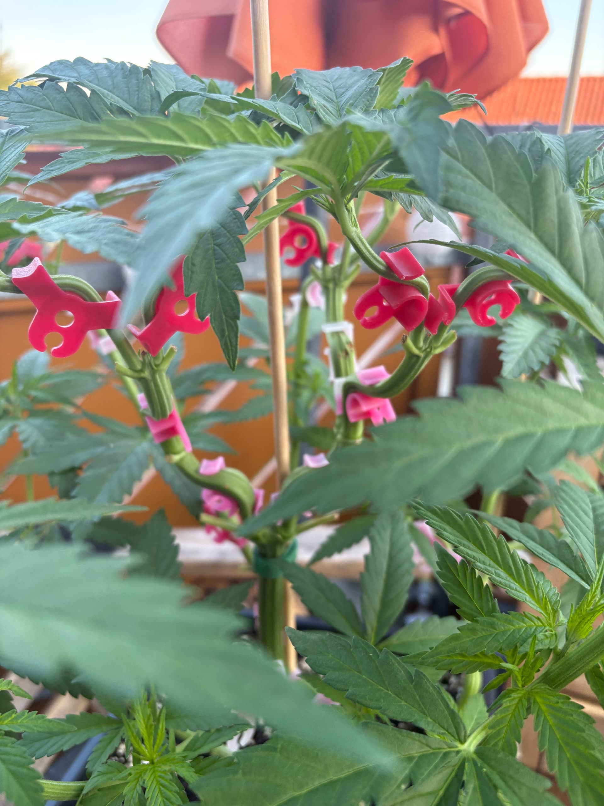 Recht unspektakulär bisher. Sie sind 15 Tage alt und wurden gestern und heute von 3l auf 11l umgetopft. Zwei davon wurden bisher einmal getoppt, eine schwächelt noch ein bisschen.