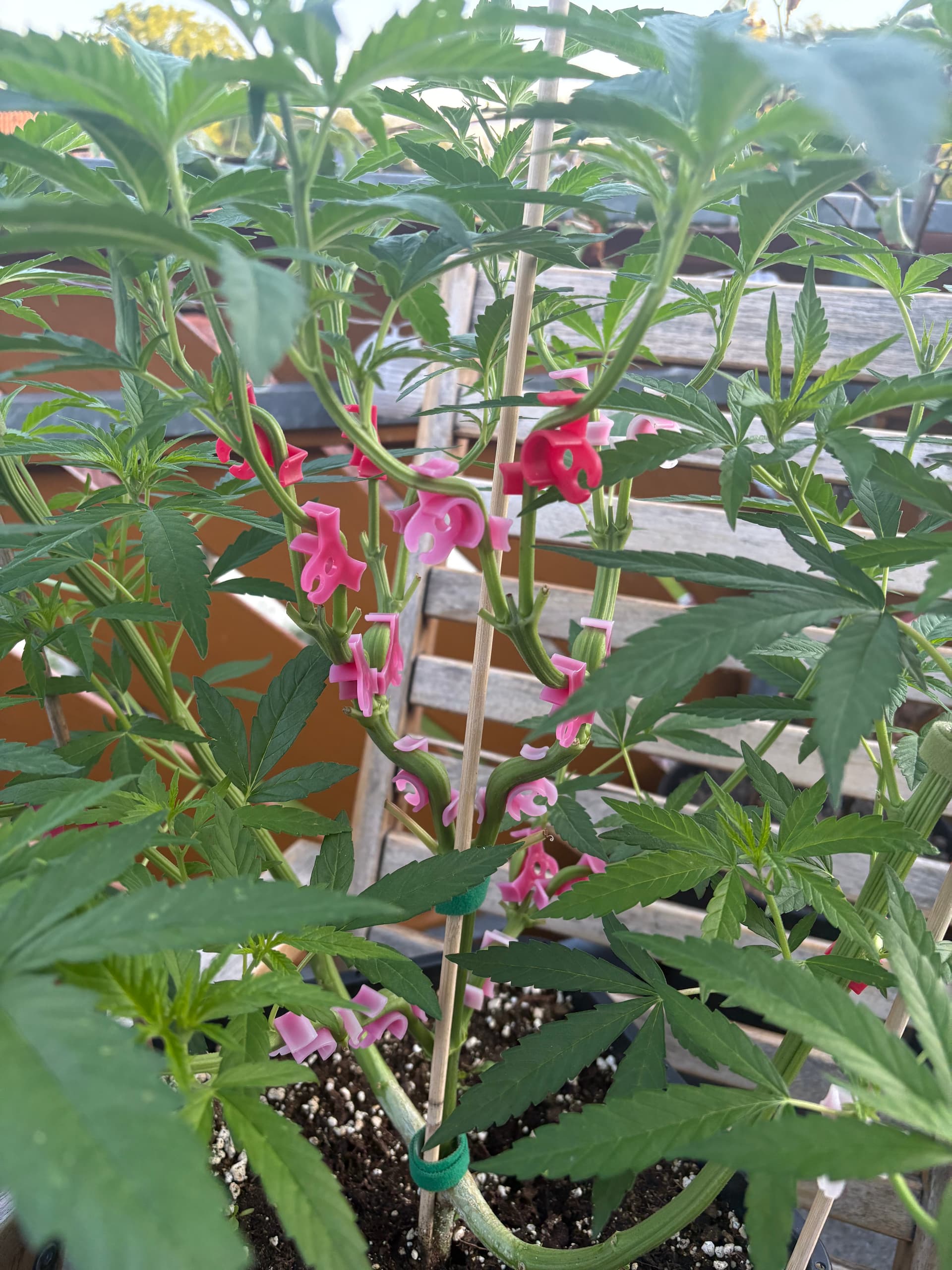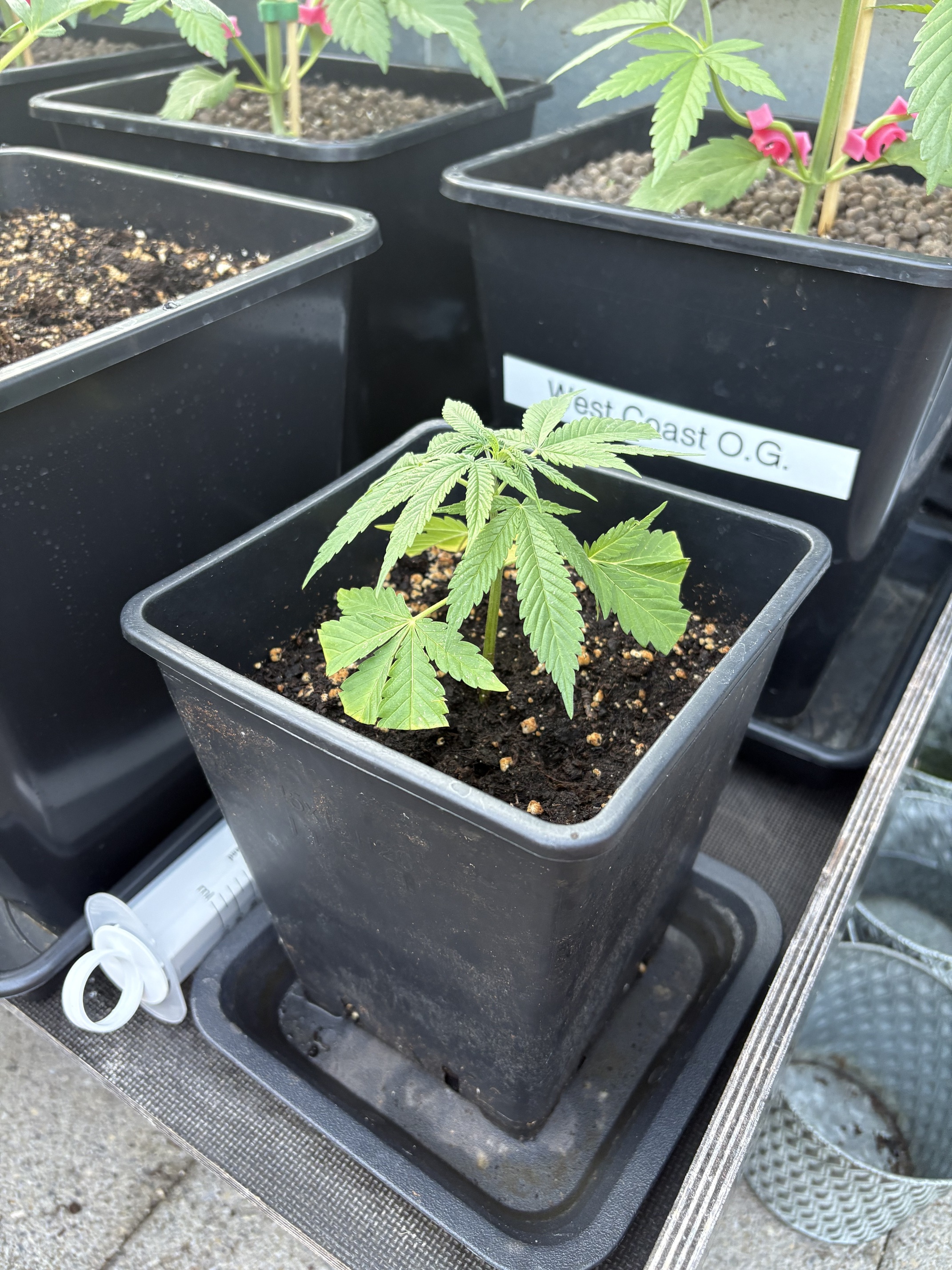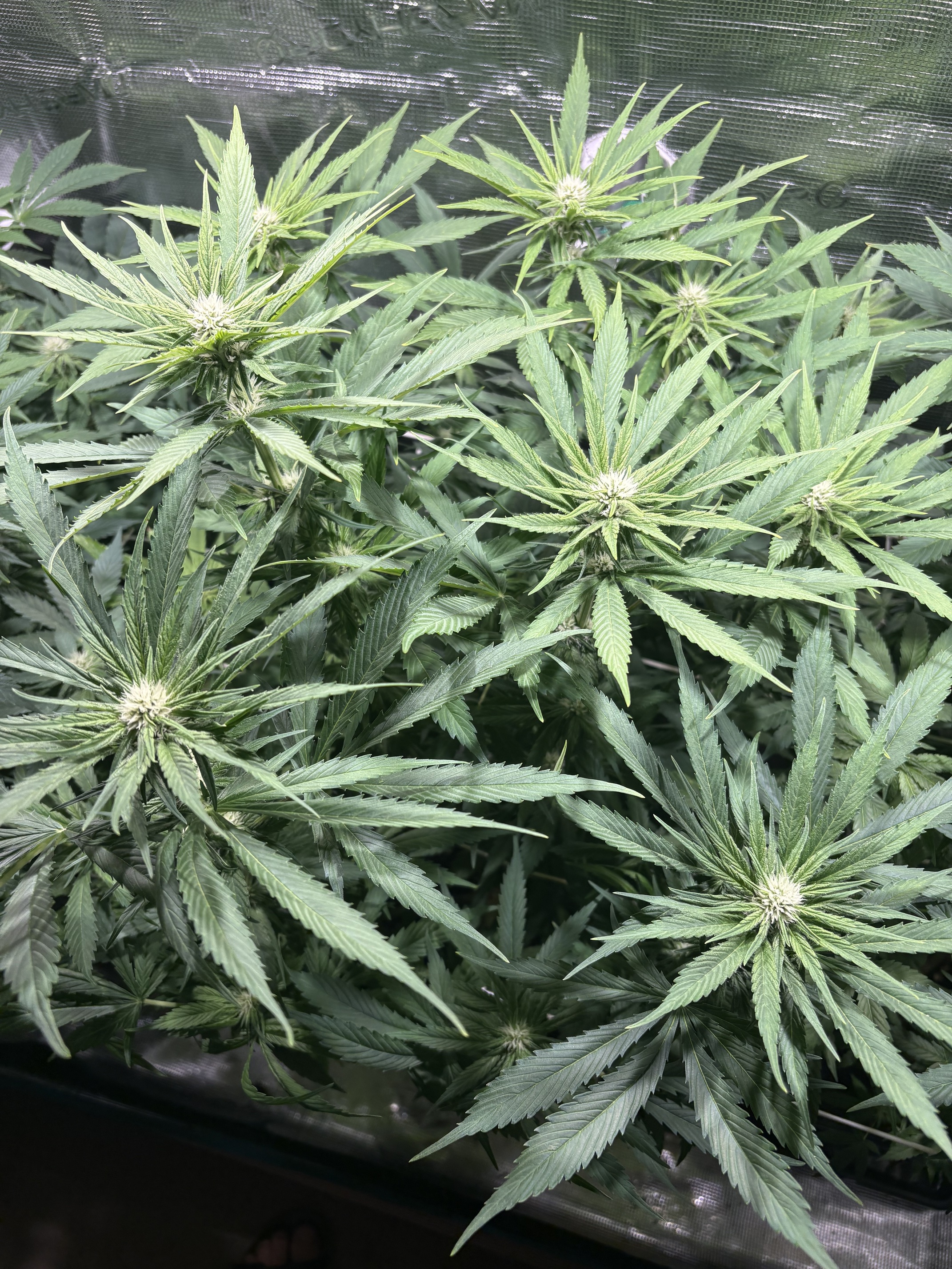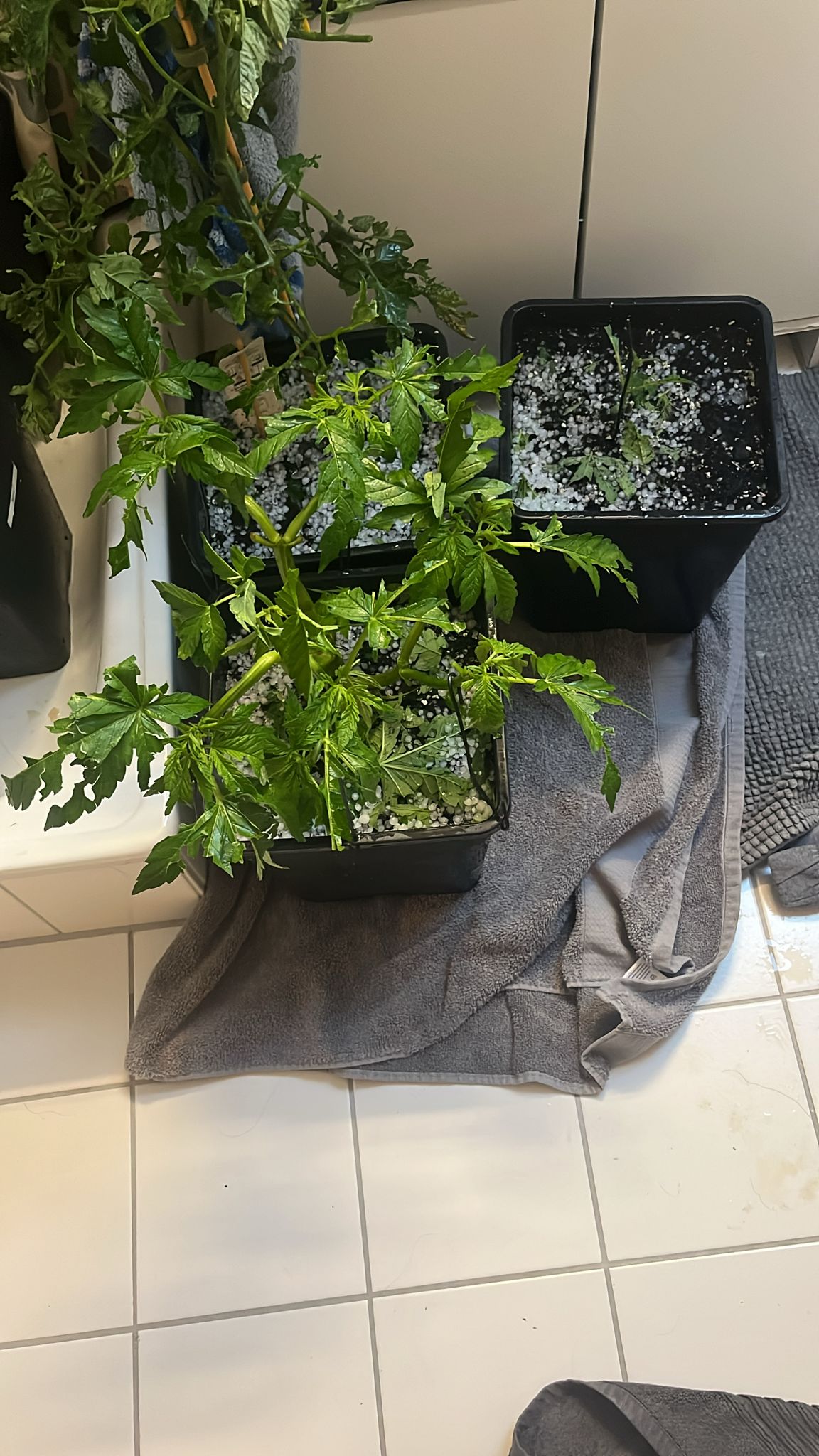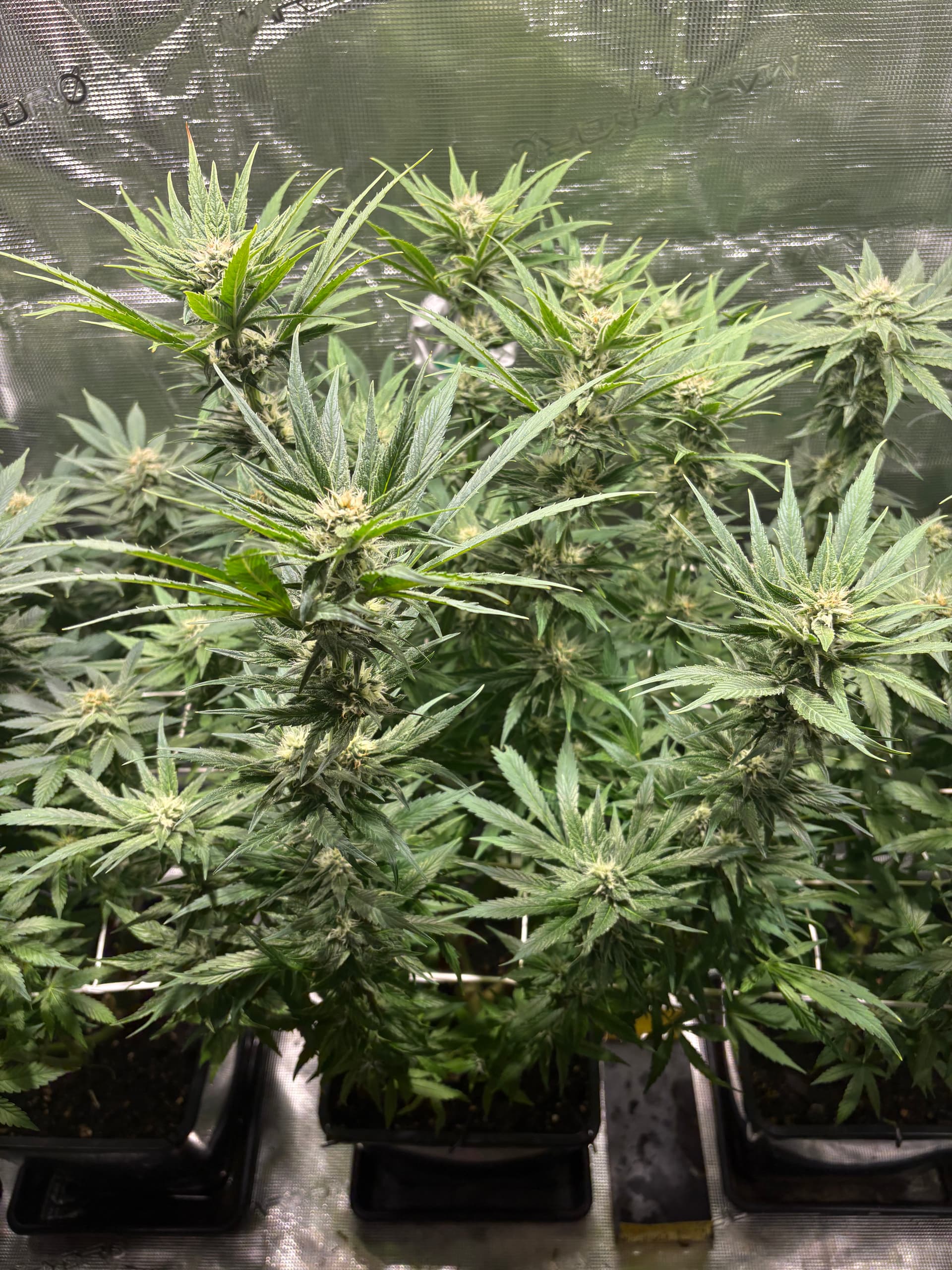 Recht unspektakulär bisher. Sie sind 15 Tage alt und wurden gestern und heute von 3l auf 11l umgetopft. Zwei davon wurden bisher einmal getoppt, eine schwächelt noch ein bisschen.