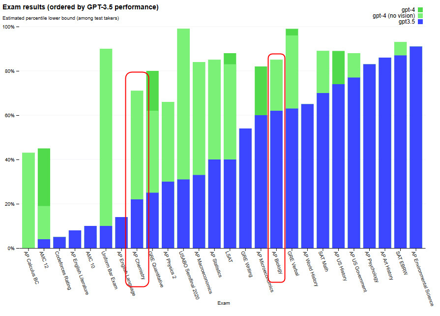 In Chemie ist GPT3.5 eigentlich noch extrem beschissen und in Bio so lala, 60% gerade mal im Benchmark