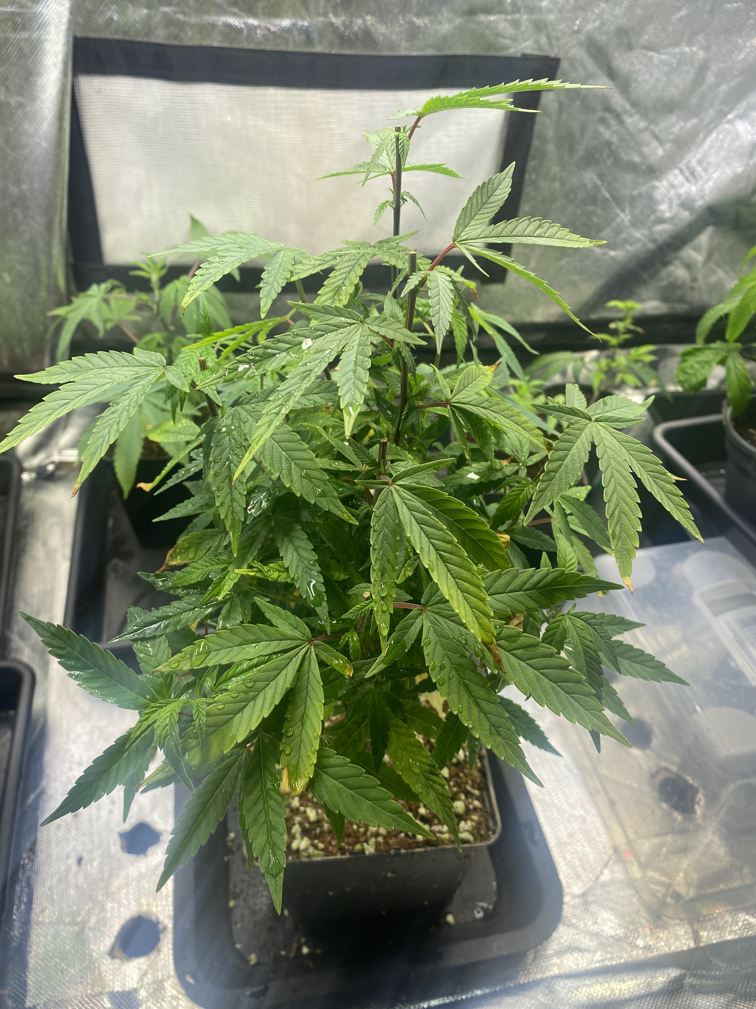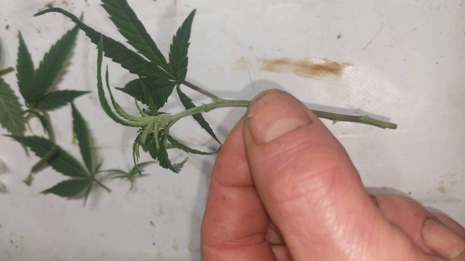 Hier haben wir einmal die Exodus Cheese Mama. Extra nicht paar Tage gegoßen, damit die Clone schön nach Wasser suchen. Hier muss man mMn etwas den Sweetspot finden. Sollte auch hungrig sein was den Dünger angeht, aber sollte genug in den Blättern haben dass diese nicht gelb werden vor dem Wurzeln.