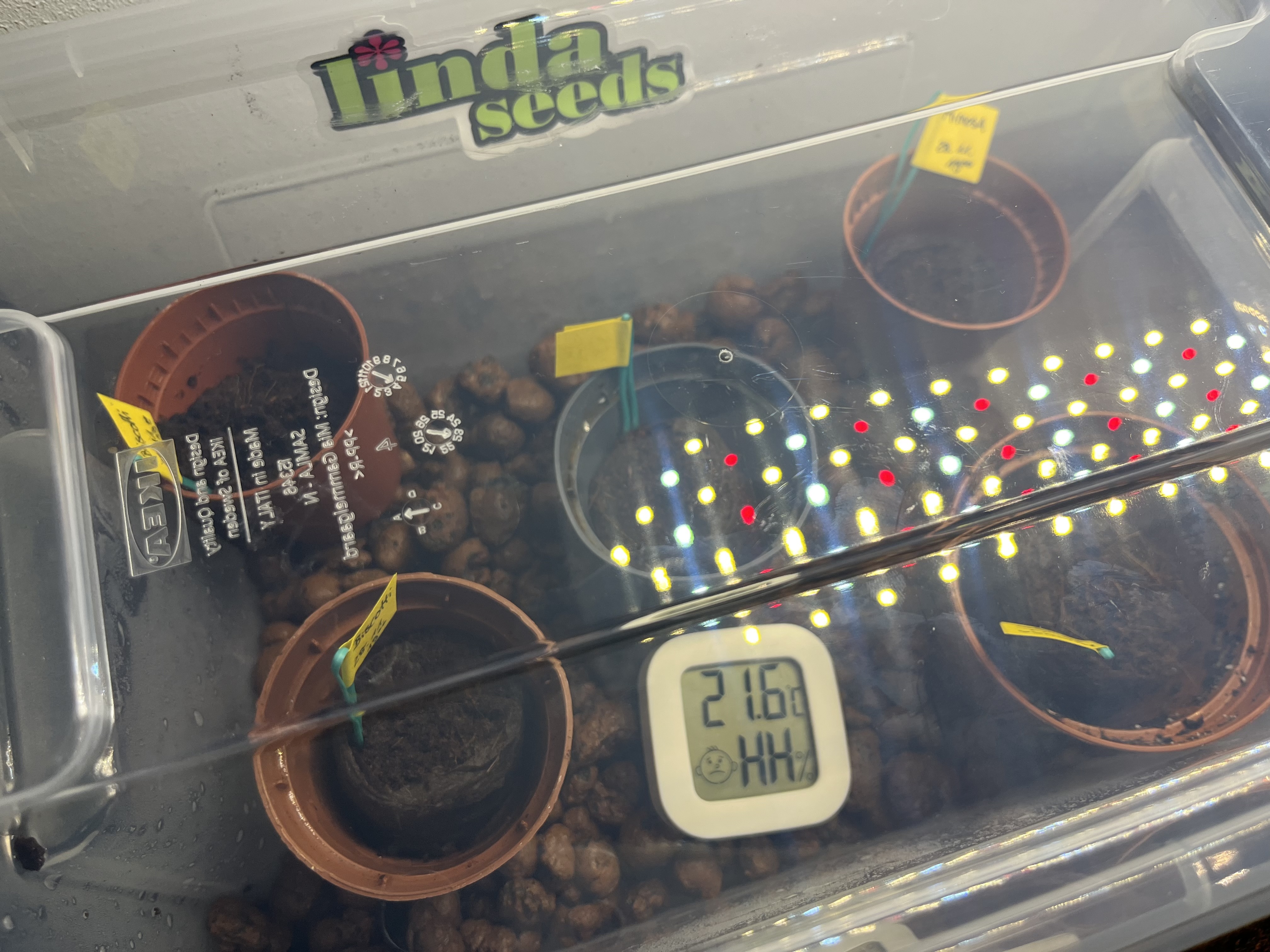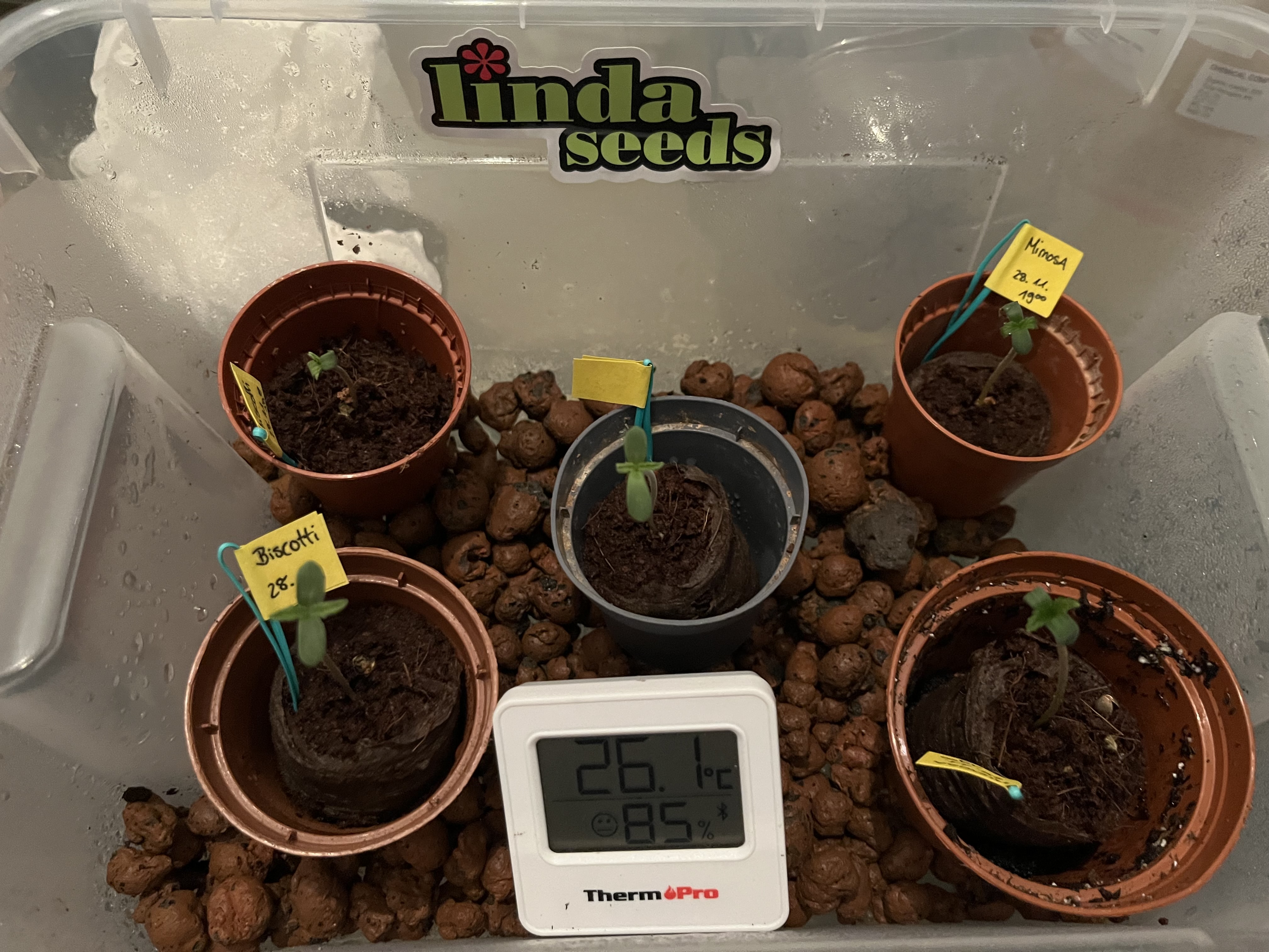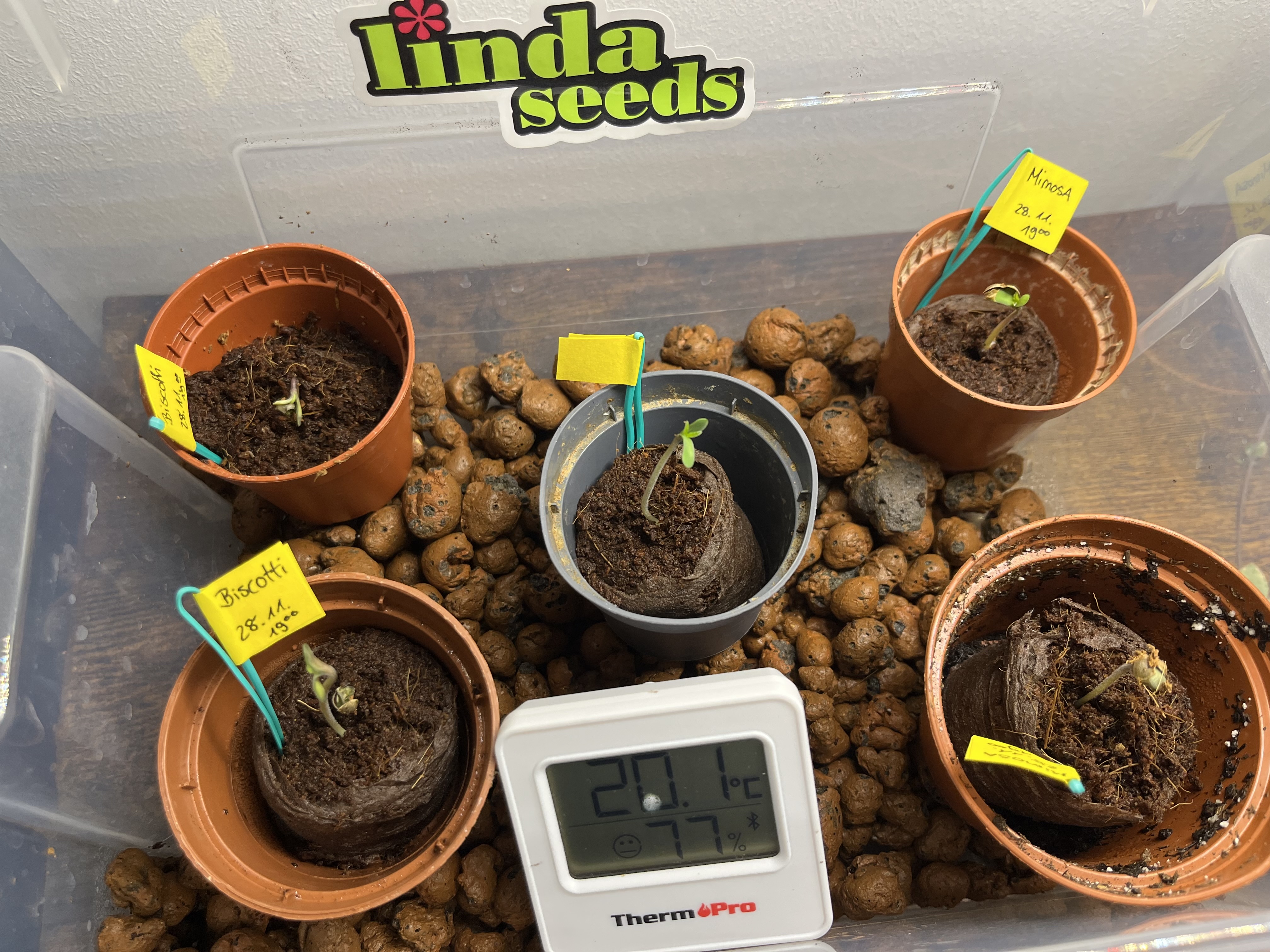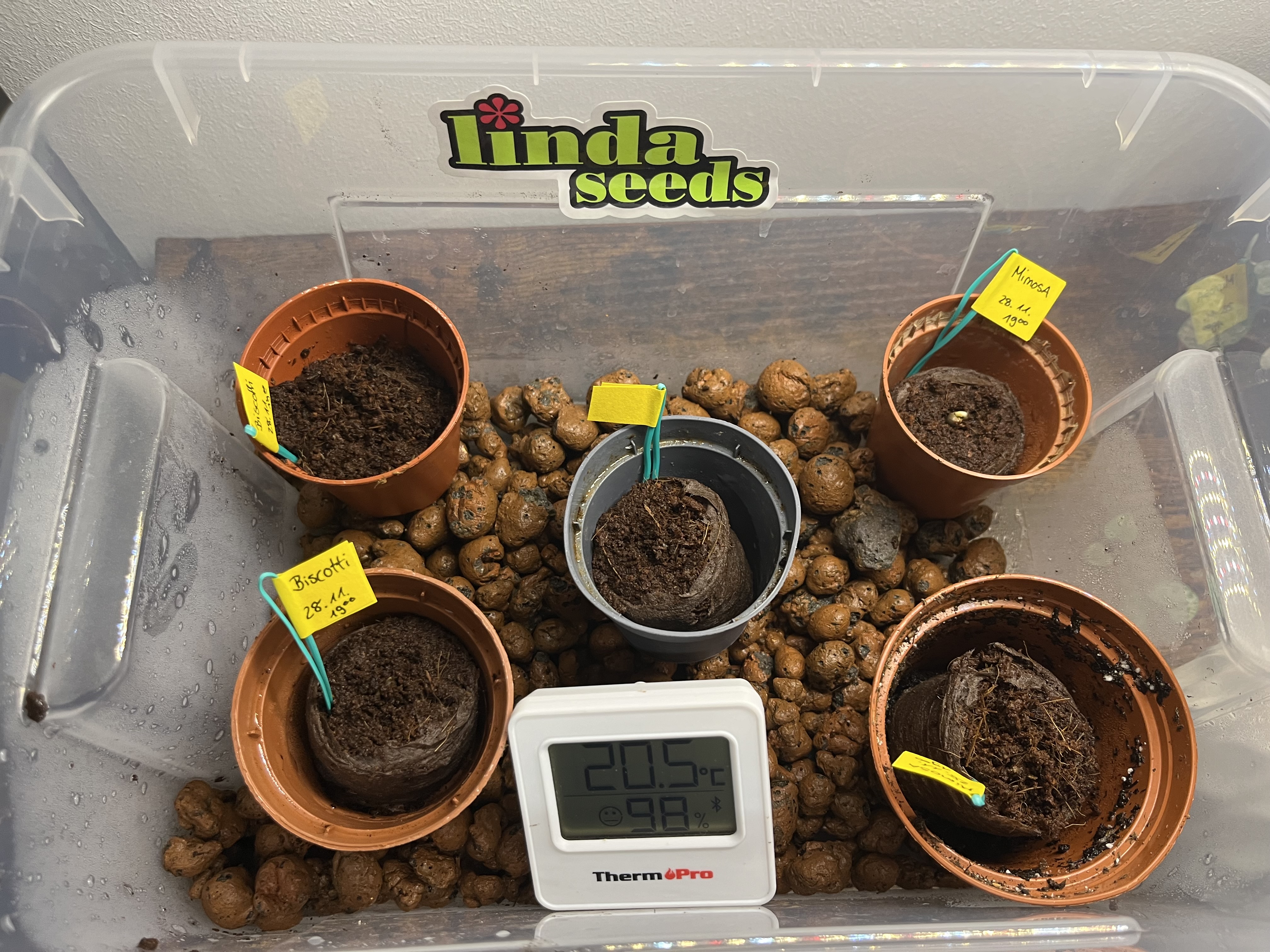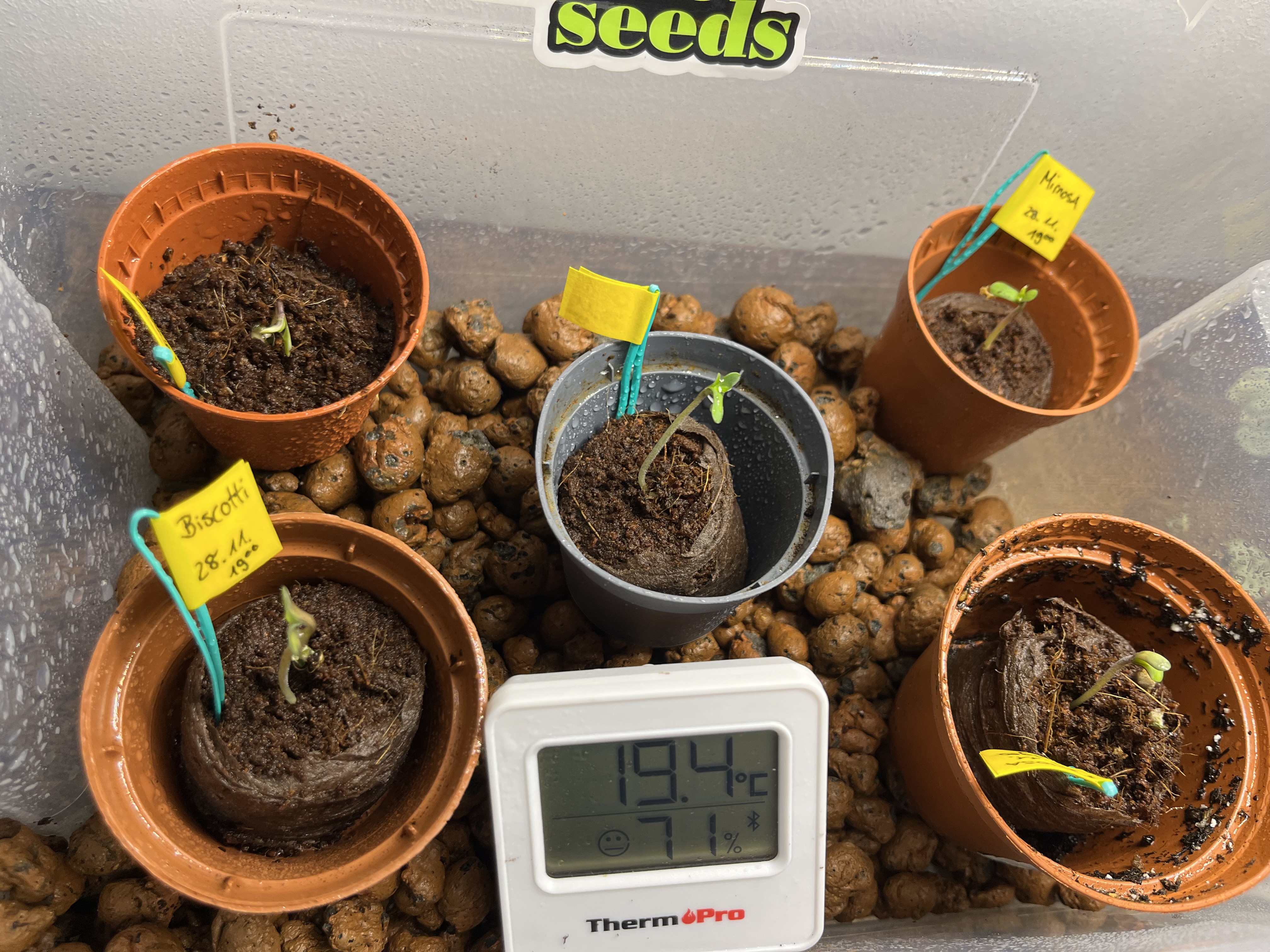 Die Samen sind jetzt 12h in der Erde, in der Box herrschen angenehme 20°C und 98%RLF.