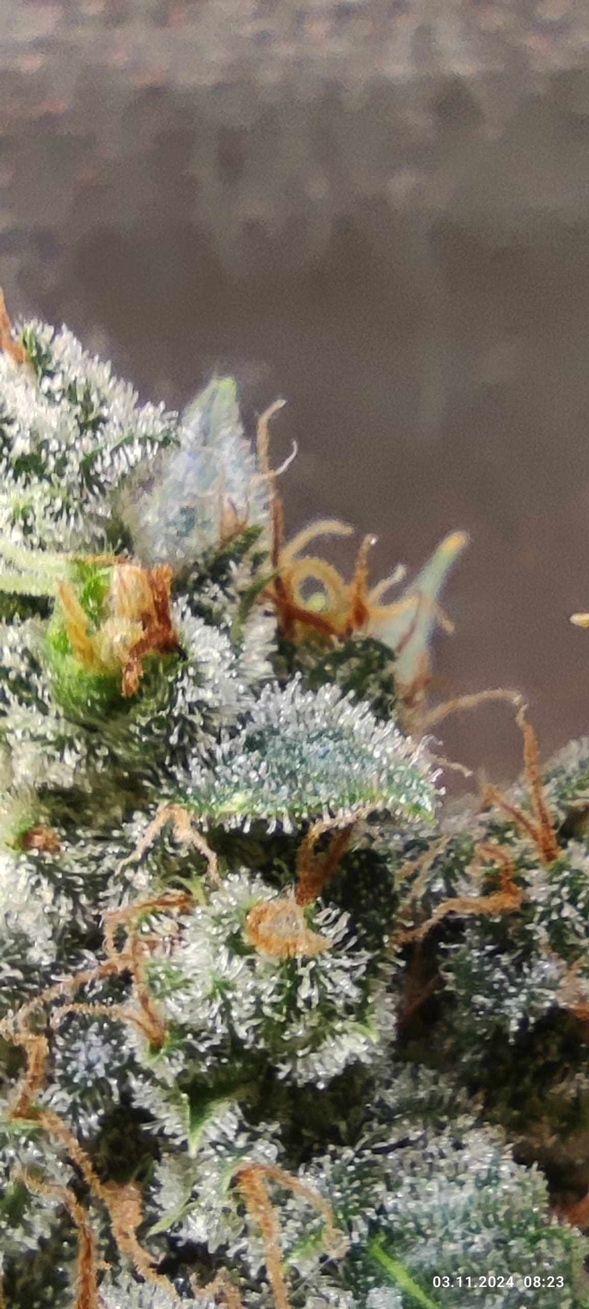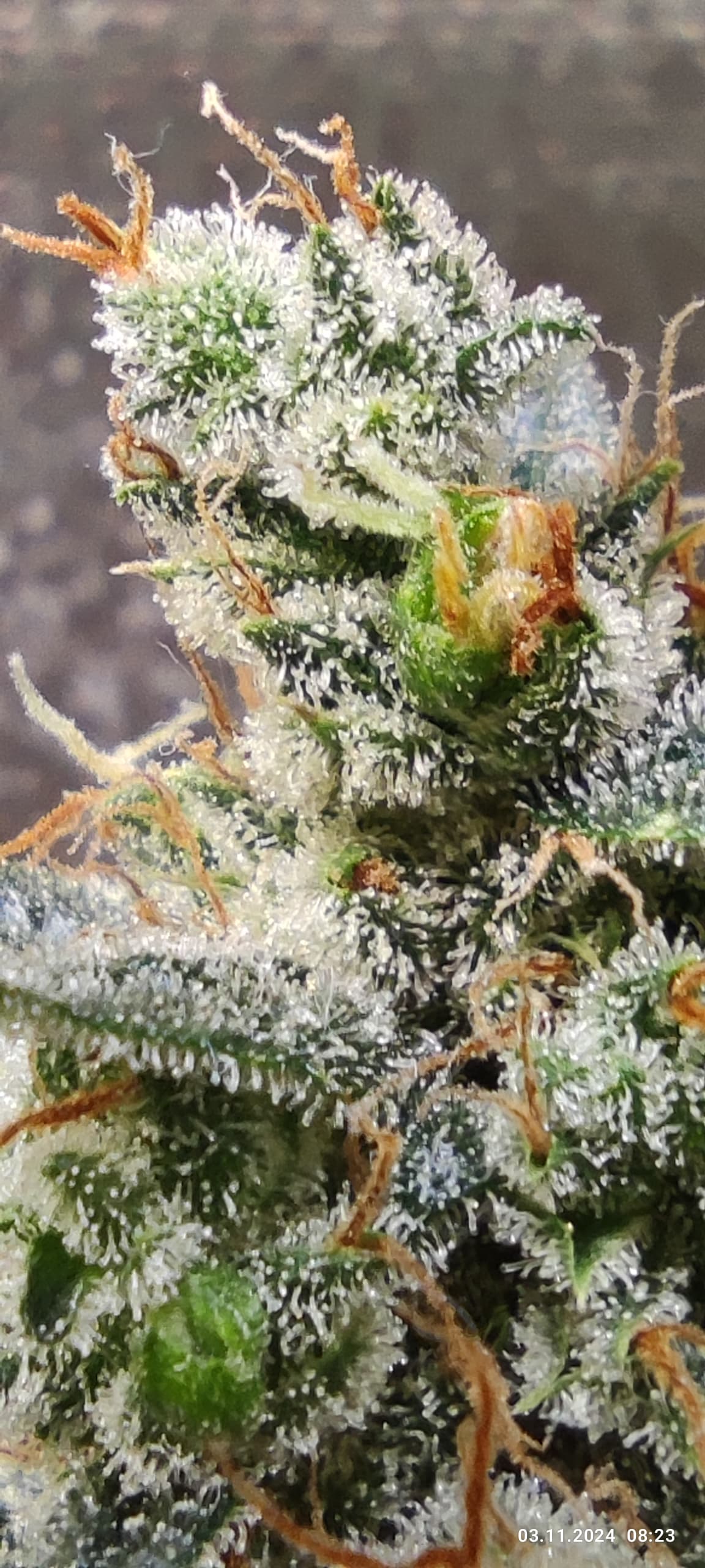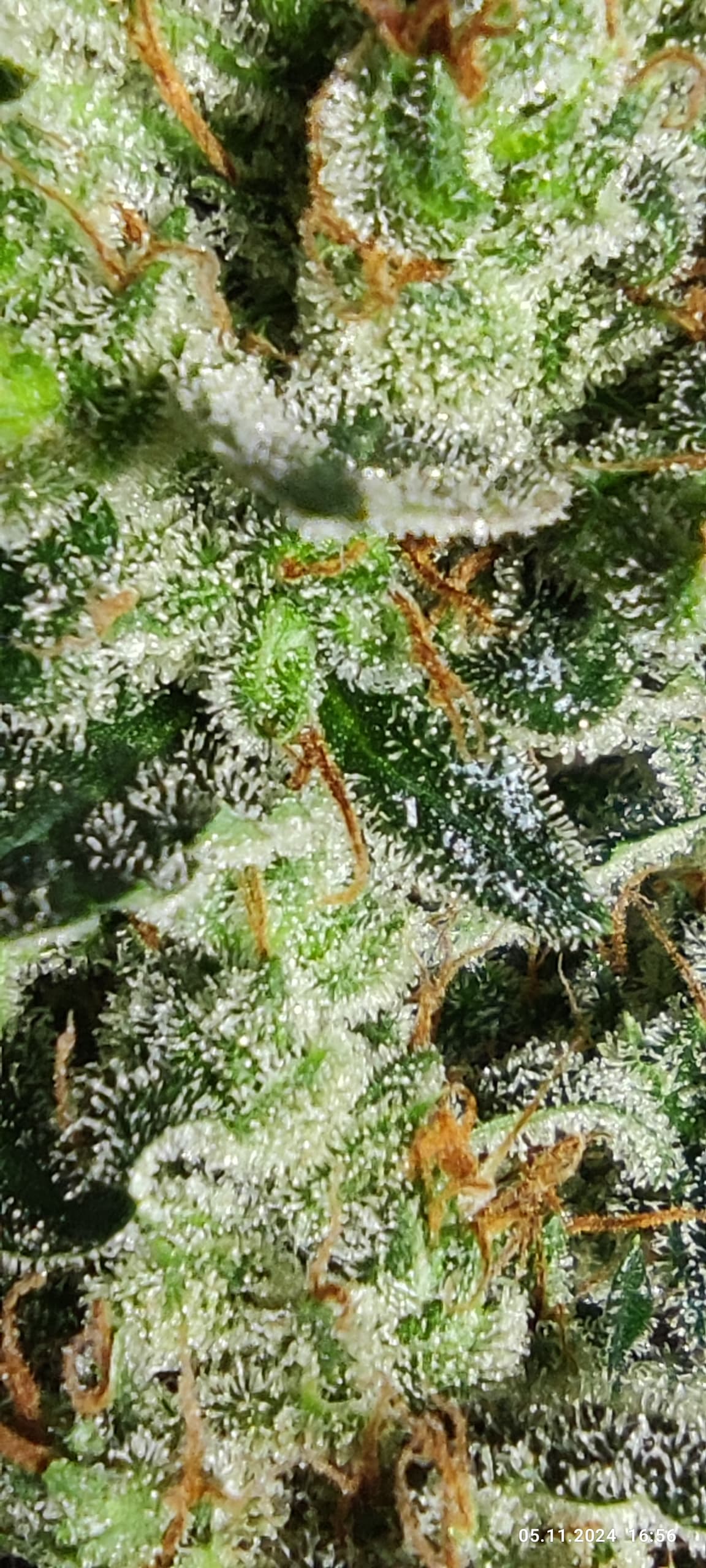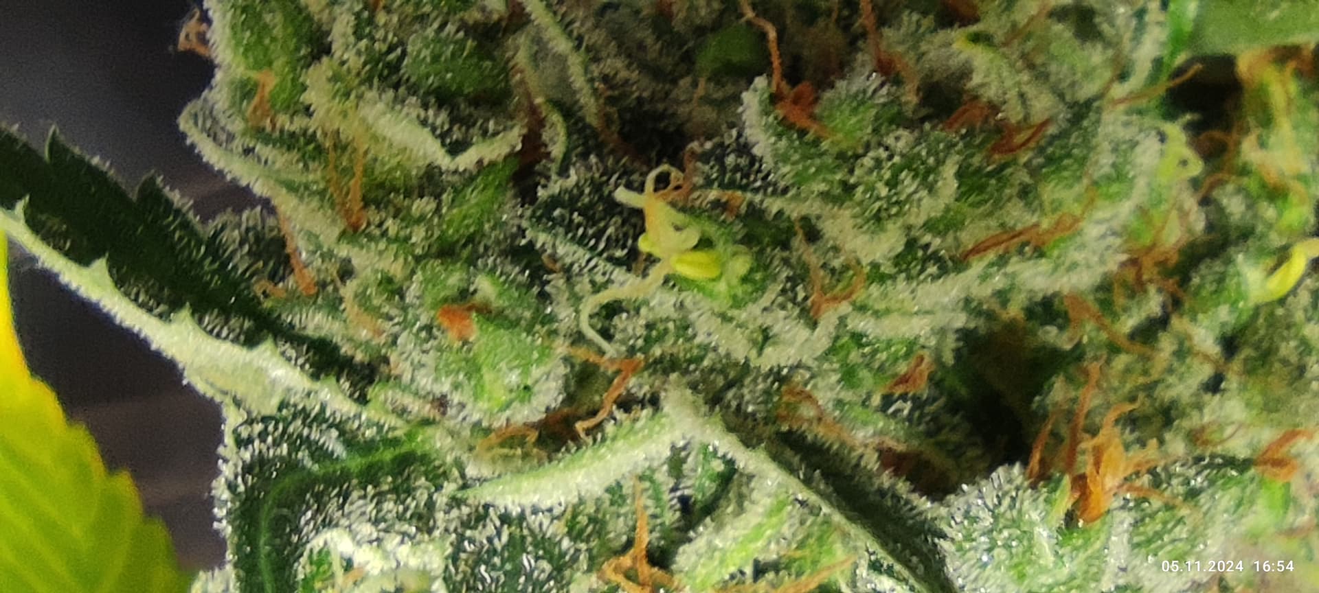Habe Runtz und GG4 im Zelt (Photos), befinde mich am Ende der 7. Blütewoche (Breederangaben 8-9 Wochen), die Trichome sind 70% milchig und 30% glasig. Die Runtz haben 80% braune Haare auf den Buds, die GG4 nur ca 30% braune Haare (denke die brauchen auch länger)