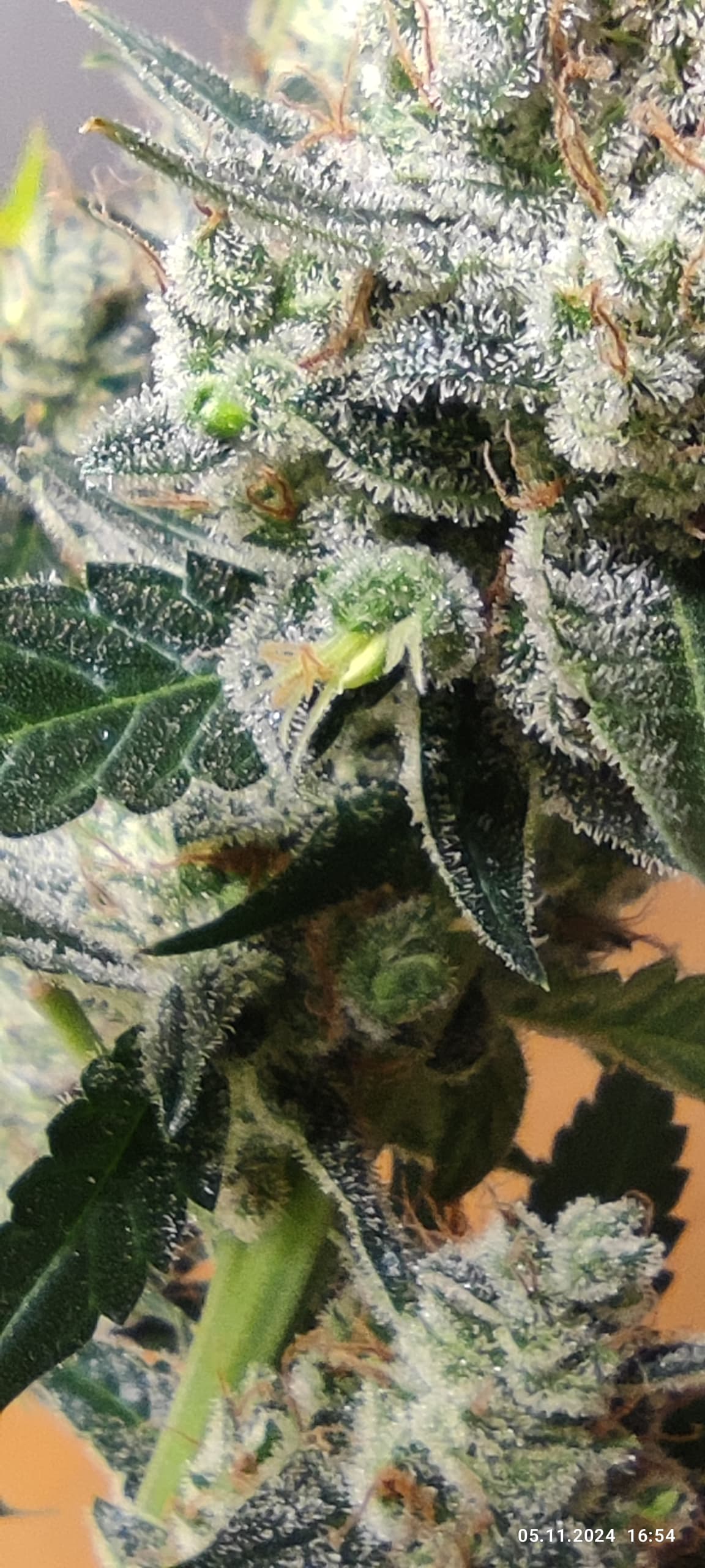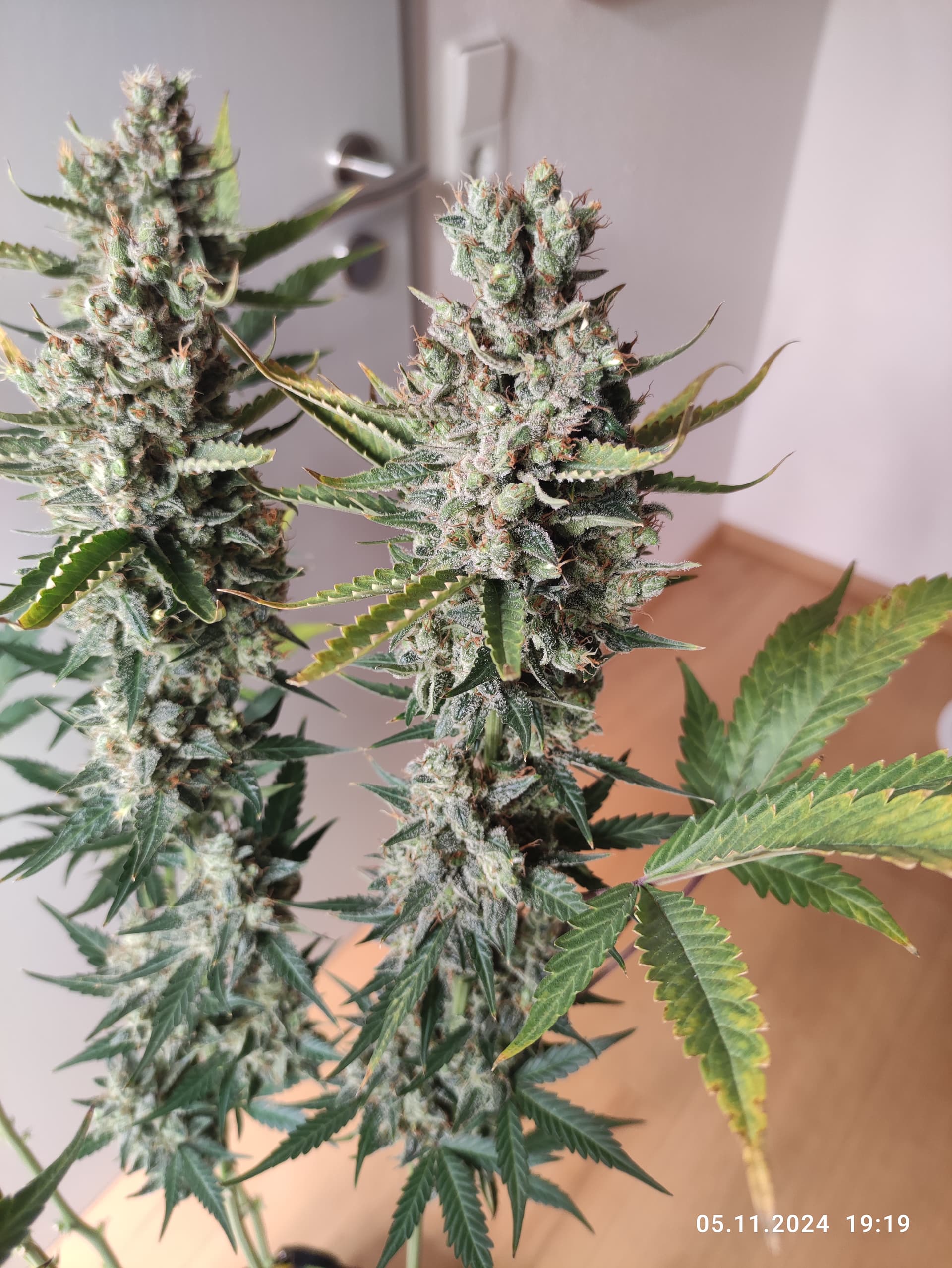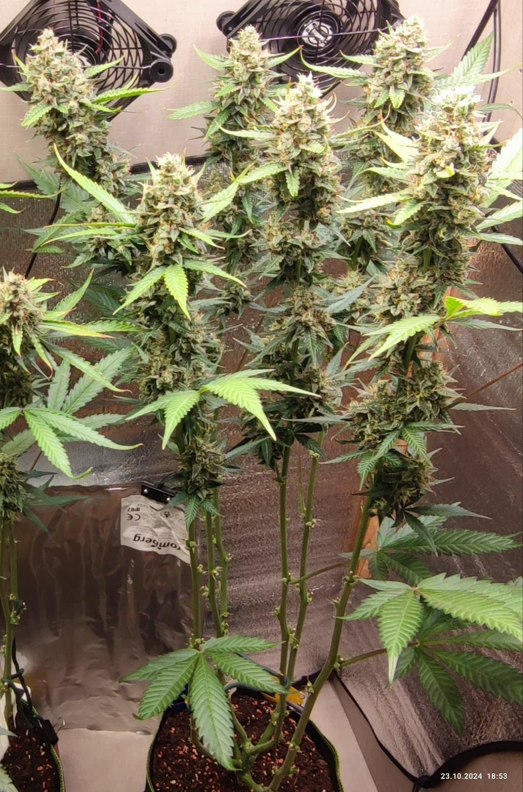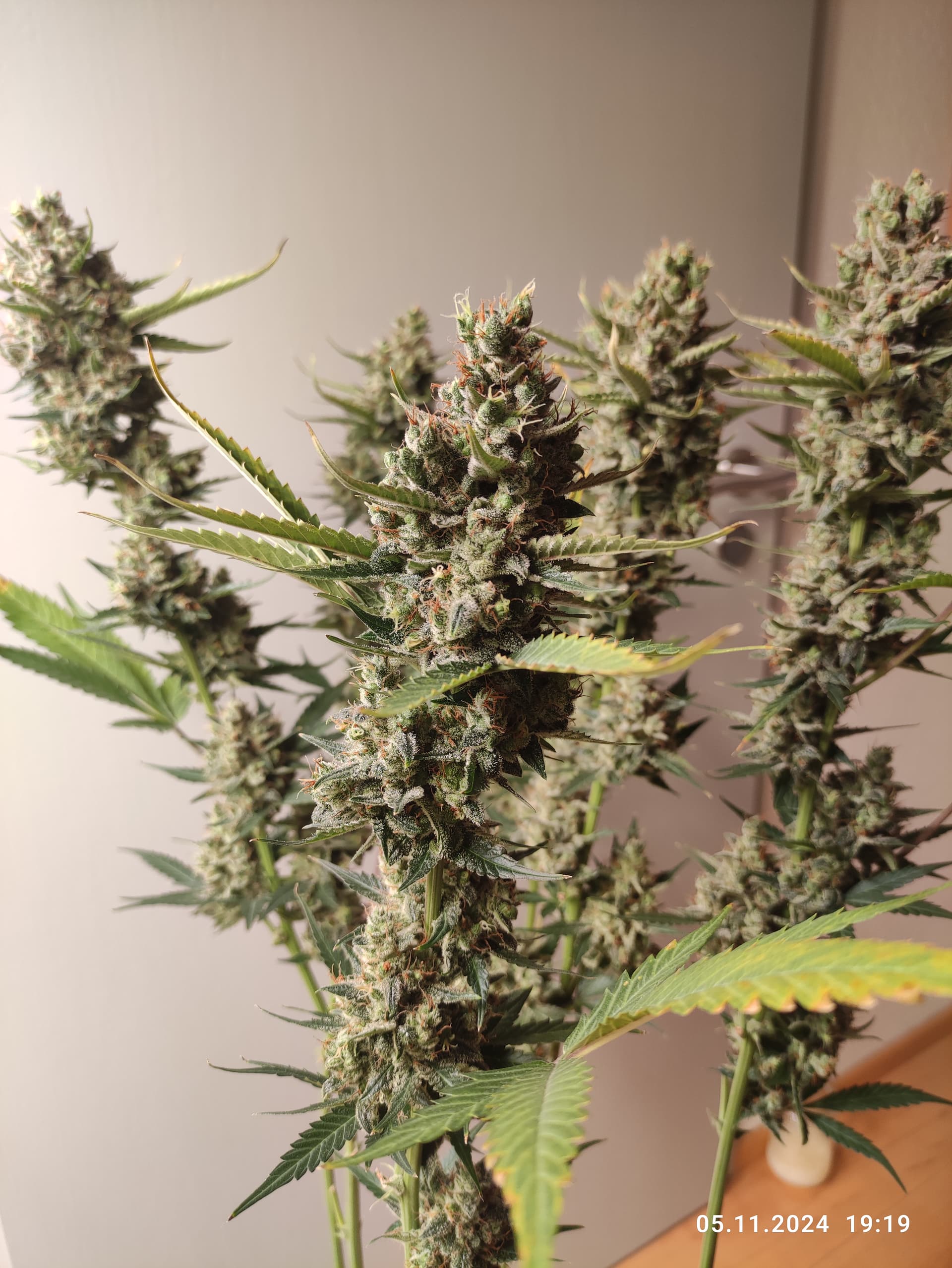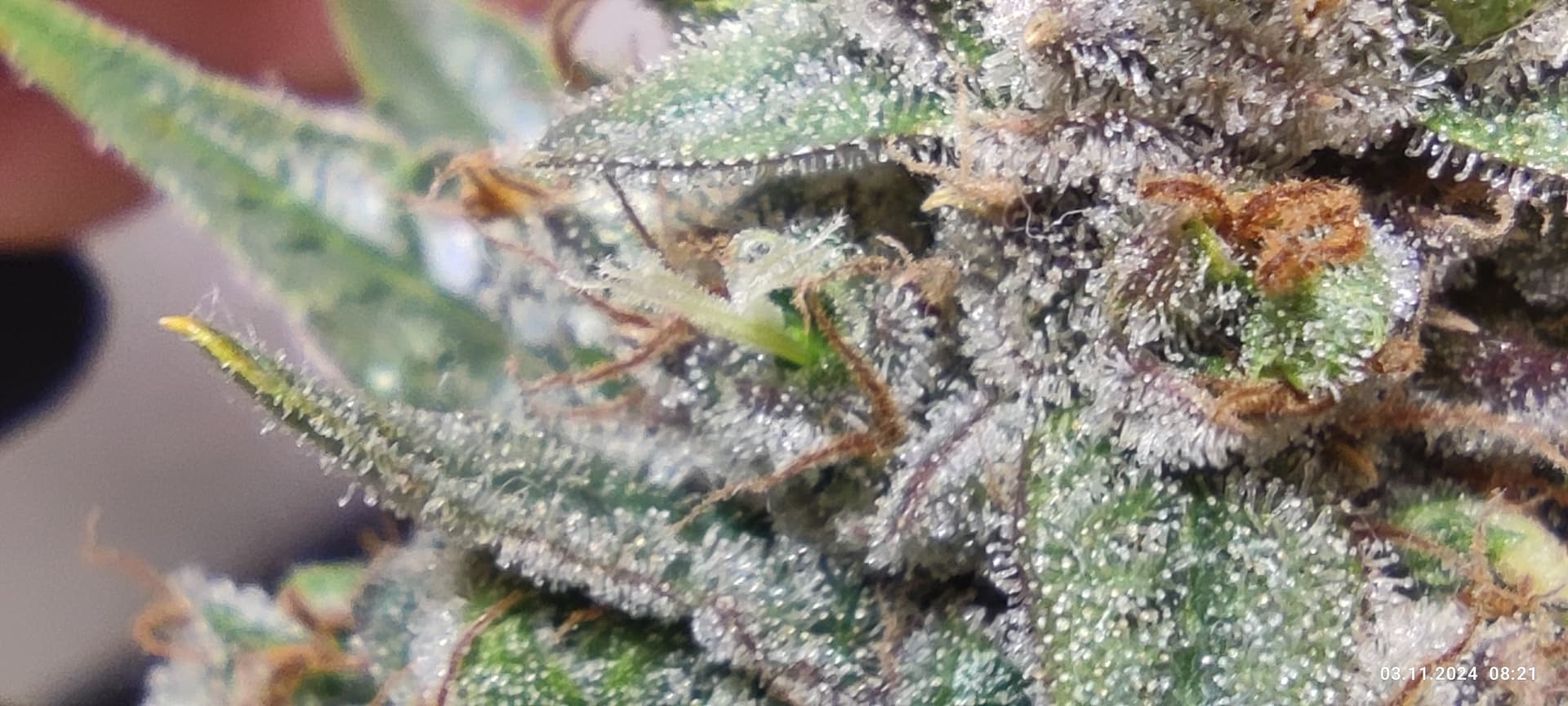 Habe Runtz und GG4 im Zelt (Photos), befinde mich am Ende der 7. Blütewoche (Breederangaben 8-9 Wochen), die Trichome sind 70% milchig und 30% glasig. Die Runtz haben 80% braune Haare auf den Buds, die GG4 nur ca 30% braune Haare (denke die brauchen auch länger)