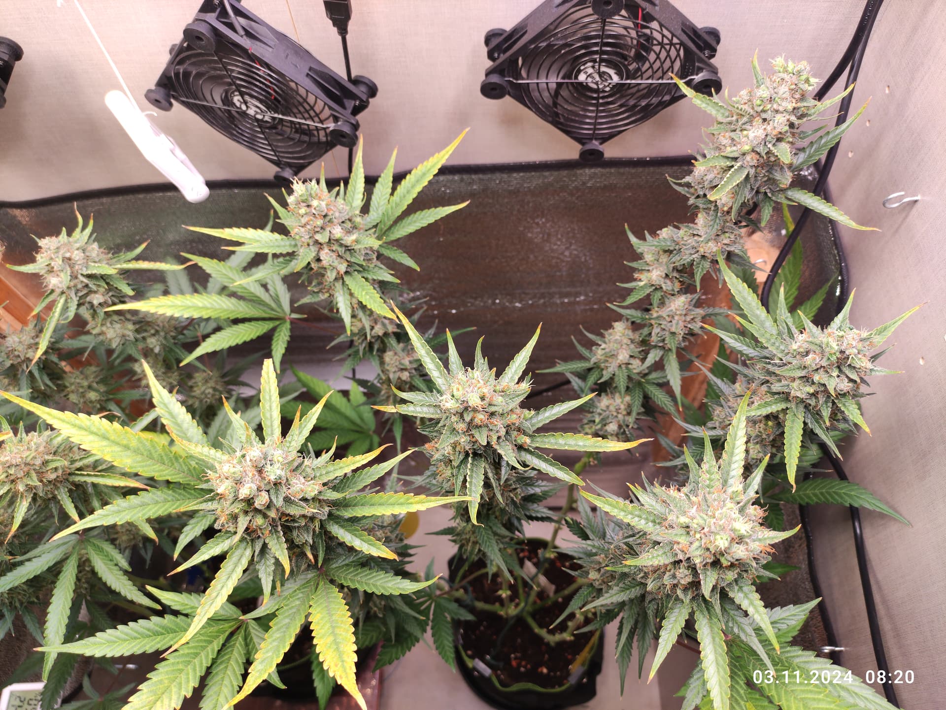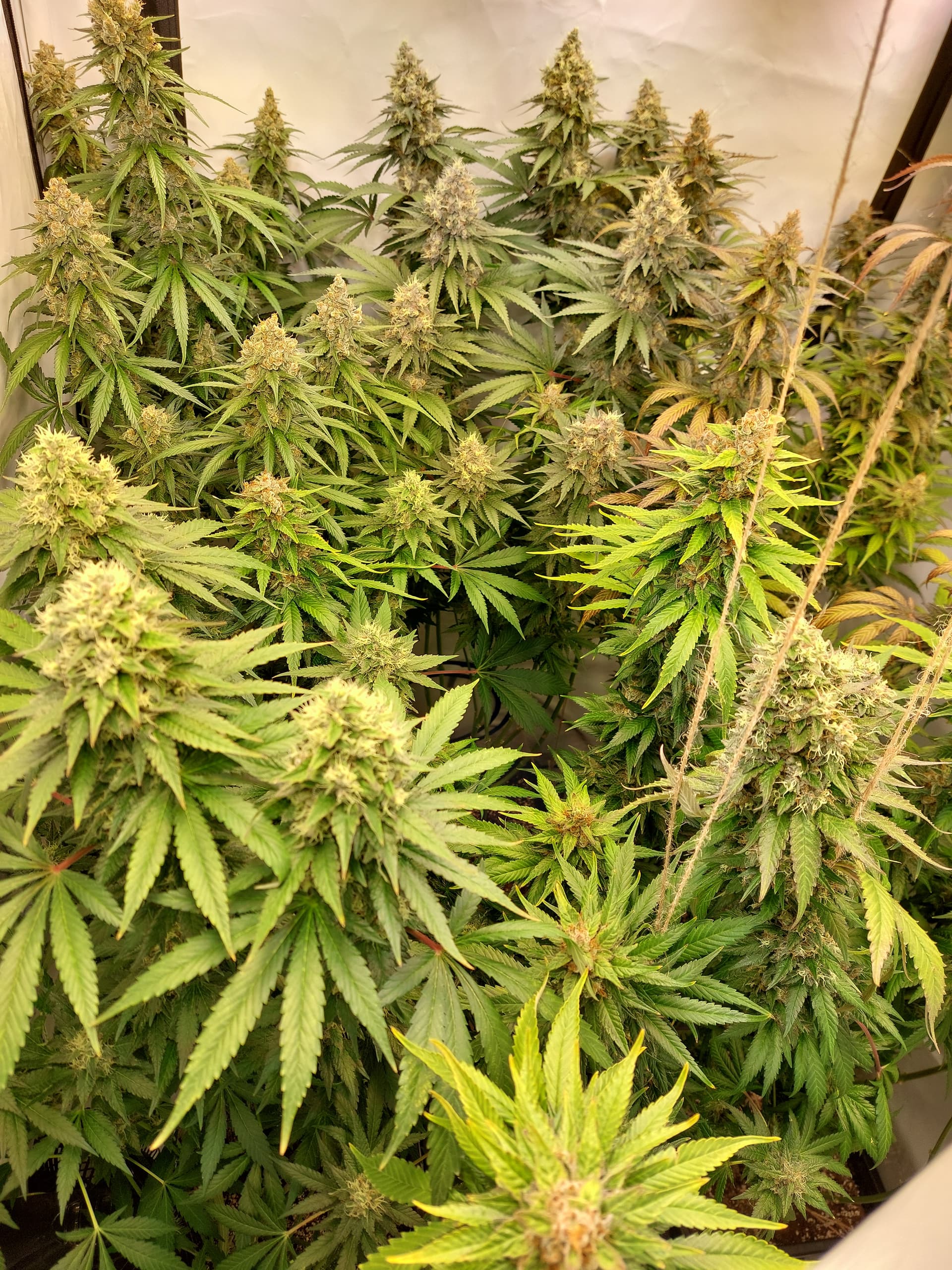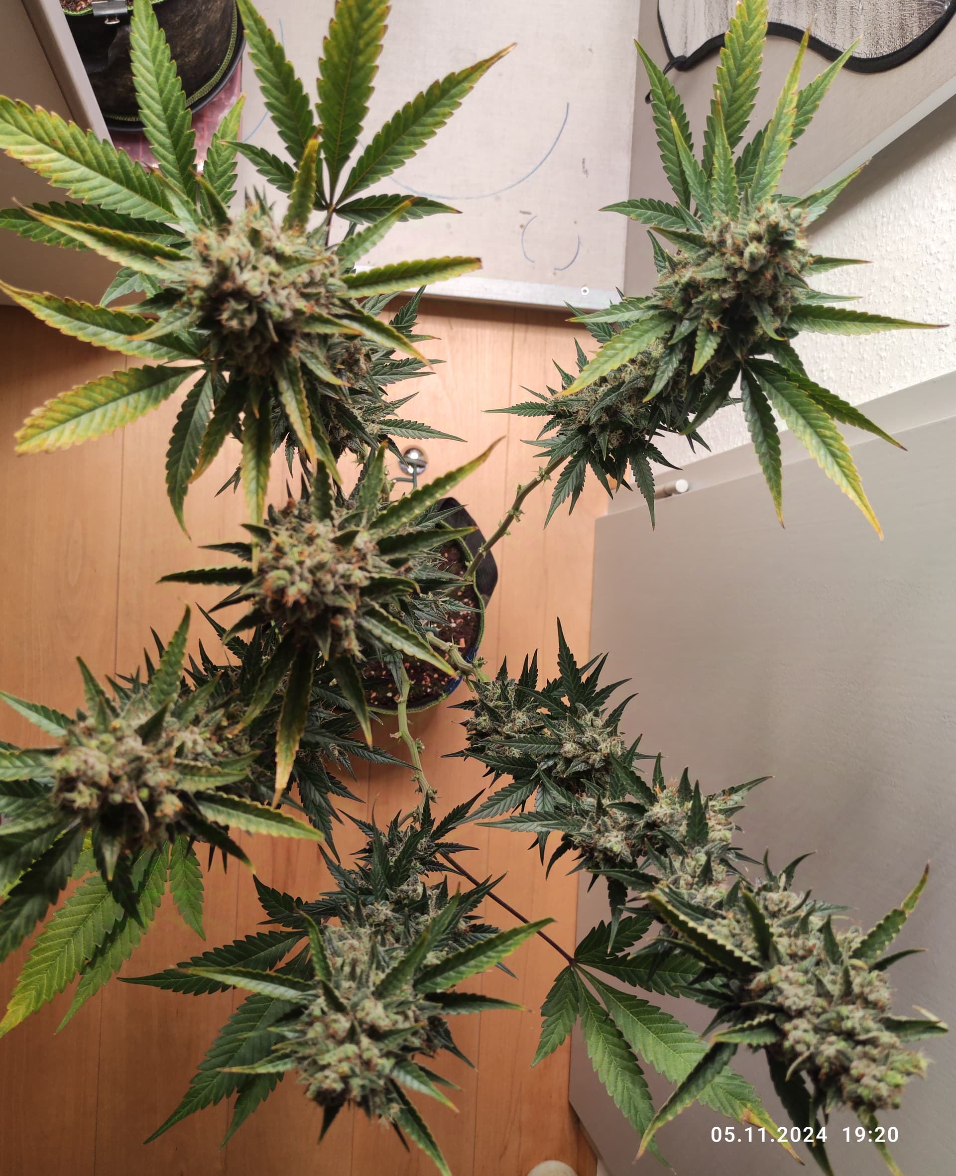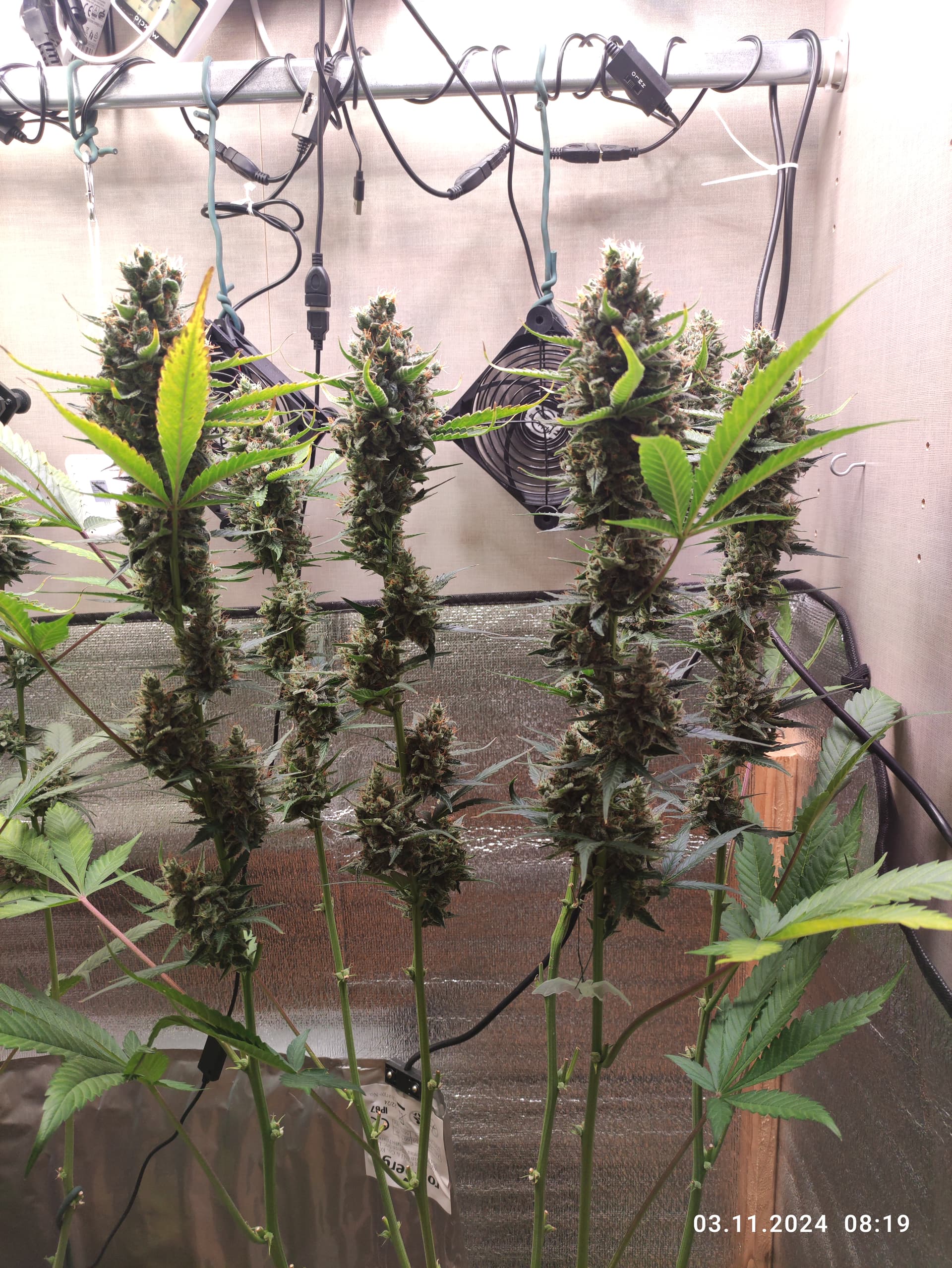 Habe Runtz und GG4 im Zelt (Photos), befinde mich am Ende der 7. Blütewoche (Breederangaben 8-9 Wochen), die Trichome sind 70% milchig und 30% glasig. Die Runtz haben 80% braune Haare auf den Buds, die GG4 nur ca 30% braune Haare (denke die brauchen auch länger)