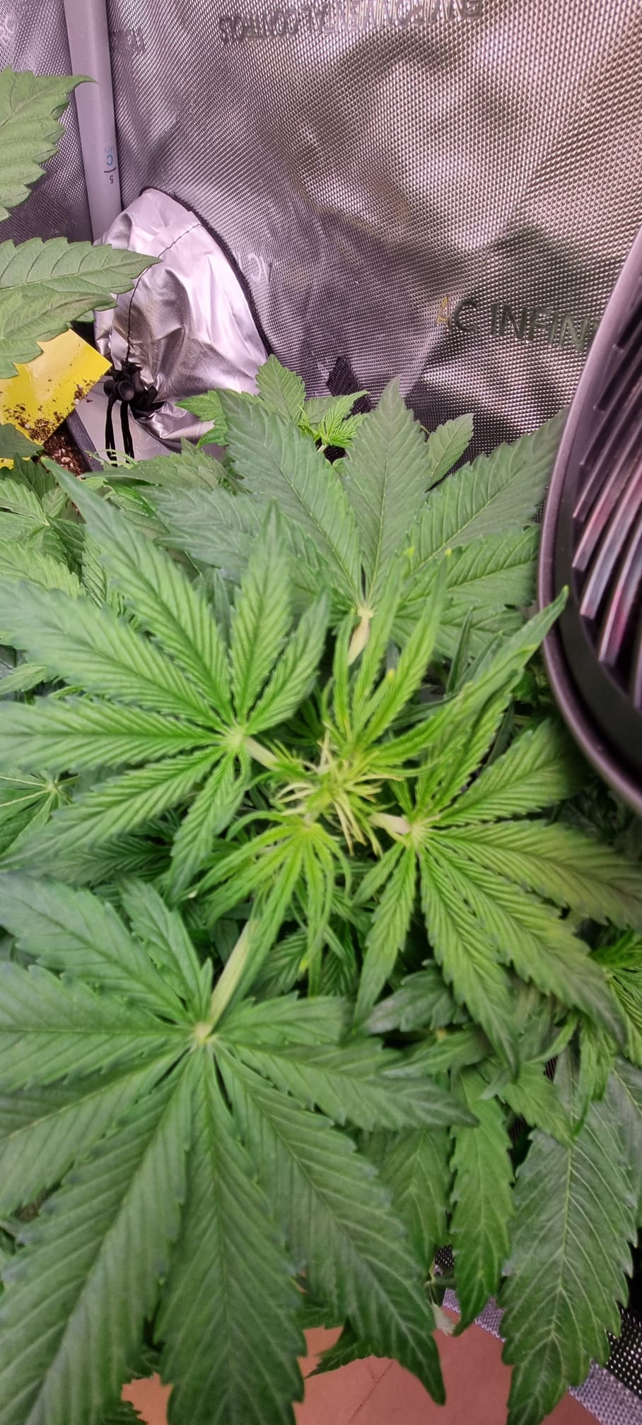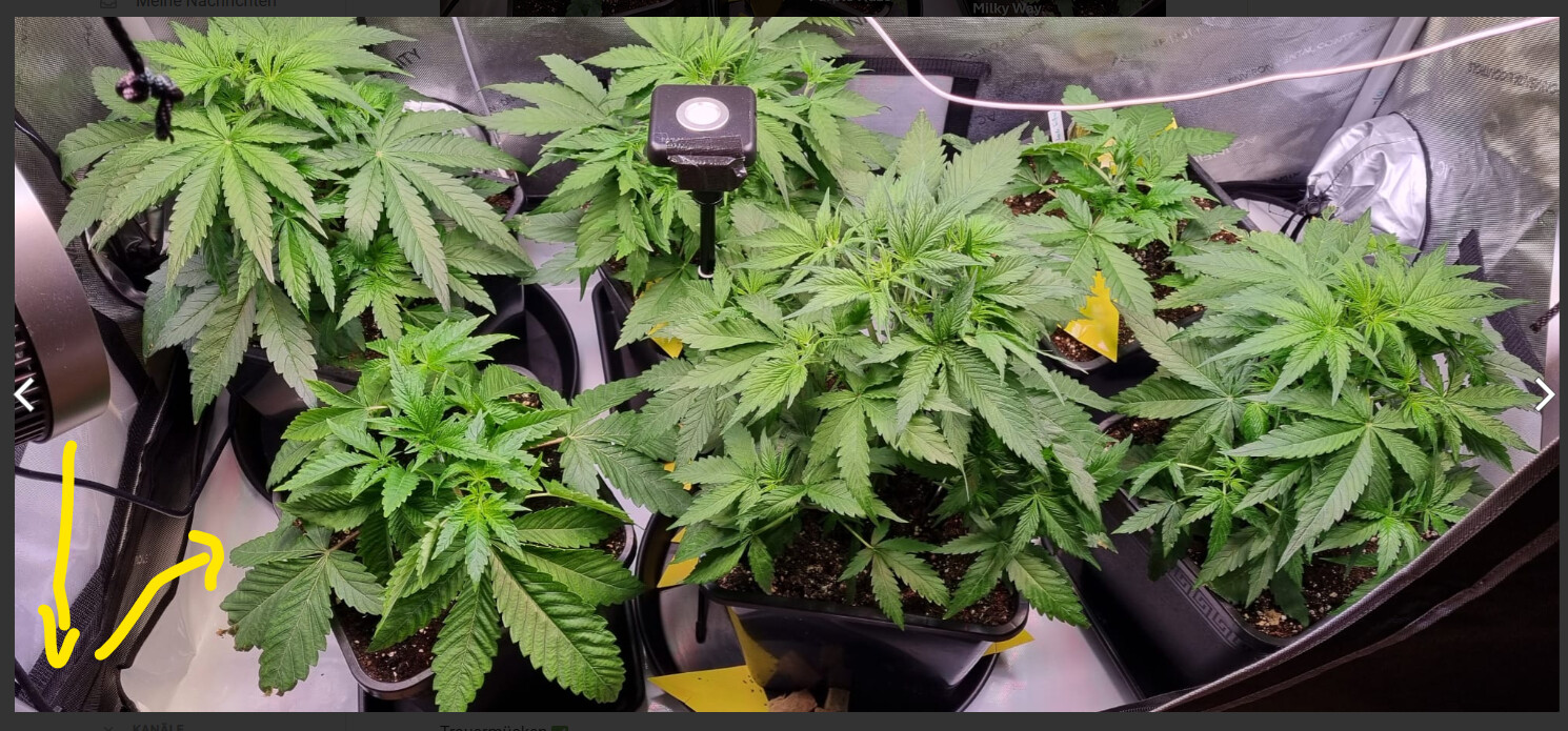 Die Ladies haben wieder einen ordentlichen Schub gemacht und sehen gut aus. Die Watermelon zeigt an den jüngsten 7F-Blättern ordentliche gelbe Spitzen. Muss man sehen, was das wird. Die Milky Way auch, aber weniger ausgeprägt. Heute gabs die 2. Dusche mit BoomBoomSpray.
