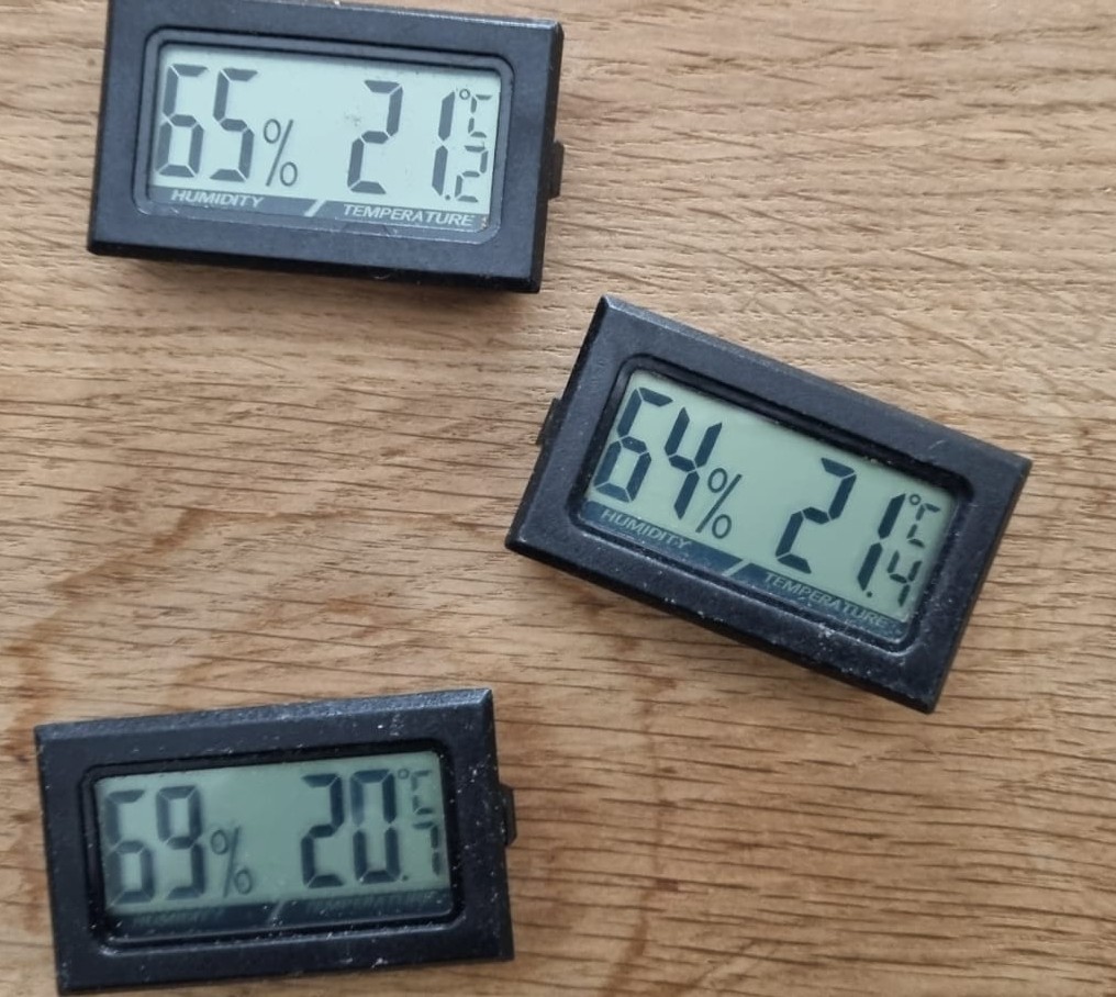 Ich glaube schon, dass man die Luft auf Bodenhöhe umwälzen sollte und hoffnungsvoll, damit auch feuchte Luft aus dem Bereich in Richtung Abluft transportiert. Ich habe nach 24h jetzt aber keine Änderung der Messwerte zu verzeichnen. Die kleinen Hygros auf Untersetzern, Topfrand und Zeltwand-Höhe Mitte Pflanze sind heute bei 75-79%, aber der Raum herum ist auch bei 64-69% und in der Sauna auch so bei 71-75%. Ich habe die Hygros fürs Foto gerade zusammengestellt. Wenn sie am gleichen Platz lägen, wären sie dichter zusammen.