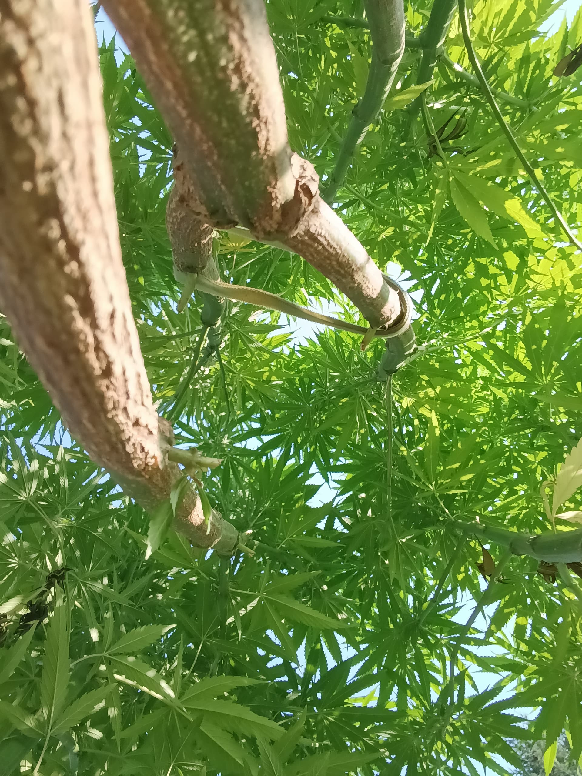 bei mir sind die austriebe eben so groß, das sie keine blüten bilden sondern direkt erst mal einen neuen trieb( im video oben sind es nur blütenansätze) .so spaltet sich der ast in mehrere triebe und ich habe halt nur entlang am hauptast alle fächerblätter weg gemacht bis auf die obersten 2.