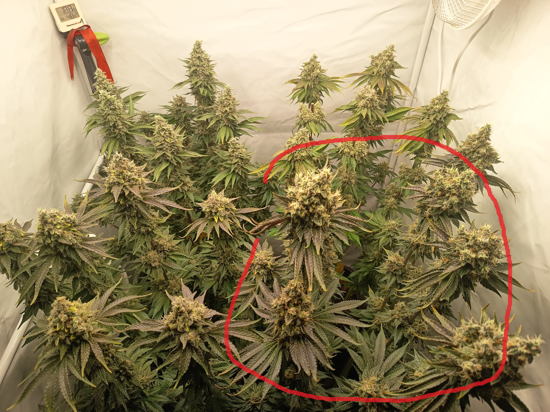 mit dem Zelt mit den Blütendolden. Meiner Meinung nach hast du zuwenig Äste die tragen, ich denke so gegen die 14 Triebe/Pflanze sollten auf 80x80 mit 4 Plänts machbar sein, wenn du in der Vegi etwas mehr Zeit gibst. Das gibt dann auch mehr kleinere Blüten, was das Schimmelrisiko stark reduziert… Du hast eher wenig Äste die fett tragen - würde ich so nicht machen.