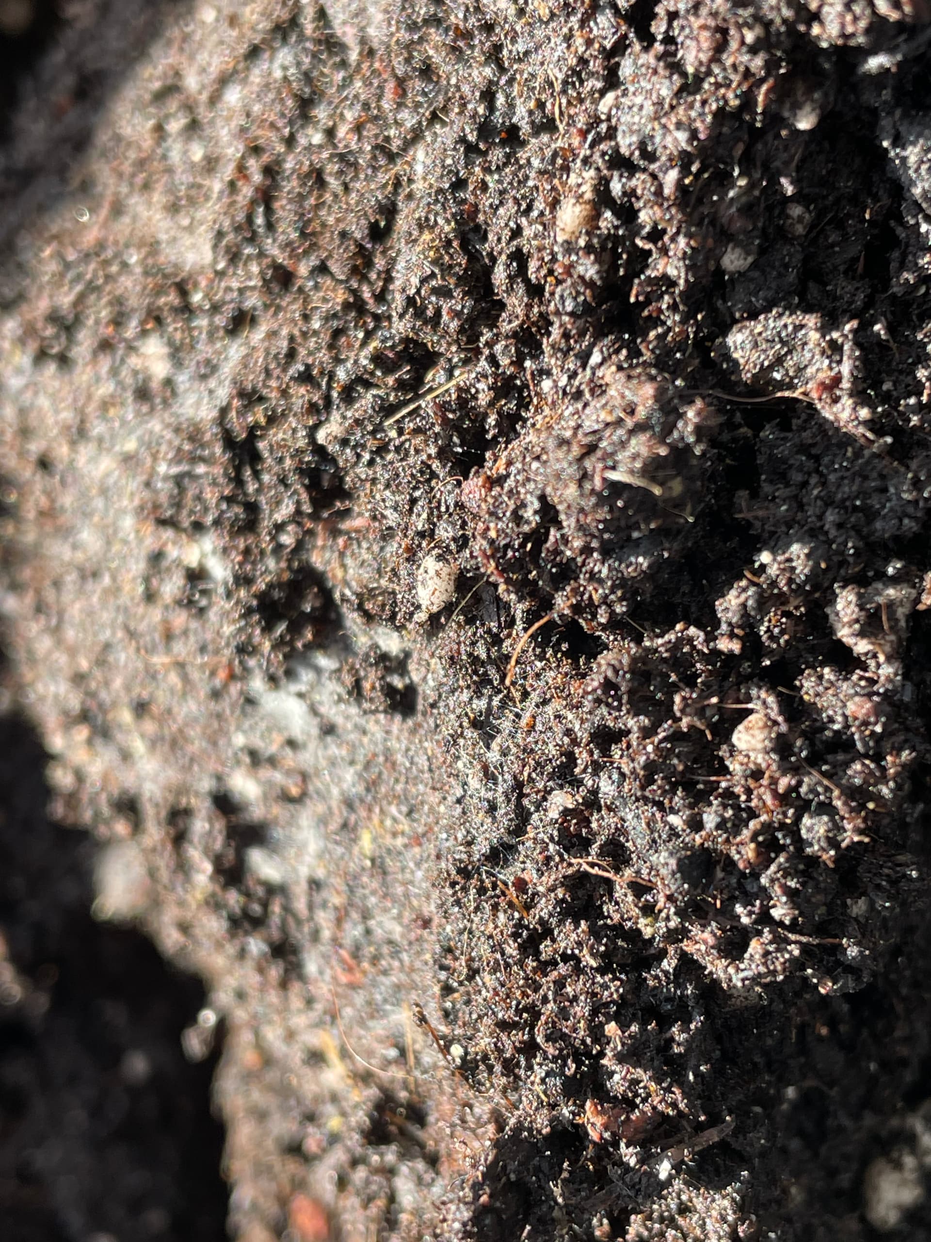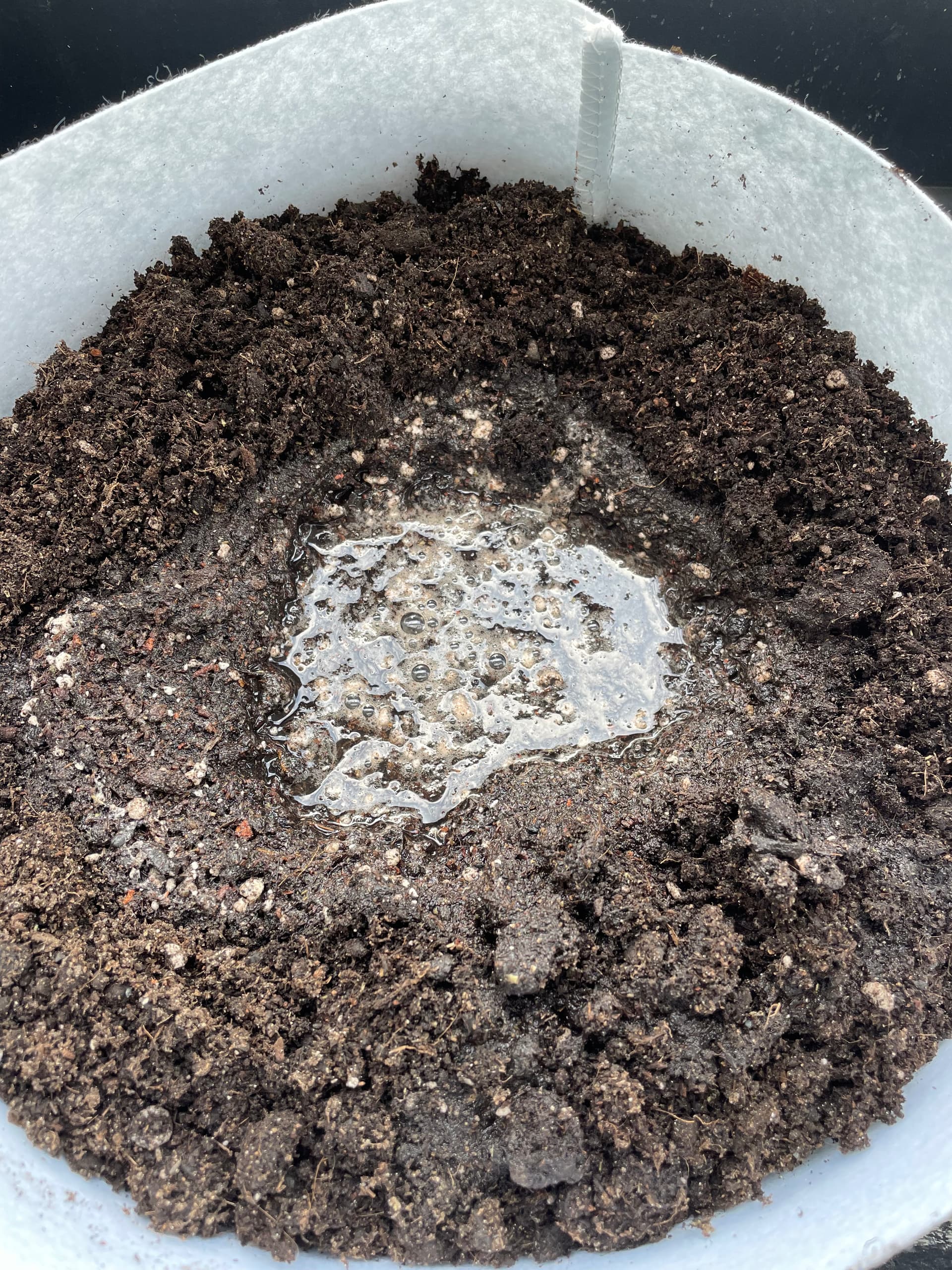 Das Mykorrhizageflecht war oben im Sack gut sichtbar - unten drin eher nicht. Dort kam es mir auch etwas trocken vor. Sicherheitshalber habe ich die Töpfe nebeneinander befüllt, damit nicht einer nur „unreife“ Erde abbekommt.