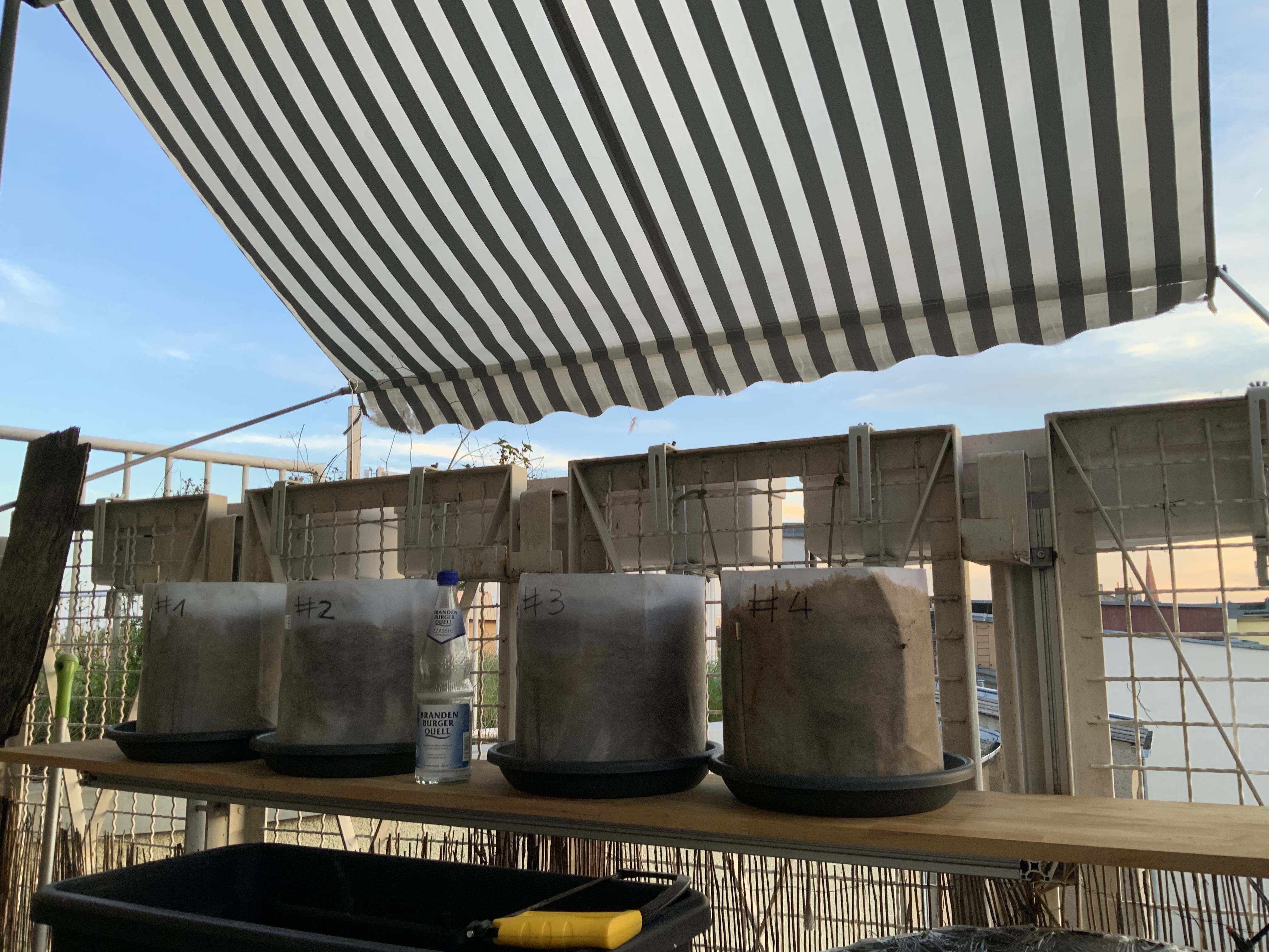 Als Pötte habe ich weiße 15L Stoffpötte, die sich in der Sonne nicht so sehr erwärmen.