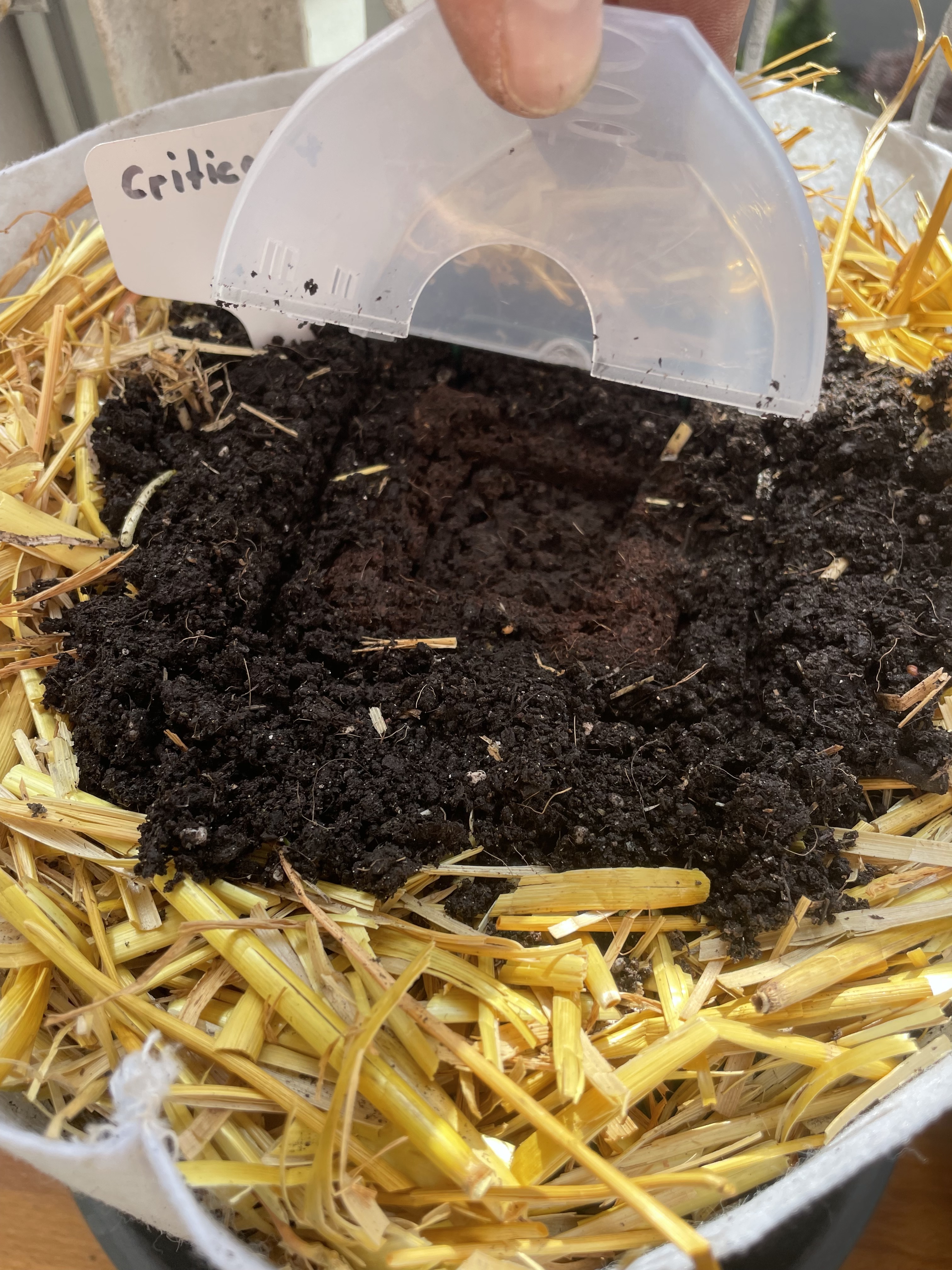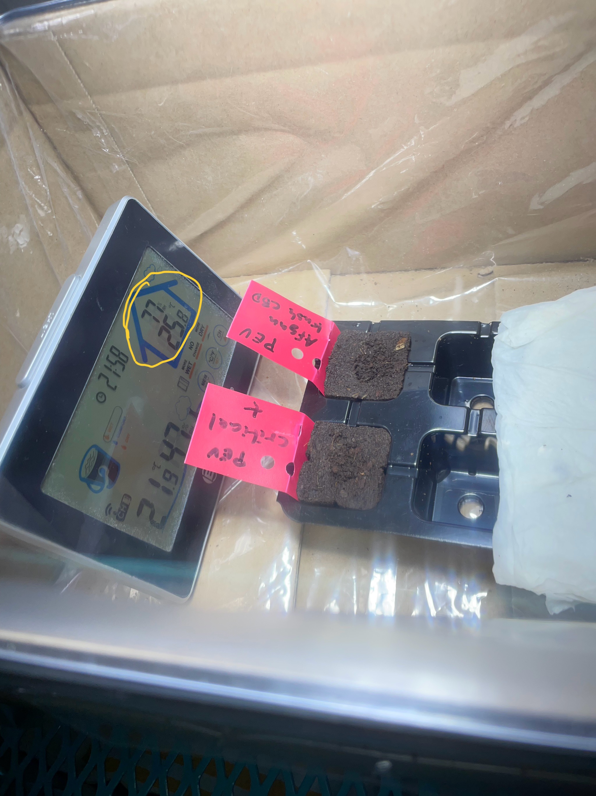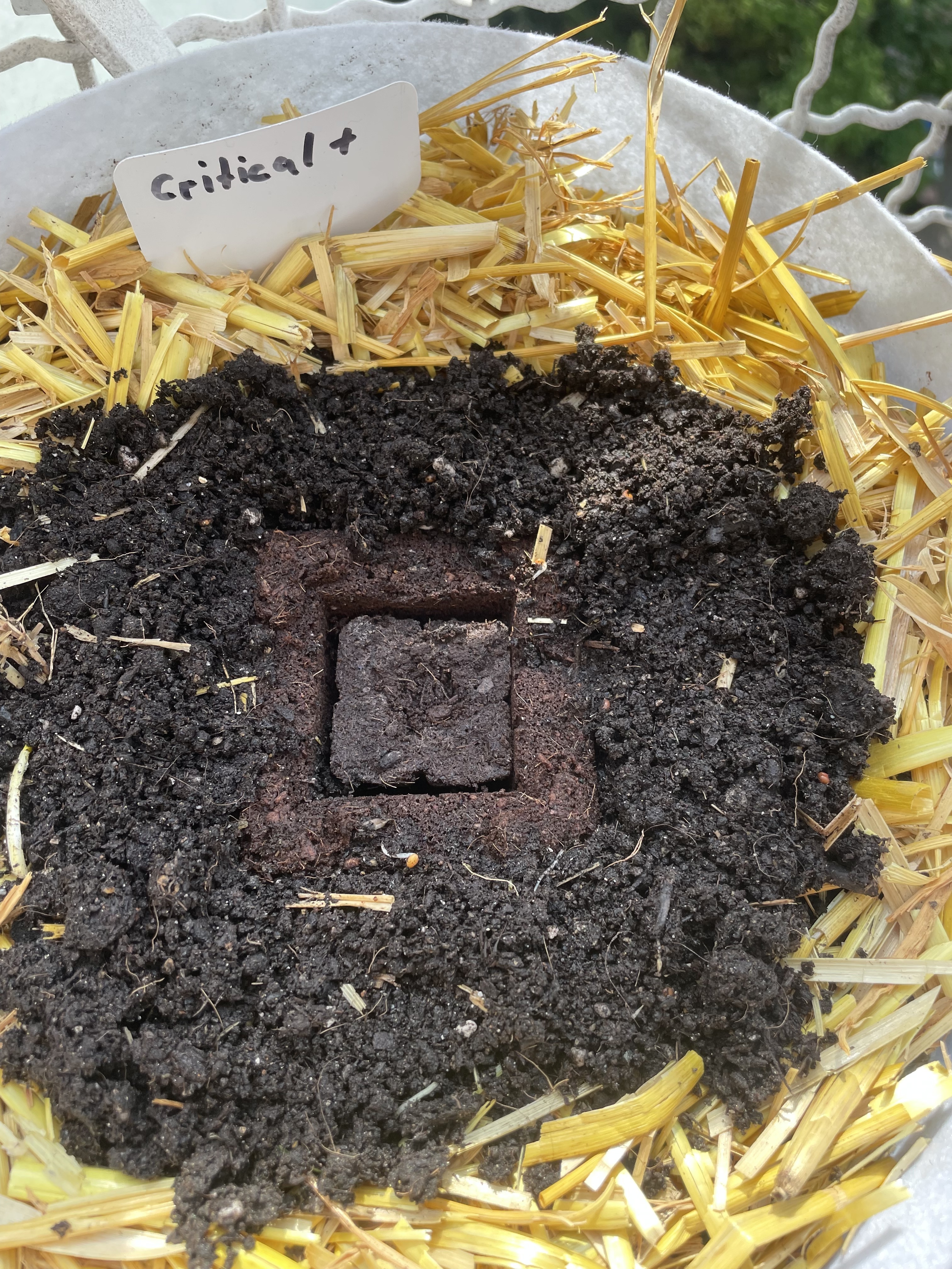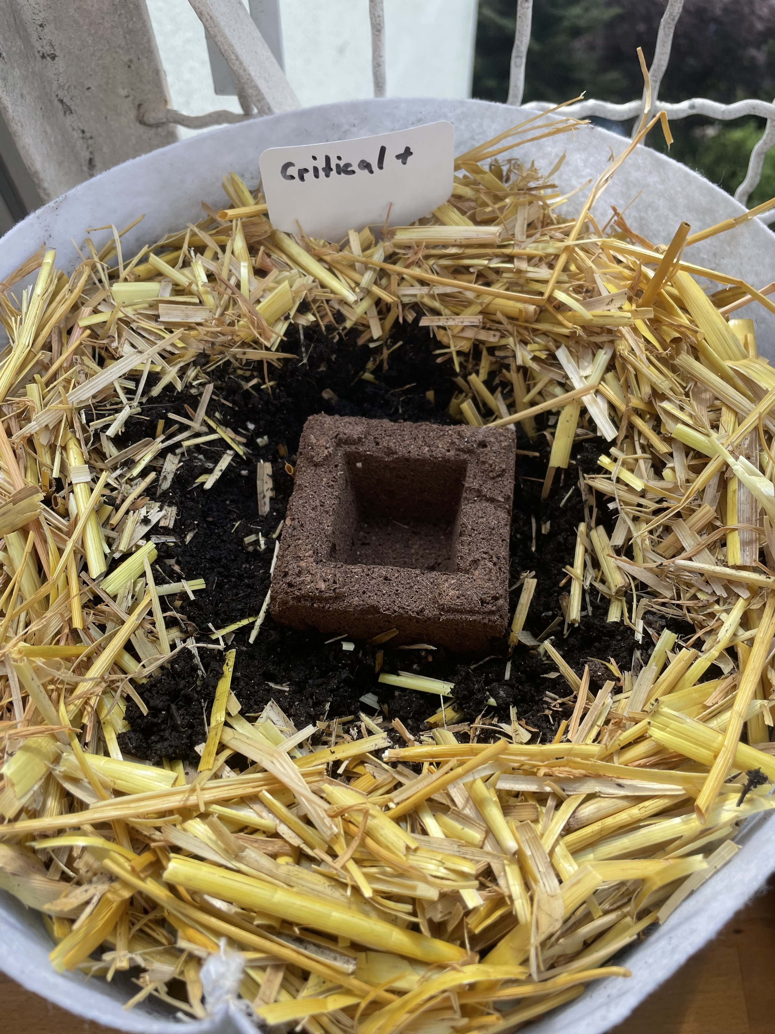 Ich habe mich entschieden die Samen rauszusetzen. Die nächsten 10 Tage wird es hinreichend warm sein und ich sorge mich, dass die Pflänzchen aus den Eazy-Plugs rauswachsen bevor ich sie umpflanze und vor lauter Stress die Blüte einleiten. Ich habe kleine Löcher gegraben für die 7,5cm Eazy-Bocks, welche die besamten Eazy-Plugs aufnehmen. Den Plug direkt in die gedüngte Erde war mir zu heiß. Unter Plug und Block jeweils etwas Wurzelpulver. Beim Umpflanzen ist der Plug mit der Afghan Kush gerissen, so konnte ich mal rein peeken: es sieht so aus, als würde der Samen gerade aufbrechen… glücklicherweise habe ich bei der Aktion nichts kaputt gemacht.