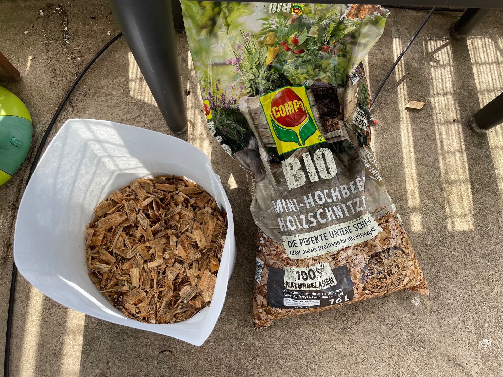 Als Drainage habe ich Hochbeet-Holzschnitzel 3-4cm hoch auf den Topfboden gegeben. Da war eine spontane Entscheidung im Gartenmarkt, statt den üblichen Blähtonkugeln. Erstens passte die Gebindegröße besser zu meinem Bedarf und zweitens gibt das nochmal Nahrung für die Living Soil (so zumindest meine Idee).