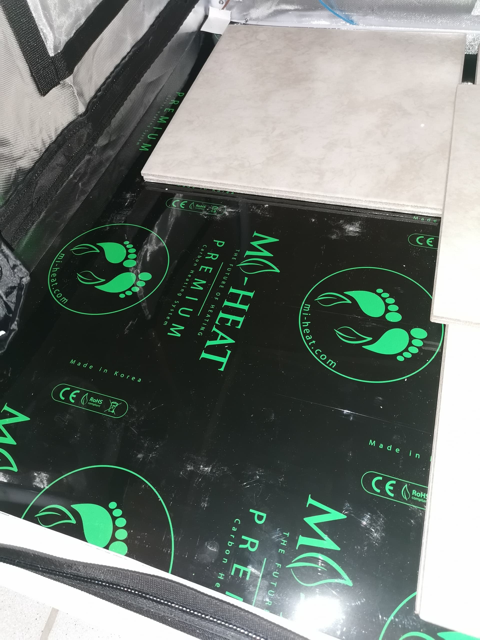 Die Infrarot Fußbodenheizung für die Ladys eingebaut, Fliesen als Puffer. Leistung 80 W. Langt locker für warme Füsse.