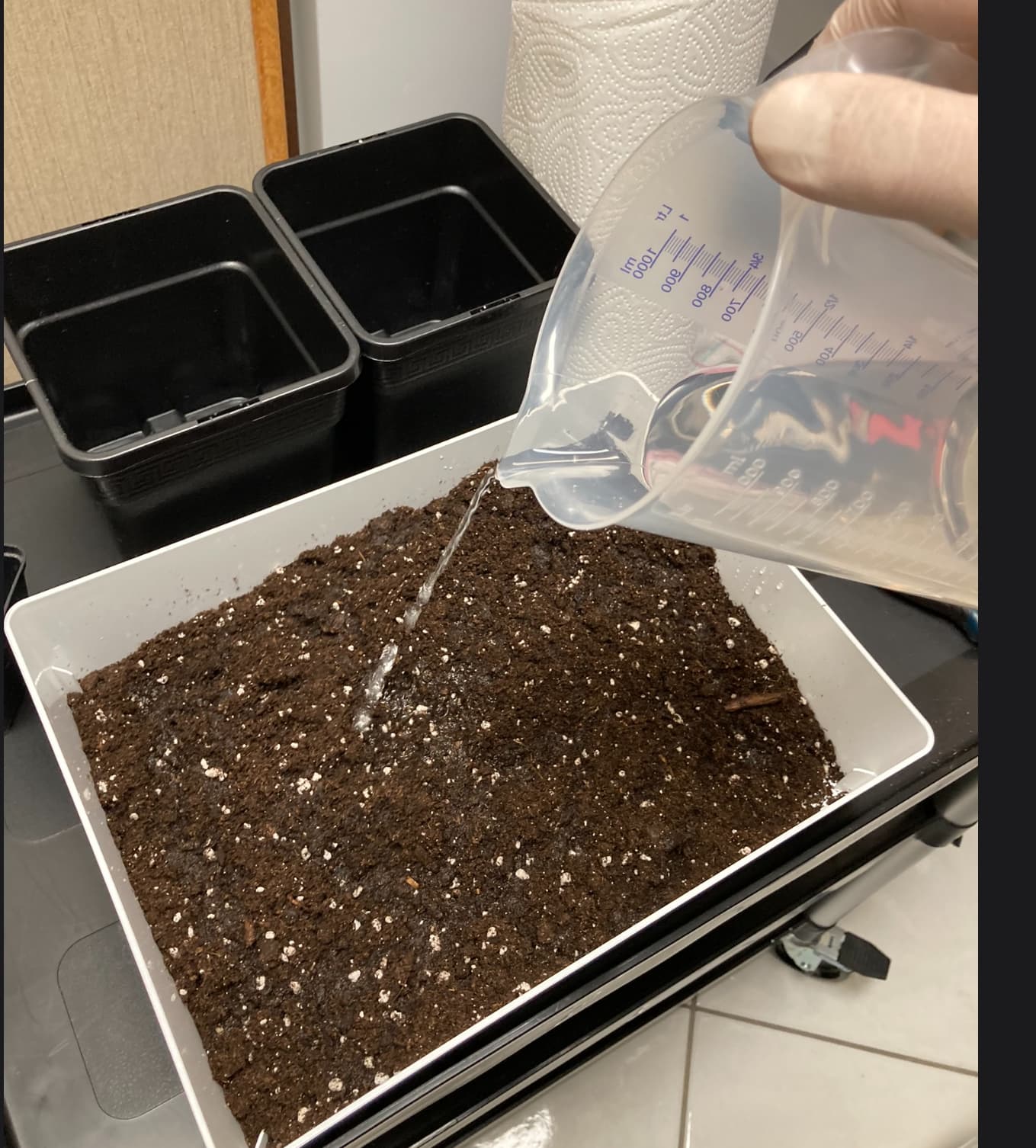 Da sie mir für den voll gedüngten Royalmix noch viel zu klein sind, nehme ich nochmal einen BioBizz Lightmix. Die Erde eben flux mit Gießwasser+BioBizz Root Juice vorbereitet