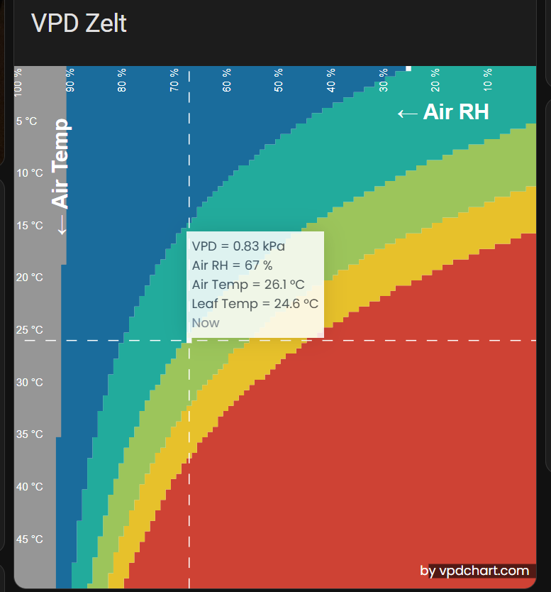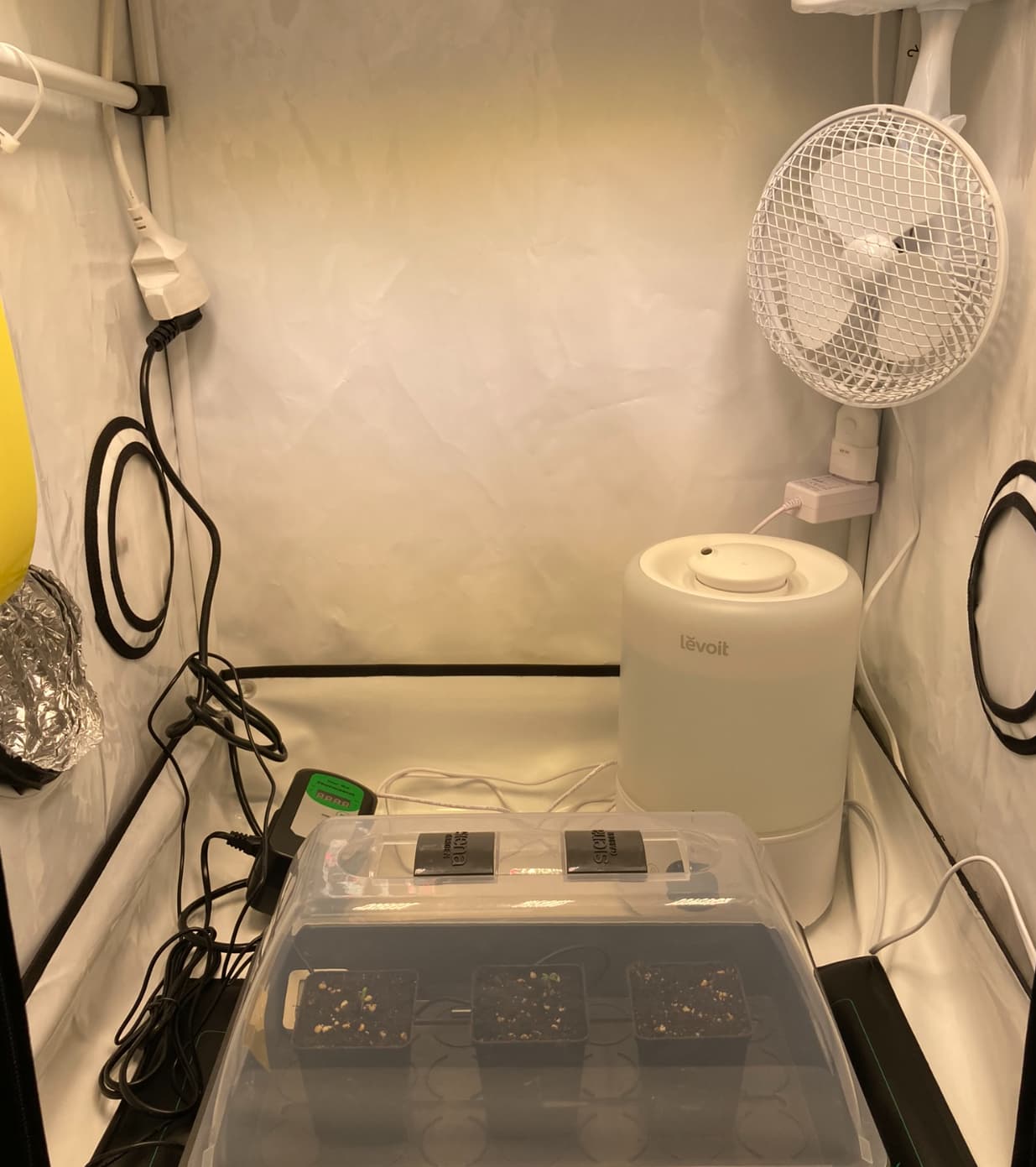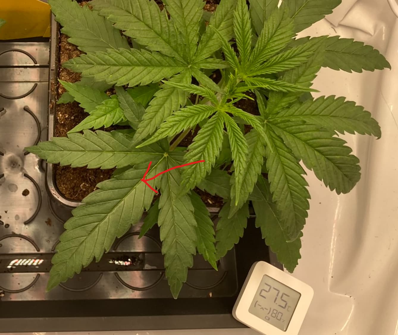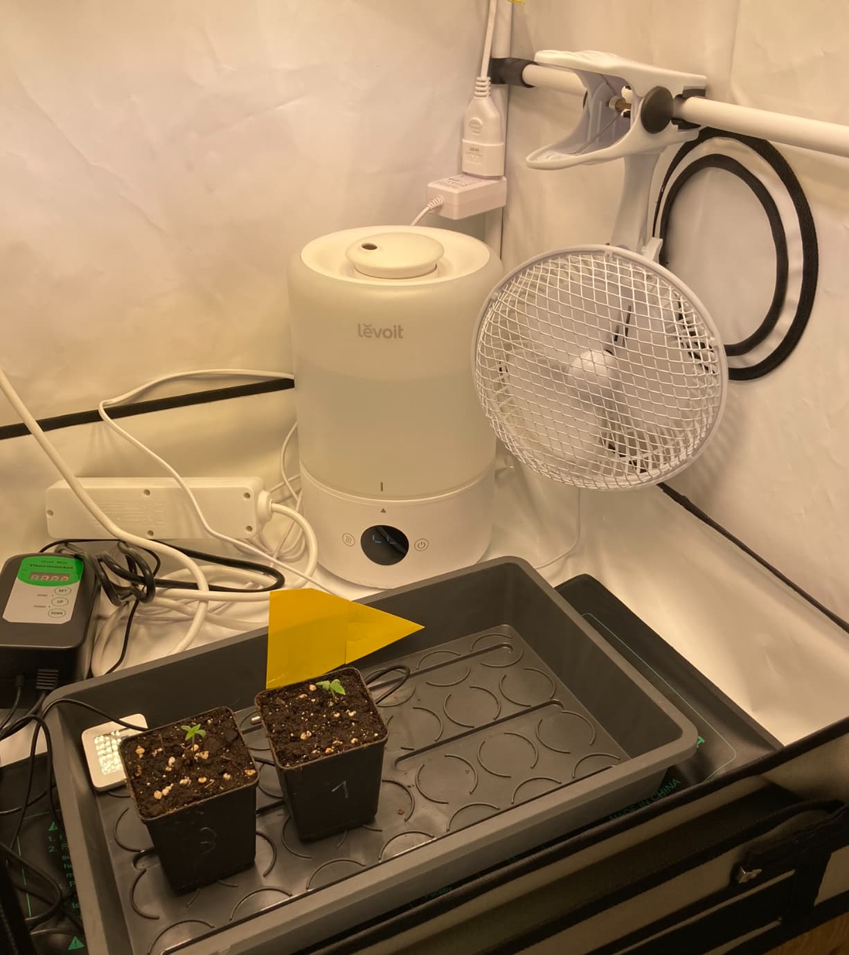 Licht läuft weiterhin 18/6 auf 40% gedimmt und hängt jetzt 53cm über den Pflanzen. Handy App „misst“ 300ppfd. Temperatur zwischen 24 und 26C°, RLF um die 60%.
