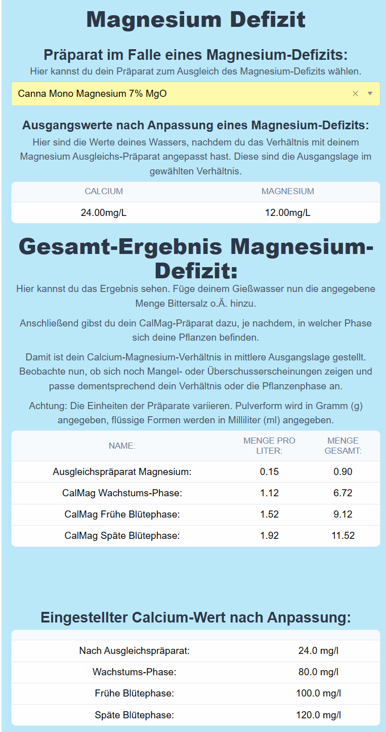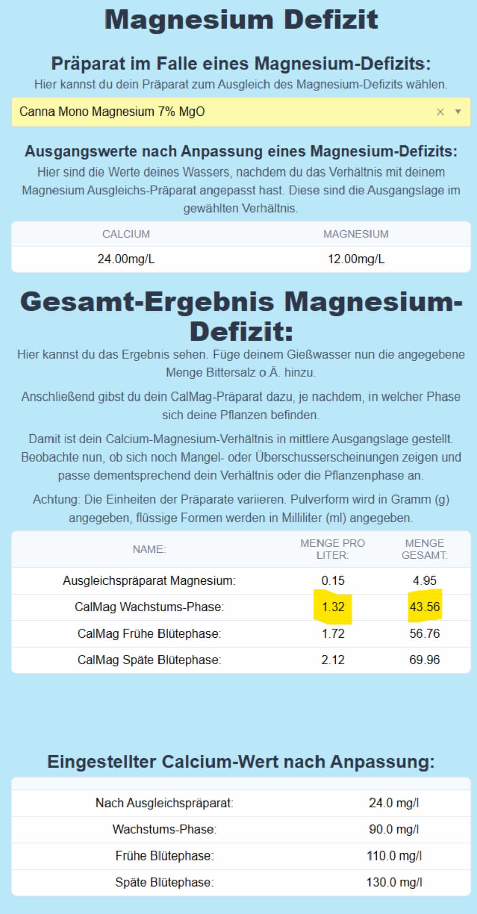Da du das so machst, kannst du die Wasserwerte eigentlich nicht als Grundlage für den CalMag Rechner nehmen. Wenn das Wasser so lange steht setzen sich vermutlich Cal und Mag am Boden deines Fasses ab und sind nicht mehr im Gießwasser.