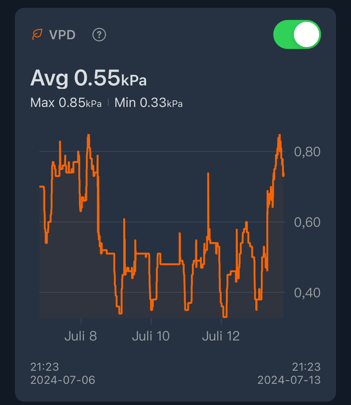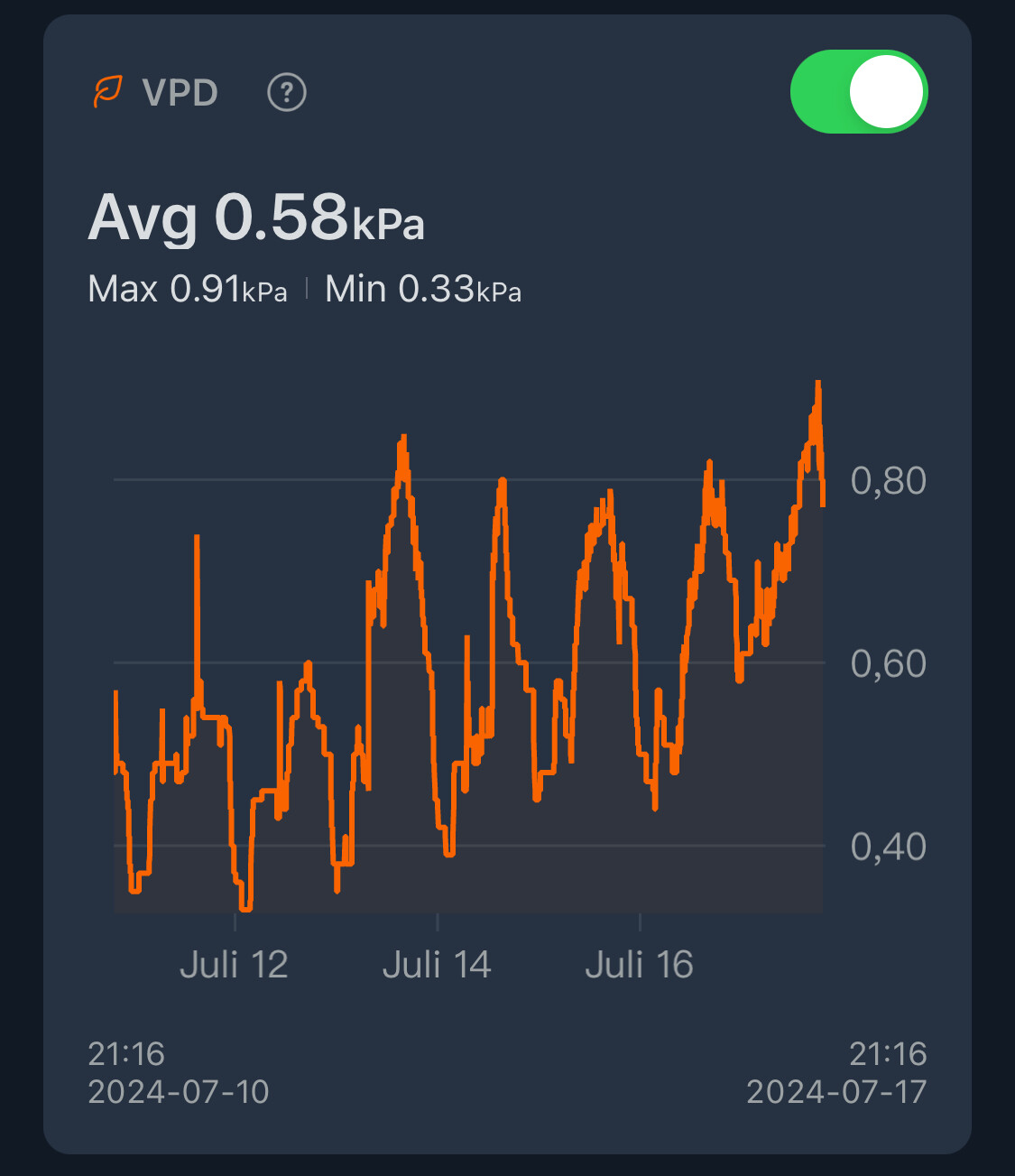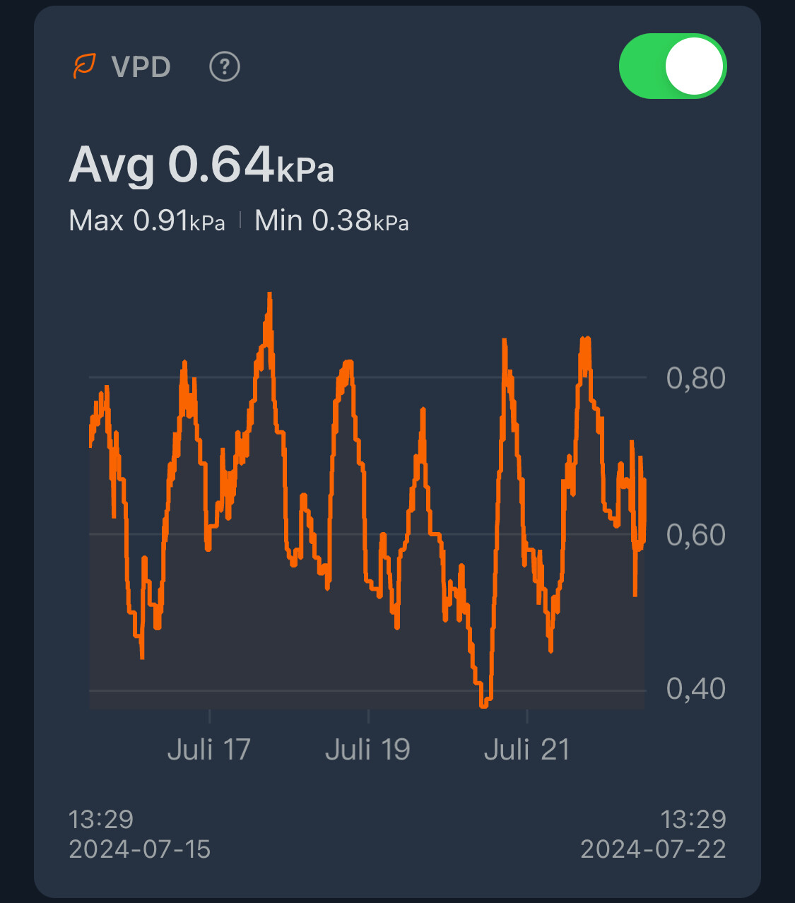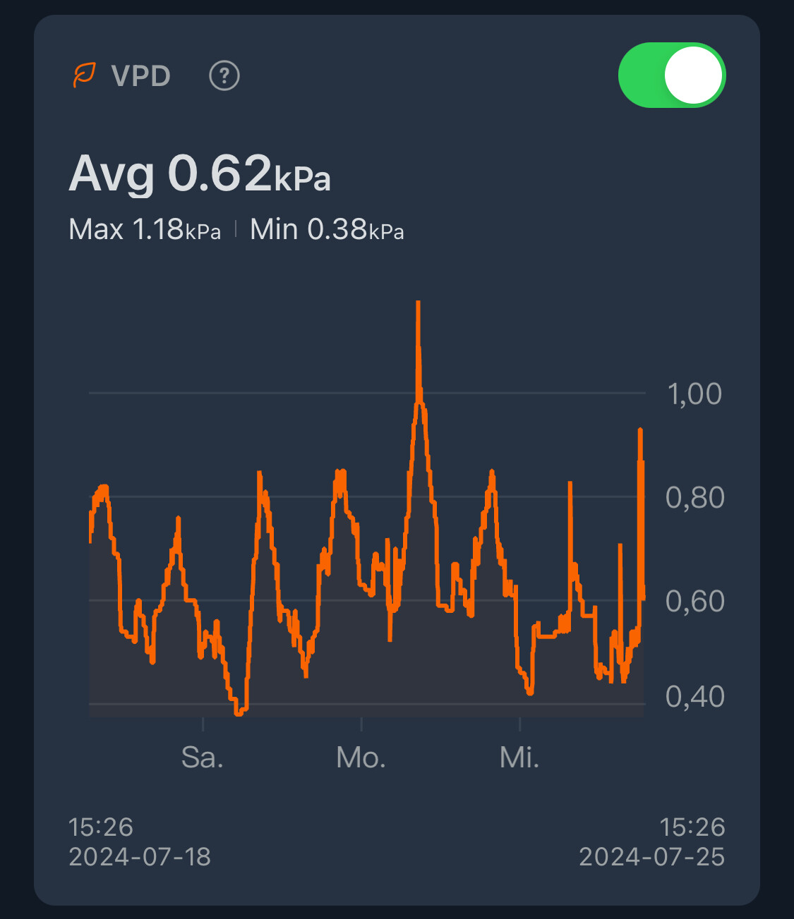 Der VPD Wert war die letzten Tage durch die hohe Feuchtigkeit recht niedrig, heute ist es mal wieder etwas hoch gegangen.
