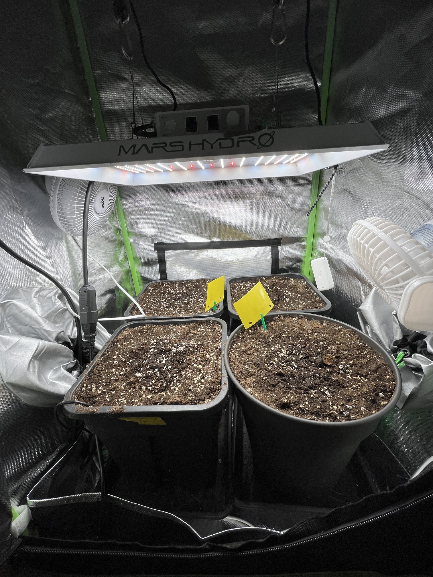 Das Zelt „läuft“ bereits im Vegi-Betrieb: 2 Umluft-Lüfter an, Abluft an und Lampe auf ca. 20% (24/0). Grund für die Lüfter ist die hohe Luftfeuchtigkeit. Ich möchte Schimmel auf der Erde gerne vermeiden. Die Erde halte ich mit einem Bestäuber feucht (ca. 2-3 mal am Tag).