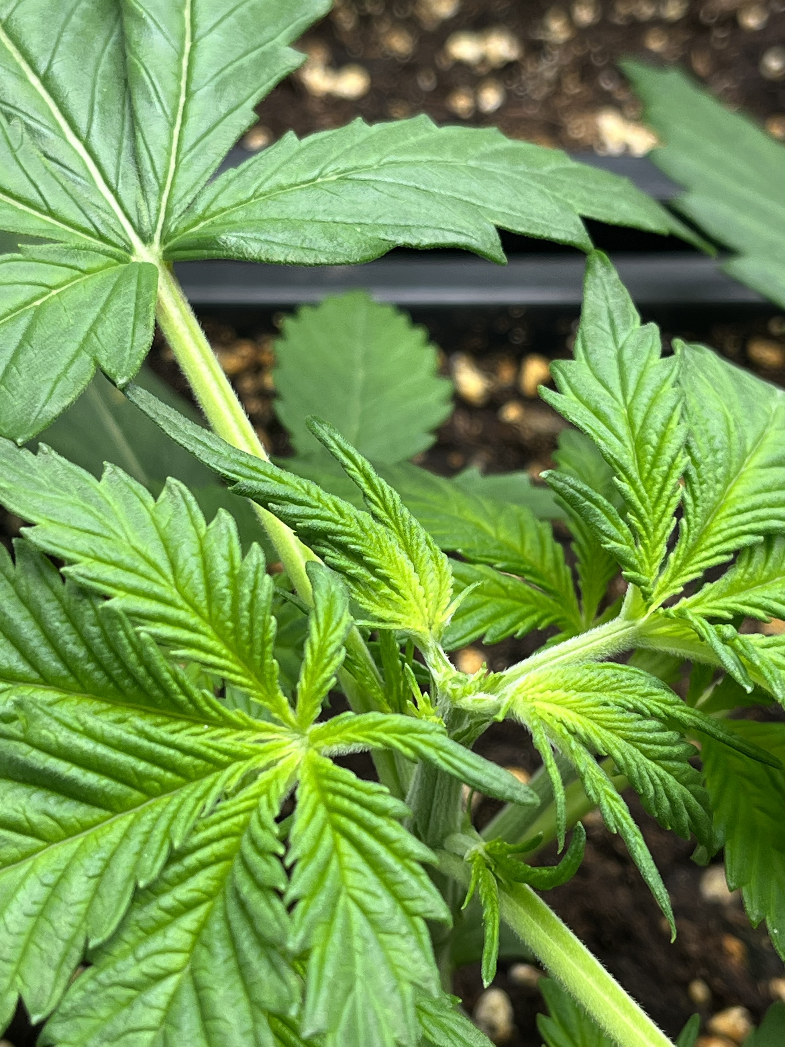 Ich vermute hier einen leichten Mangel durch den Lightmix *(Edit: bzw. durch den höheren Bedarf durch die Vorblüte)*. Die Biotabs sollten dem entgegenwirken sobald die Pflanze gut genug verwurzelt ist —> keine Sondermaßnahmen geplant