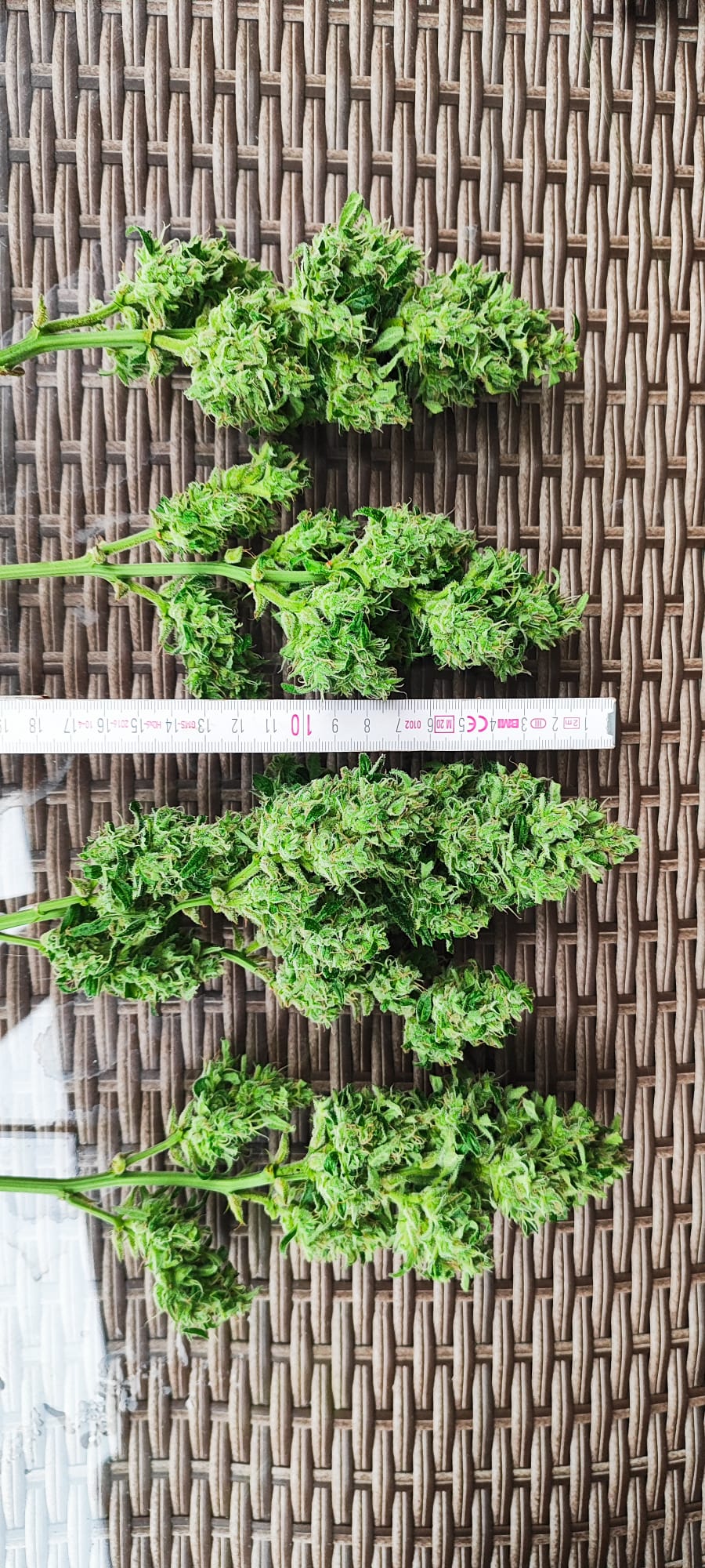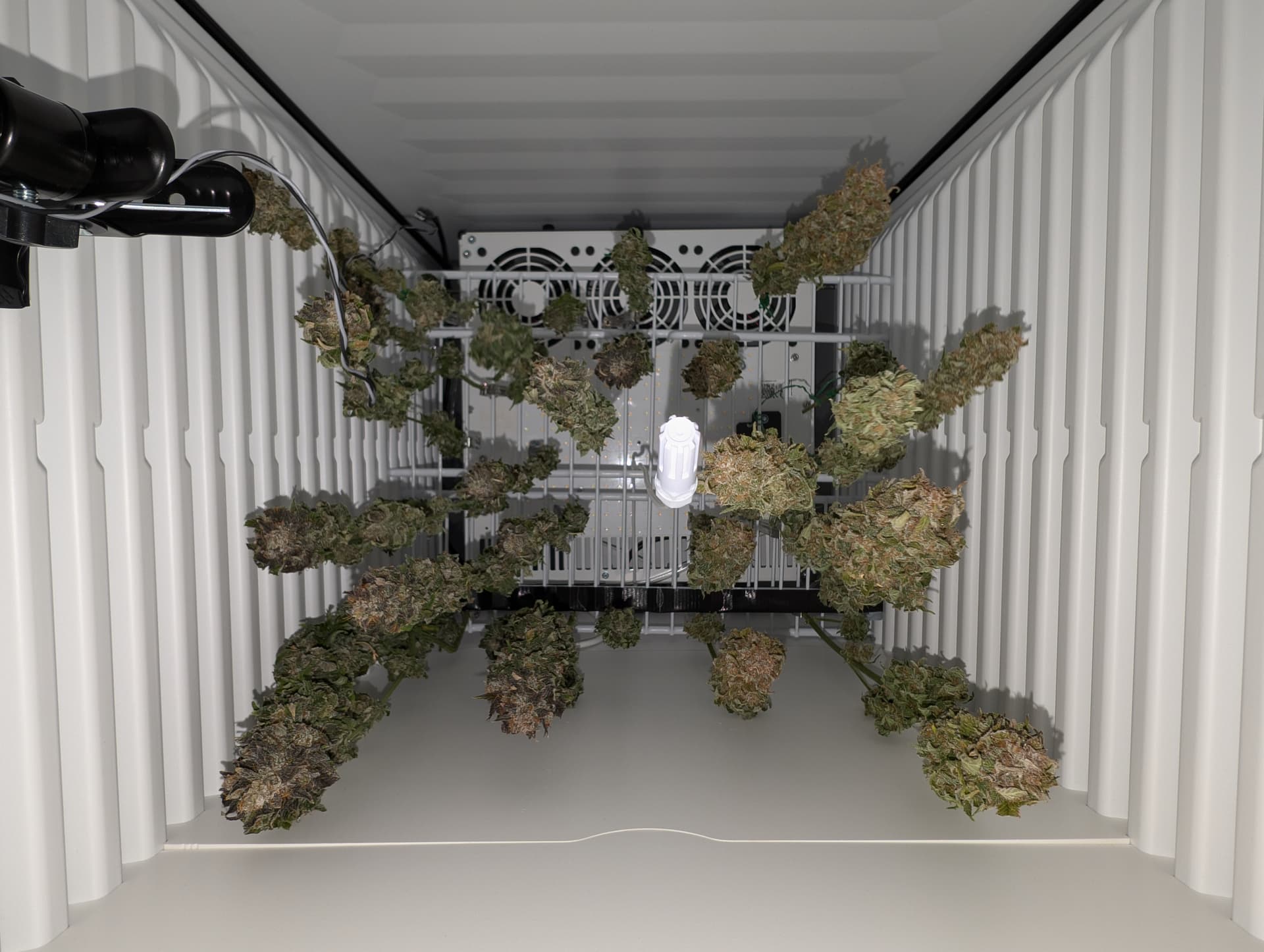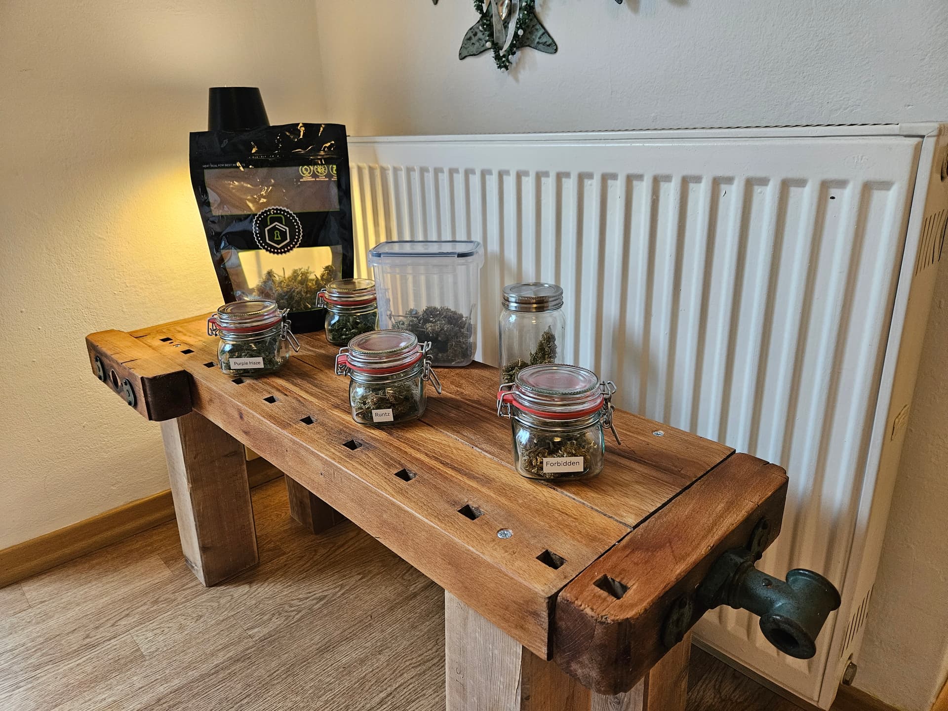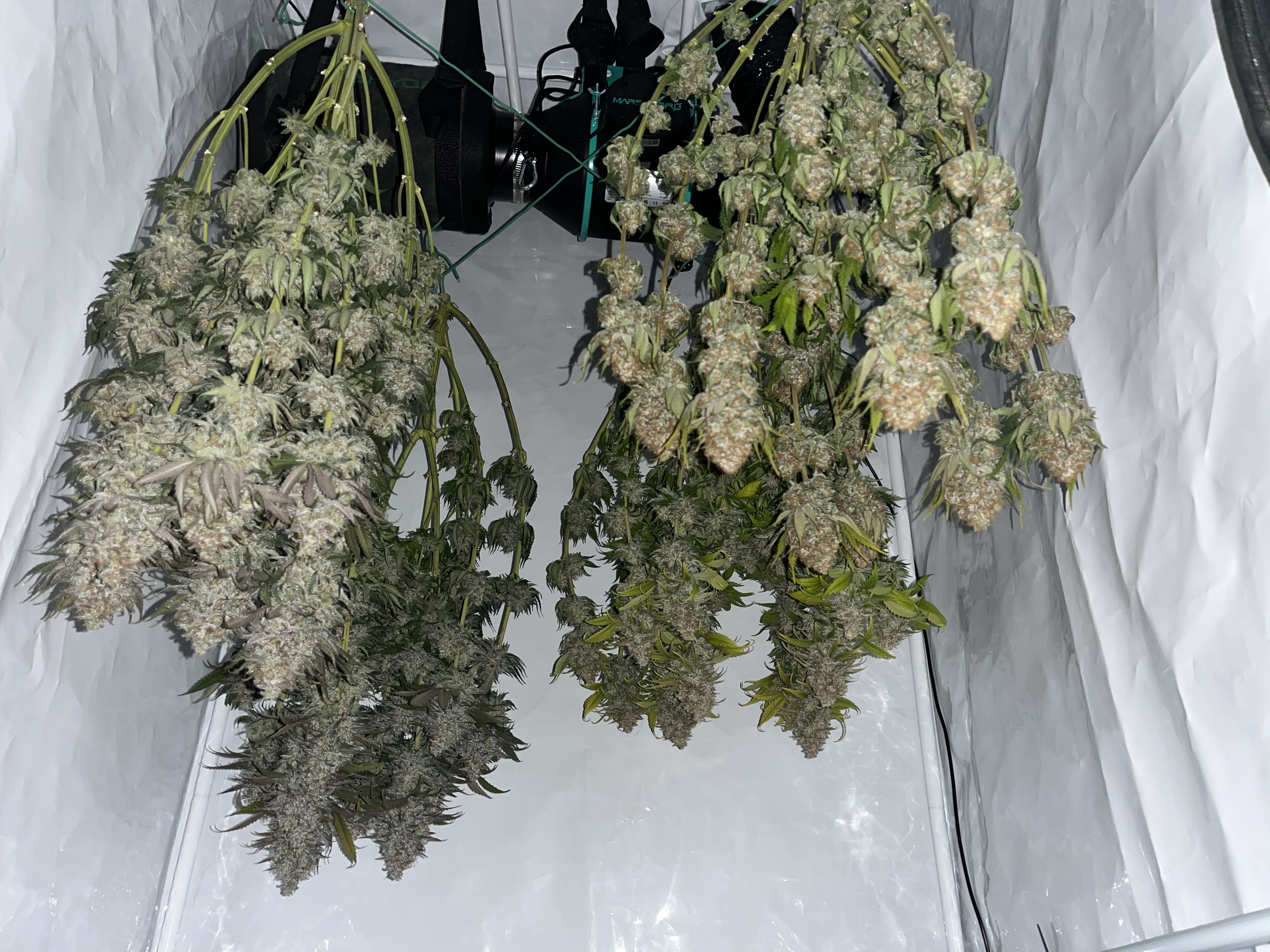 Die Ernte im KĂŒhlschrank mit Selbstauslöser von unten. Das ist Special Queen und eine mysteriöse Sorte die sich in der Packung verirrt hatte.